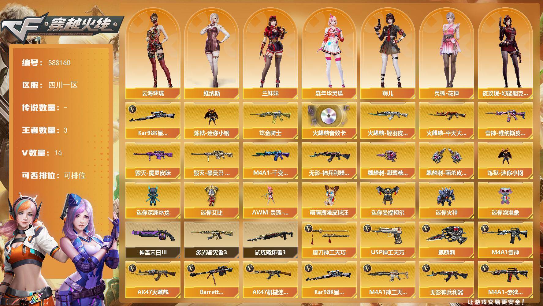 [17526653]四川一区-18V-3王者武器数-1炫金武器数 【人偶武器】:炼狱-迷你小钢,迷你泡泡象,AWM-灵狐-15周年嘉年华,迷你深渊冰龙,萌萌海滩皮球汪,迷你曼提柯尔,迷你火种,迷你艾比 【音效卡】:AK47-火麒麟音效卡 【皮肤】:雷神-维纳斯皮肤,火麒麟-轻羽皮肤,火麒麟-平天大圣,毁灭-魔灵皮肤,毁灭-黑曼巴 皮肤,M4A1-千变-孔明皮肤,无影-神兵利器 皮肤,麒麟刺-甜蜜糖果 皮肤,麒麟刺-萌杀皮肤 【挑战大师】:激光毁灭者III,试炼破坏者III,神圣爆裂者-末日III 【传说角色】:传说艾莉莎 【道具】:BS战队炫彩背包,云山科技背包,次元之矛-背包,虎牙炫彩背包,女皇终结者-魔龙之吻,救世主-黑桃战神,绿色巨人,灵魂忍者,迷雾幽灵,夺命之镰,防化服*3,金色流光-枪王排位*2,星辰流光-枪王排位,枪王排位28赛季金色流光,炽雪表情,动感闪耀表情,防弹头盔*3,防弹衣*3,C4工具钳*3,手雷包*3 【源级武器】:源·雷神,魂·雷神-神秘按键,魂·雷神-15周年嘉年华,魂·黑骑士-幻能朋克,魂·黑骑士-破浪10年,源·机械迷城,魂·龙血-锋芒破茧,M4A1-青龙-掌上穿越火线,源-金色蔷薇,源·玫瑰精灵,魂·英雄-湾区光枢,Barrett-极光-掌火,魂·毁灭-青帝,魂·毁灭-神秘黑洞*2,灵·Barrett-朱雀-炫光,加特林-炼狱-掌火,魂·修罗-15周年嘉年华,魂·修罗-迷彩,灵·天神-穹宇,魂·屠龙-惊鸿,灵·麒麟刺-穹宇 【英雄级武器】:AK47-火麒麟,M4A1-雷神,AK47-机械迷城,M4A1-神工天巧,无影-神兵利器,王者之势-觉醒版,QBZ-03-王者蔷薇-觉醒版,白虎之魄-觉醒版,机械迷城-穹宇,Barrett-毁灭,Kar98K-星神,USP-神工天巧,麒麟刺,唐刀-神工天巧,高爆手雷-神工天巧,闪光弹-神工天巧,烟雾弹-神工天巧,M4A1-赤狱骑士 【王者炫金武器】:炫金骑士 【热门武器】:Kar98K-星神,炼狱-迷你小钢 【角色】:云海玲珑,暗夜-X,暗夜审判,初恋灵狐,嘉年华灵狐,兰妹妹,灵狐-花神,灵狐者-X,龙儿-小淘气,曼陀罗-礼服,萌儿,潘多拉-甜心教官,斯沃特-X,铁骑荣耀,兔囡囡,维纳斯,雪莉杨-摸金校尉,夜玫瑰-幻能朋克,樱-战斗天使 【特殊枪械】: