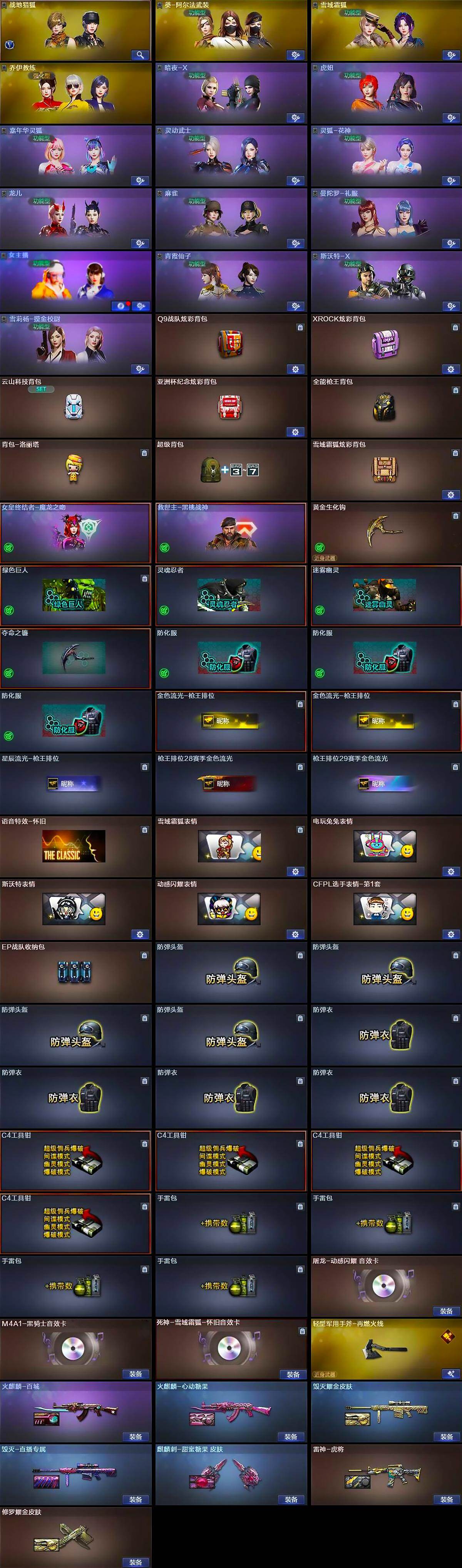 【道具】:Q9战队炫彩背包,XROCK炫彩背包,云山科技背包,亚洲杯纪念炫彩背包,全能枪王背包,背包-洛丽塔,超级背包,雪域霜狐炫彩背包,女皇终结者-魔龙之吻,救世主-黑桃战神,黄金生化钩,绿色巨人,灵魂忍者,迷雾幽灵,夺命之镰,防化服*3,金色流光-枪王排位*2,星辰流光-枪王排位,枪王排位28赛季金色流光,枪王排位29赛季金色流光,语音特效-怀旧,雪域霜狐表情,电玩兔兔表情,斯沃特表情,动感闪耀表情,CFPL选手表情-第1套,EP战队收纳包,防弹头盔*4,防弹衣*4,C4工具钳*4,手雷包*4