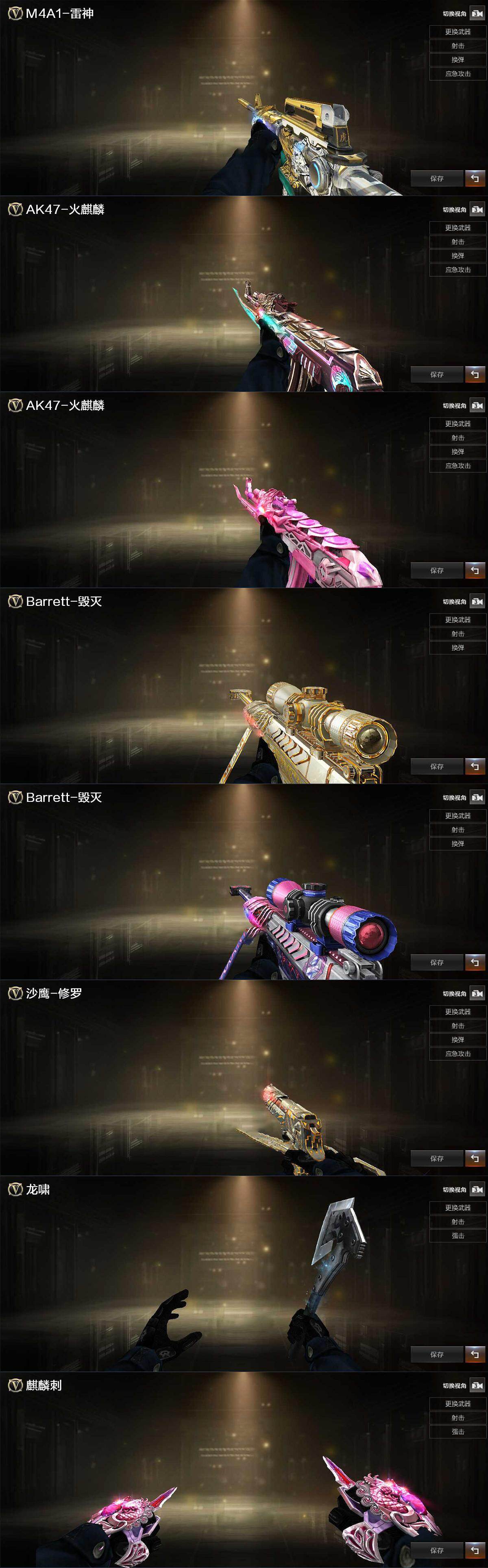 【源级武器】:源·火麒麟,魂·火麒麟-百城,源-黑龙,魂·雷神-诺拉,魂·雷神-维纳斯,魂·雷神-新春神龙,魂-雷神-萌杀,魂·雷神-15周年嘉年华,魂·雷神-萌柴,御·雷神-机甲刑天,御·雷神-烈虎,源·黑骑士*2,魂·黑骑士-现代金属,魂·黑骑士-幻能朋克,魂·黑骑士-破浪10年*2,魂·黑骑士-娜塔莉娅,源·天启*2,源·武圣,源·机械迷城,源·青龙,魂·HK417-朱雀-凤灵*2,灵·HK417-朱雀-甜蜜火力,源·HK417-朱雀,源-金色蔷薇*2,魂·QBZ03-金色蔷薇-萌杀,魂·9A91·烈火-电子连击,源·玫瑰精灵,源-极光*2,魂·裁决-新人王绿豆,魂·裁决-羽掣,魂·毁灭-青帝*2,魂·毁灭-神秘黑洞*2,御·毁灭-黑大圣,魂·Barrett-朱雀- 新春神龙,灵·Barrett-朱雀-炫光,魂·炼狱-月,加特林-炼狱-掌火,魂·修罗-15周年嘉年华,魂·修罗-神兵利器,源·天神*2,