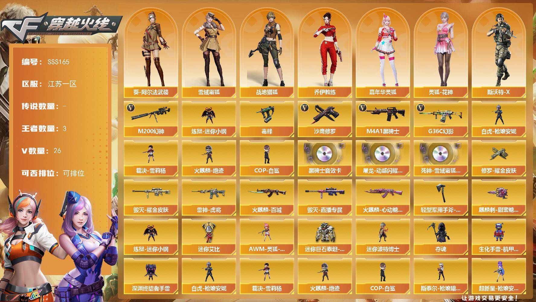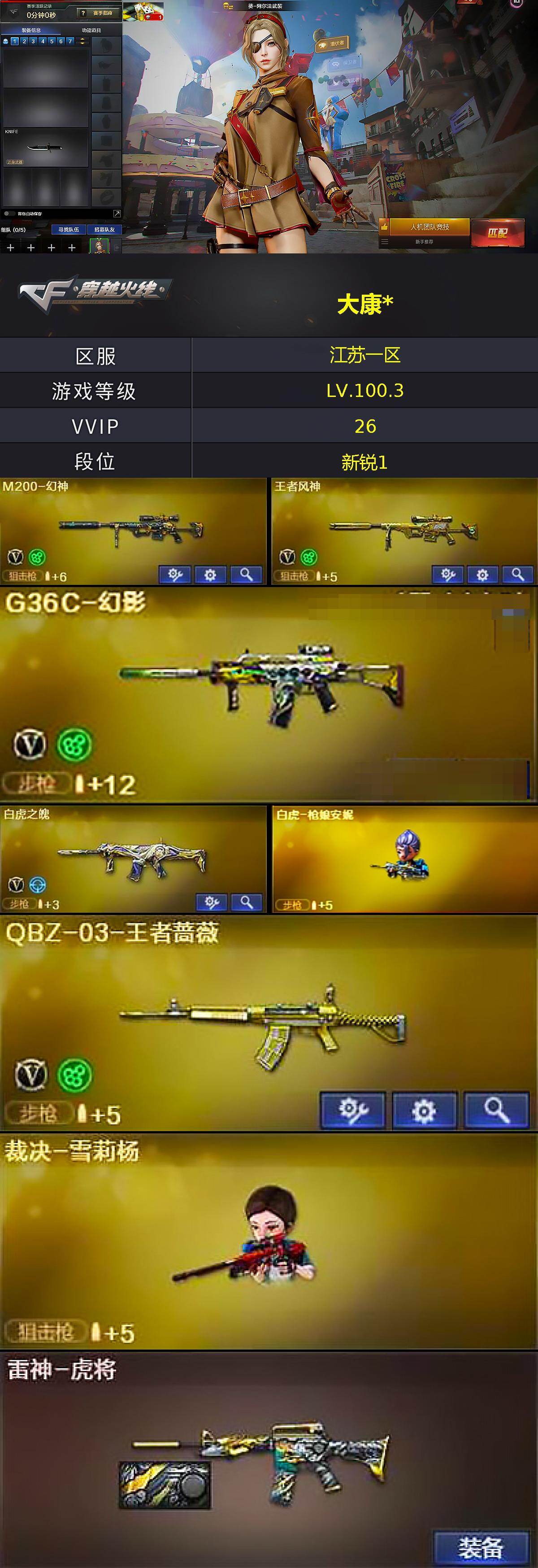 - [17002644]江苏一区-36V-2王者-0炫金 【传说武器】:传说梦魇 【传说角色】:传说星骇 【热门武器】:传说梦魇,QBZ03-金色蔷薇,Scar Light-白虎,M200-幻神,M4A1-黑骑士,加特林-炼狱,COP 357-幻灵 【王者炫金武器】:王者冰锋 【音效卡】:Barrett-极光音效卡,AWM-裁决音效卡 【皮肤】:幻神-纸灯龙皮肤,白虎-大汉风骨,金色蔷薇-纸灯龙皮肤,裁决-叶芒苍灵 皮肤,星神-璀璨皮肤,雷神-维纳斯皮肤,火麒麟-雷神*2,毁灭耀金皮肤,黑骑士-战神马超 【角色】:隼,王者-魅影,云海玲珑,暗夜-X,初恋灵狐,电竞少女,风暴女,嘉年华灵狐,兰-空鹰,猎狐者-追月,灵狐者-X,麻雀,潘多拉-X,青霞仙子,蜀雪,维纳斯,新娜塔莎,夜玫瑰-宠粉,影武者-X,游珑儿 【人偶武器】:白虎-迷你小艾,AWM-灵狐-15周年嘉年华,迷你牛牛,灵狐娃娃手雷 【暴走生化】:黑龙吞噬者 【挑战大师】:冰龙粉碎者-白马银枪,激光毁灭者III-白马银枪 【英雄级武器】:M4A1-雷神,M4A1-黑骑士,AK12-天启,AN94-超新星,Scar Light-白虎,无影-神兵利器,黑武士-锦绣游龙,QBZ03-金色蔷薇,QBZ-03-王者蔷薇-觉醒版,Barrett-毁灭,AWM-裁决,M200-幻神,加特林-炼狱,AA-12-雷霆,COP 357-幻灵,幻灵之锋*3,擎天-云海游龙,高爆手雷-幻灵*5,手雷-云海游龙,闪光弹-幻灵*5,烟雾弹-幻灵*5 【道具】:冰冰企鹅背包,绿色巨人,夺命之镰,防化服*2,金色流光-枪王排位*2,星辰流光-枪王排位,枪王排位28赛季金色流光,云海游龙表情,防弹头盔*2,防弹衣*2,C4工具钳*2,手雷包*2 【特殊枪械】:1白虎,1黑骑士,1炼狱