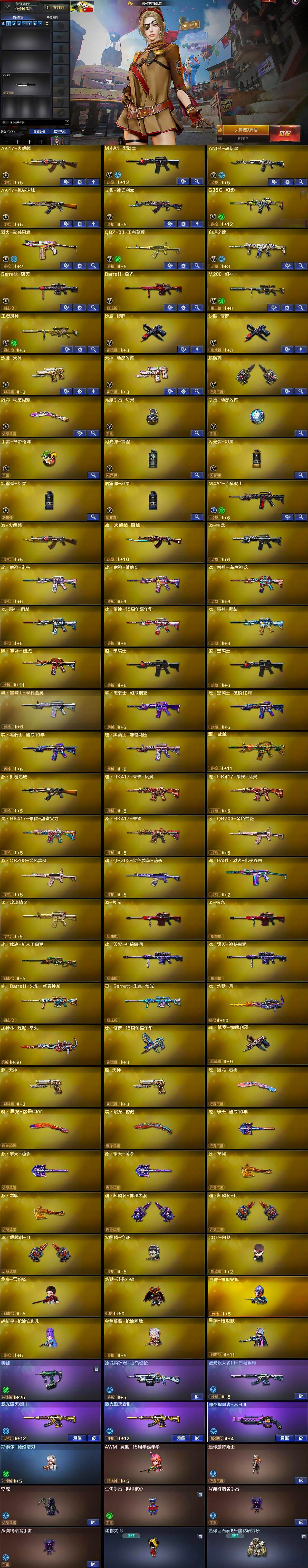 【人偶武器】:火麒麟-绝迹,COP-白鲨,裁决-雪莉杨,炼狱-迷你小钢,白虎-枪娘安妮,超新星-枪娘安琪儿,金色蔷薇-枪娘阿敏,星神-枪娘默,斯泰尔-枪娘暗刃,AWM-灵狐-15周年嘉年华,迷你波特博士,夺魂,生化手雷-机甲核心,深渊终结者手雷*2,迷你艾比,迷你巨石泰坦-魔花研究所