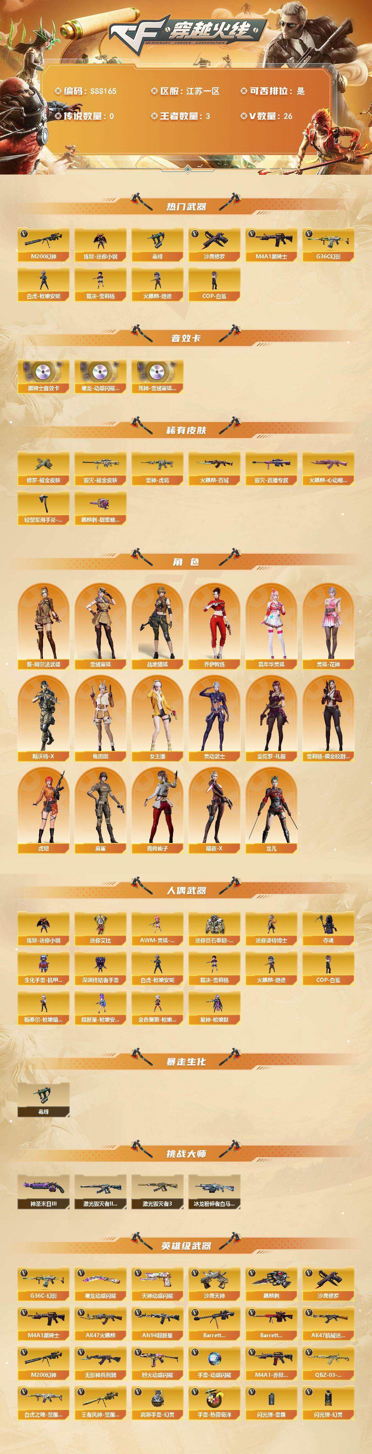 [17527180]江苏一区-27V-3王者武器数-0炫金武器数 【人偶武器】:火麒麟-绝迹,COP-白鲨,裁决-雪莉杨,炼狱-迷你小钢,白虎-枪娘安妮,超新星-枪娘安琪儿,金色蔷薇-枪娘阿敏,星神-枪娘默,斯泰尔-枪娘暗刃,AWM-灵狐-15周年嘉年华,迷你波特博士,夺魂,生化手雷-机甲核心,深渊终结者手雷*2,迷你艾比,迷你巨石泰坦-魔花研究所 【音效卡】:屠龙-动感闪耀 音效卡,M4A1-黑骑士音效卡,死神-雪域霜狐-怀旧音效卡 【皮肤】:雷神-虎将,火麒麟-百城,火麒麟-心动糖果,毁灭耀金皮肤,毁灭-直播专属,修罗耀金皮肤,轻型军用手斧-再燃火线,麒麟刺-甜蜜糖果 皮肤 【挑战大师】:冰龙粉碎者-白马银枪,激光毁灭者III-白马银枪,激光毁灭者III*2,神圣爆裂者-末日III 【道具】:Q9战队炫彩背包,XROCK炫彩背包,云山科技背包,亚洲杯纪念炫彩背包,全能枪王背包,背包-洛丽塔,超级背包,雪域霜狐炫彩背包,女皇终结者-魔龙之吻,救世主-黑桃战神,黄金生化钩,绿色巨人,灵魂忍者,迷雾幽灵,夺命之镰,防化服*3,金色流光-枪王排位*2,星辰流光-枪王排位,枪王排位28赛季金色流光,枪王排位29赛季金色流光,语音特效-怀旧,雪域霜狐表情,电玩兔兔表情,斯沃特表情,动感闪耀表情,CFPL选手表情-第1套,EP战队收纳包,防弹头盔*4,防弹衣*4,C4工具钳*4,手雷包*4 【源级武器】:源·火麒麟,魂·火麒麟-百城,源-黑龙,魂·雷神-诺拉,魂·雷神-维纳斯,魂·雷神-新春神龙,魂-雷神-萌杀,魂·雷神-15周年嘉年华,魂·雷神-萌柴,御·雷神-机甲刑天,御·雷神-烈虎,源·黑骑士*2,魂·黑骑士-现代金属,魂·黑骑士-幻能朋克,魂·黑骑士-破浪10年*2,魂·黑骑士-娜塔莉娅,源·天启*2,源·武圣,源·机械迷城,源·青龙,魂·HK417-朱雀-凤灵*2,灵·HK417-朱雀-甜蜜火力,源·HK417-朱雀,源-金色蔷薇*2,魂·QBZ03-金色蔷薇-萌杀,魂·9A91·烈火-电子连击,源·玫瑰精灵,源-极光*2,魂·裁决-新人王绿豆,魂·裁决-羽掣,魂·毁灭-青帝*2,魂·毁灭-神秘黑洞*2,御·毁灭-黑大圣,魂·Barrett-朱雀- 新春神龙,灵·Barrett-朱雀-炫光,魂·炼狱-月,加特林-炼狱-掌火,魂·修罗-15周年嘉年华,魂·修罗-神兵利器,源·天神*2,