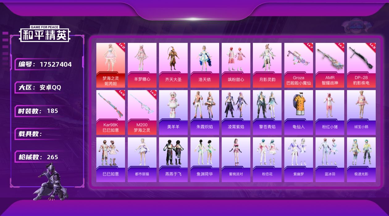 [17527404]安卓 手Q-1神装-5粉装-8特效枪-0载具-7粉色飞行器-86223热力值-14王牌印记-185套装-265枪皮