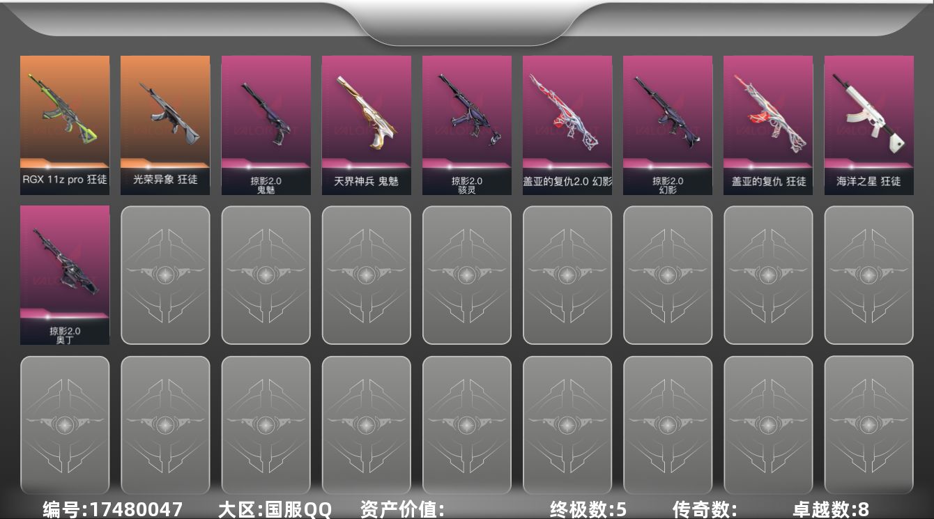 [17480047]【套装】:掠影//2.0套装 【英雄】:炼狱,暮蝶,壹决,捷风,幽影,不死鸟,贤者,猎枭,芮娜,奇乐,尚勃勒,霓虹,斯凯,盖可,黑梦,钢锁 【近战 武器】:近战武器-影钩 【狂徒】:狂徒-RGX 11z Pro,狂徒-光荣异象,狂徒-盖亚的复仇,狂徒-海洋之星 【幻影】:幻影-盖亚的复仇//2.0,幻影-掠影//2.0 【奥丁】:奥丁-掠影//2.0 【骇灵】:骇灵-掠影//2.0 【鬼魅】:鬼魅-天界神兵,鬼魅-掠影//2.0 【卡面】:树懒大作战 卡面,Clutch 卡面,无畏契约GO!第一卷:芮娜 卡面,无畏契约GO!第一卷:零 卡面,无垠星环 卡面,《双城之战》金克丝 卡面,无畏契约GO!第一卷:贤者 卡面,代号红色 卡面,新兵报到 卡面,V契约 卡面,无畏契约 卡面 【喷漆】:买装还是存钱 喷漆,关门放狗 喷漆,无畏契约GO!第一卷:芮娜 喷漆,无畏契约GO!第一卷:零 喷漆,放下武器 喷漆,胜利属于无畏契约 喷漆,GLHF 喷漆,无畏契约 喷漆 【挂饰】:无畏契约GO!第一卷 芮娜 挂饰,无畏契约GO!第一卷 零 挂饰,薰衣草之心 挂饰,动力机箱 挂饰,天外飞客 挂饰,《双城之战》魄罗 挂饰,无畏契约 纪念币 挂饰