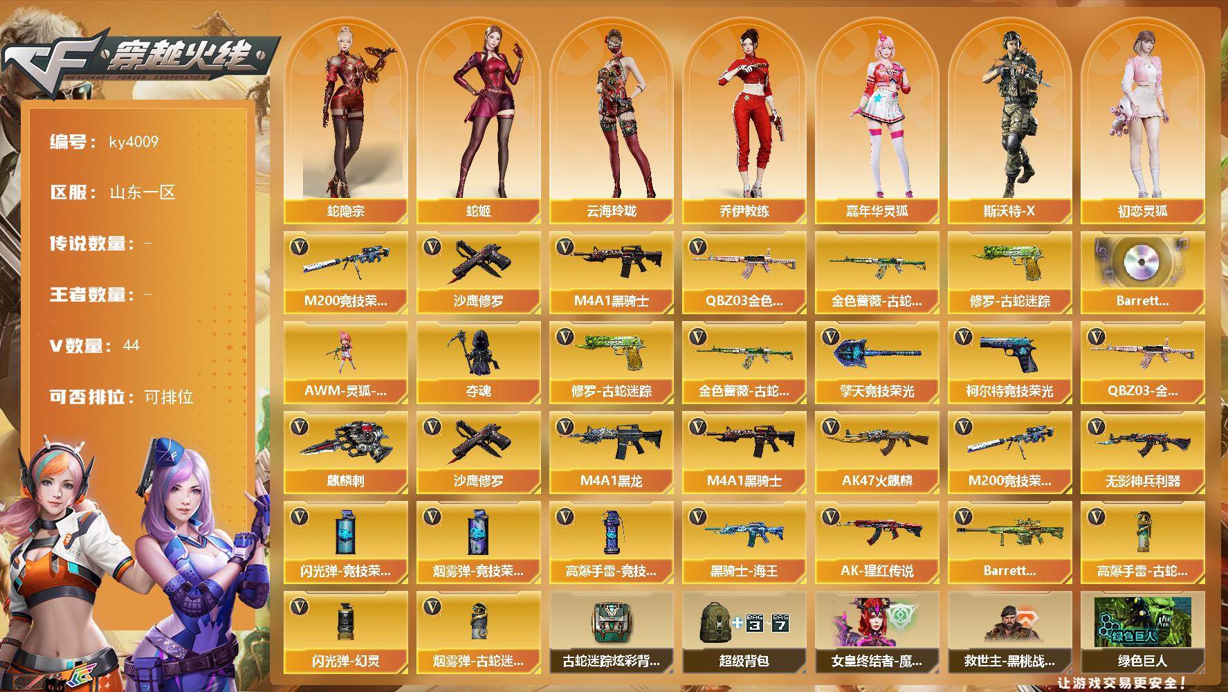[17533755]【ky4009】山东一区-44V-0王者-0炫金 【热门武器】:QBZ03-金色蔷薇,金色蔷薇-古蛇迷踪,修罗-古蛇迷踪,M200-竞技荣光,M4A1-黑骑士,沙鹰-修罗*2 【音效卡】:Barrett-碧霄极光音效卡 【角色】:电竞教官-云悠悠,蛇隐宗,乔伊教练,云海玲珑,暗夜-X,初恋灵狐,嘉年华灵狐,娟娟,灵狐者-X,龙儿-小淘气,潘多拉-X,邱刚敖,蛇姬,斯沃特-X,铁骑荣耀 【人偶武器】:AWM-灵狐-15周年嘉年华,夺魂 【英雄级武器】:AK47-火麒麟,M4A1-黑龙,M4A1-黑骑士,无影-神兵利器,金色蔷薇-古蛇迷踪,QBZ03-金色蔷薇,AK-47-猩红传说,黑骑士-海王*3,M200-竞技荣光,沙鹰-修罗*2,柯尔特-竞技荣光*2,修罗-古蛇迷踪,麒麟刺,擎天-竞技荣光,高爆手雷-竞技荣光*7,高爆手雷-古蛇迷踪,闪光弹-幻灵,闪光弹-竞技荣光*7,烟雾弹-竞技荣光*8,烟雾弹-古蛇迷踪,Barrett-碧霄极光 【道具】:古蛇迷踪炫彩背包,超级背包,女皇终结者-魔龙之吻,救世主-黑桃战神,绿色巨人,灵魂忍者,迷雾幽灵,夺命之镰,防化服*3,金色流光-枪王排位,枪王排位29赛季金色流光,古蛇迷踪打击特效,蛇隐宗表情,EP战队名片,防弹头盔*4,防弹衣*4,C4工具钳*4,手雷包*4 【特殊枪械】:1黑骑士