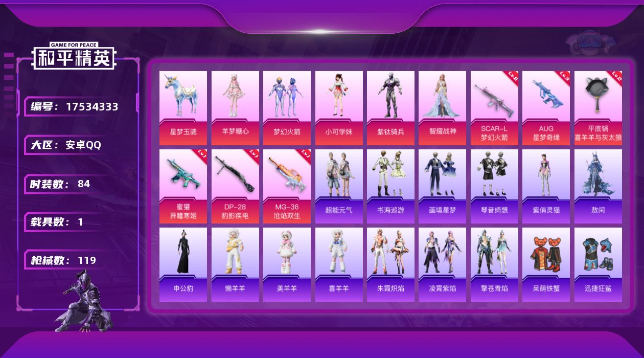 [17534333]安卓 手Q-6粉装-9特效枪-1载具-5粉色飞行器-35451热力值-3王牌印记-84套装-119枪皮 【热门品类】:粉装-梦幻火箭,套装-浪漫天命,角色-军刀雅典娜,套装-忍者信条,套装-暗影哥特 【粉色套装】:粉装-梦幻火箭,角色-小可学妹,角色-紫钛骑兵,角色-智耀战神,角色-羊梦糖心,角色-辉云木星 【粉色枪皮等级】:SCAR-L-梦幻火箭(六级),AUG-星梦奇缘(三级),蜜獾-异瞳寒姬(一级),AKS-74U-森灵之息(一级),Mk14-福马献瑞(一级),AA12-G-萌骑幻想(一级),DP-28-豹影疾电(一级),MG-36-沧焰双生(一级),平底锅-喜羊羊与灰太狼(二级) 【粉色载具】:星梦玉骢 【粉色枪皮】:SCAR-L-梦幻火箭,AUG-星梦奇缘,蜜獾-异瞳寒姬,AKS-74U-森灵之息,Mk14-福马献瑞,AA12-G-萌骑幻想,DP-28-豹影疾电,MG-36-沧焰双生,平底锅-喜羊羊与灰太狼 【粉色飞行器】:香车宝马飞行器,炫彩糖果飞行器,梦幻火箭飞行器,极意拳锋飞行器,暮色之舞飞行器 【粉色降落伞】:梦幻火箭降落伞,童趣迷兔降落伞,暗夜玫瑰降落伞,洛神天依降落伞,星梦奇缘降落伞,荧海星豚降落伞,绯穹魔姬降落伞,无垠阁降落伞,喜羊羊与灰太狼降落伞,异瞳寒姬降落伞,炫彩糖果降落伞 【稀有套装】:套装-绒宝小鹅,套装-超能元气,套装-雪国风尚,套装-炫彩糖果,套装-鱼渊荷华,套装-紫幽梦,套装-蓝冰羽,角色-瑰梦爱神,套装-诡诞巡游,角色-夜瞳黯灵,套装-朱霞炽焰,套装-凌霄紫焰,套装-擎苍青焰,玩偶服-懒羊羊,玩偶服-美羊羊,玩偶服-喜羊羊,角色-敖闰,角色-申公豹,角色-紫俏灵猫,套装-书海巡游,套装-画境星梦,套装-琴音绮想,套装-雨过天青,套装-红釉青花 【稀有枪皮】:AUG-冰晶雪宝,AKM-破晓战魂,SCAR-L-夜灯,SCAR-L-炫彩节奏,M416-萌萌史莱姆,M762-登顶巅峰,ACE32-画境星梦,ARX-凌霄紫焰,UZI-天降萌叽,UZI-影袭,UMP45-夜灯,UMP45-生命誓言,汤姆逊-幻影战神,MP5K-画境星梦,JS9-凌霄紫焰,Kar98K-梦幻火箭,AWM-暮色玫影,SKS-迅猛狂鲨,Mini14-梦幻火箭,Mini14-穿刺龙虾,AMR-喜羊羊与灰太狼,M1加兰德-画境星梦,S686-未来战士,S686-