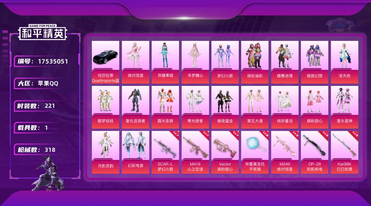 [17535051]苹果 手Q-19粉装-9特效枪-1载具-5粉色飞行器-101563热力值-10王牌印记-221套装-318枪皮 【热门品类】:粉装-梦幻火箭,粉装-缤纷油彩,套装-浪漫天命,套装-龟仙人,套装-潮萌小黄鸭,套装-红熊茄茄 【粉色套装】:角色-绝对恒星,粉装-蝶舞迷情,粉装-梦幻火箭,粉装-缤纷油彩,粉装-极致幻想,角色-洛天依,粉装-酣梦娃娃,角色-复仇流浪者,粉装-霞光圣骑,粉装-寒光使者,粉装-暗夜鎏金,粉装-第五大道,粉装-纯珍童话,粉装-飒粉甜心,粉装-室女星神,角色-月影灵韵,粉装-幻彩电音,角色-羊梦糖心,角色-异瞳寒姬 【粉色枪皮等级】:SCAR-L-梦幻火箭(七级),M416-心之恋语(七级),UMP45-萌骑冒险(五级),Vector-飒粉甜心(七级),Kar98K-巳巳如意(五级),Mk14-福马献瑞(四级),M249-绝对恒星(六级),DP-28-豹影疾电(五级),平底锅-仲夏莫吉托(六级) 【粉色载具】:玛莎拉蒂Quattroporte(夜幕蓝) 【粉色枪皮】:SCAR-L-梦幻火箭,M416-心之恋语,UMP45-萌骑冒险,Vector-飒粉甜心,Kar98K-巳巳如意,Mk14-福马献瑞,M249-绝对恒星,DP-28-豹影疾电,平底锅-仲夏莫吉托 【粉色飞行器】:绝对恒星飞行器,炫彩糖果飞行器,春暖花开飞行器,梦幻火箭飞行器,天之羽翼飞行器 【粉色降落伞】:绝对恒星降落伞,春暖花开降落伞,梦幻火箭降落伞,炫紫旋律降落伞,四圣焕新降落伞,夏日绵绵冰降落伞,焦糖拿铁降落伞,碧影闪光降落伞,橘柚倾心降落伞,筑梦精灵降落伞,彩虹甜喵降落伞,暗夜鎏金降落伞,第五大道降落伞,未来歌姬降落伞,炫光之旅降落伞,精灵梦叶罗丽降落伞,月影灵韵降落伞,盛世惊鸿降落伞,星穹咏叹调降落伞,幻彩电音降落伞,冷漠罗丽降落伞,喜羊羊与灰太狼降落伞,异瞳寒姬降落伞,极意拳锋降落伞,炫彩糖果降落伞 【稀有套装】:套装-龟仙人,套装-绒宝小鹅,套装-巳巳如意,角色-超感刻度,角色-甜心蒙太奇,套装-雪国风尚,套装-炫彩糖果,套装-糖糖葫芦,套装-青团波波,角色-摩登魅猫,角色-光矢逐梦,套装-燕燕于飞,套装-鱼渊荷华,玩偶服-小狗蛇点点,角色-糖霜甜心,套装-风舞幻音,套装-紫幽梦,套装-蓝冰羽,套装-星影赞美诗,套装-极速光影,套装-彩虹兔,套装-云朵鹅,套装-雪绒豹,