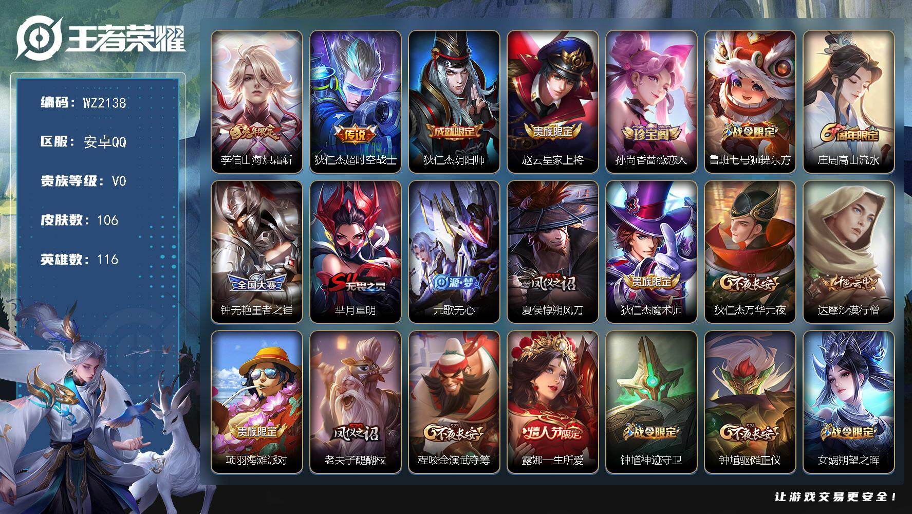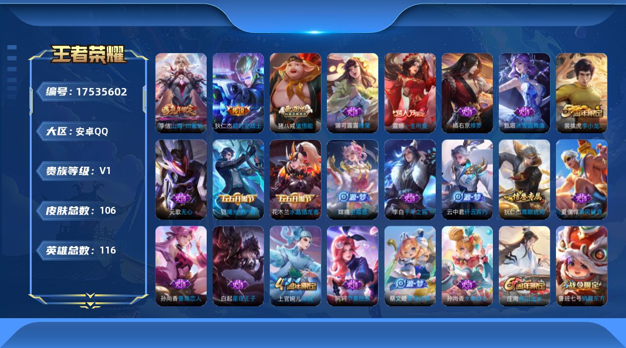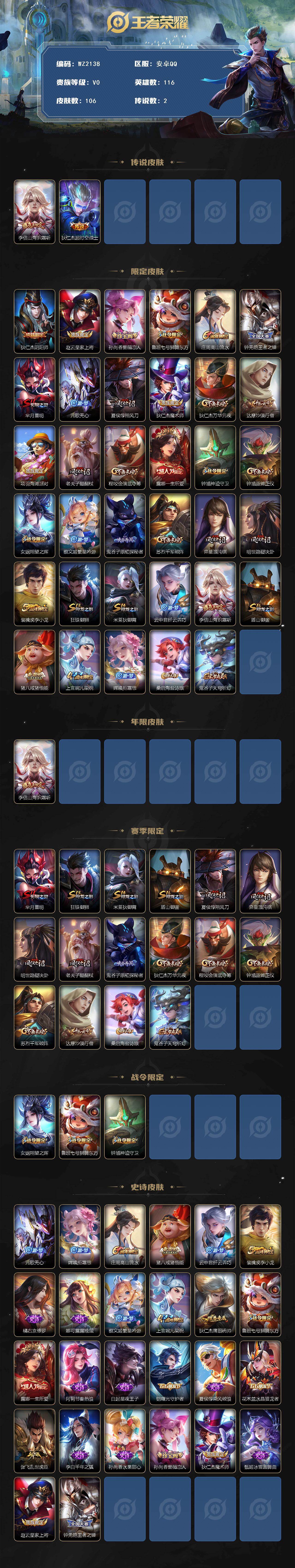 [17535602]安卓Q-106皮肤-2传说-26史诗 【传说皮肤】:李信山海炽霜斩,狄仁杰超时空战士 【限定皮肤】:狄仁杰阴阳师,赵云皇家上将,孙尚香蔷薇恋人,鲁班七号狮舞东方,庄周高山流水,钟无艳王者之锤,芈月重明,元歌无心,夏侯惇朔风刀,狄仁杰魔术师,狄仁杰万华元夜,达摩沙漠行僧,项羽海滩派对,老夫子醍醐杖,程咬金演武夺筹,露娜一生所爱,钟馗神迹守卫,钟馗驱傩正仪,女娲朔望之晖,蔡文姬繁星吟游,鬼谷子原初探秘者,苏烈千军破阵,弈星混沌棋,明世隐疑决卦,裴擒虎李小龙,狂铁御狮,米莱狄御霄,云中君纤云弄巧,李信山海炽霜斩,盾山御銮,猪八戒猪悟能,上官婉儿梁祝,嫦娥拒霜思,桑启海盐诗旅,鬼谷子天穹祈灯 【年限皮肤】:李信山海炽霜斩 【赛季限定】:芈月重明,狂铁御狮,米莱狄御霄,盾山御銮,夏侯惇朔风刀,弈星混沌棋,明世隐疑决卦,老夫子醍醐杖,鬼谷子原初探秘者,狄仁杰万华元夜,程咬金演武夺筹,钟馗驱傩正仪,苏烈千军破阵,达摩沙漠行僧,桑启海盐诗旅,鬼谷子天穹祈灯 【战令限定】:女娲朔望之晖,鲁班七号狮舞东方,钟馗神迹守卫 【史诗皮肤】:元歌无心,嫦娥拒霜思,庄周高山流水,猪八戒猪悟能,云中君纤云弄巧,裴擒虎李小龙,橘右京修罗,娜可露露晚萤,蔡文姬繁星吟游,上官婉儿梁祝,狄仁杰鹰眼统帅,鲁班七号狮舞东方,露娜一生所爱,阿轲节奏热浪,白起星夜王子,铠曙光守护者,夏侯惇乘风破浪,花木兰水晶猎龙者,张飞乱世虎臣,李白千年之狐,孙尚香水果甜心,孙尚香蔷薇恋人,狄仁杰魔术师,甄姬冰雪圆舞曲,赵云皇家上将,钟无艳王者之锤 【其他皮肤】:鬼谷子天穹祈灯,牛魔牛运亨通,桑启海盐诗旅,程咬金无双福将,达摩沙漠行僧,妲己紫罗兰之誓,苏烈千军破阵,鲁班大师乓乓大师,钟馗驱傩正仪,张良缤纷绘卷,程咬金演武夺筹,露娜瓷语鉴心,杨戬次元傲视,刘禅秘密基地,狄仁杰万华元夜,鬼谷子原初探秘者,老夫子醍醐杖,盾山圆桌骑士,明世隐疑决卦,弈星混沌棋,夏侯惇朔风刀,姜子牙炽热元素使,沈梦溪鲨炮海盗猫,盾山御銮,钟馗神迹守卫,吕布野性能量,小乔丁香结,女娲朔望之晖,明世隐虹云星官,米莱狄御霄,苏烈坚韧之力,狂铁御狮,牛魔制霸全明星,老夫子功夫老勺,芈月重明,宫本武藏霸王丸,钟无艳海滩丽影,刘备汉昭烈帝,刘备纽约教父,狄仁杰阴阳师,后羿阿尔法小队,刘备万事如意,典韦黄金武士,妲己少女阿狸,姜子牙时尚教父,安琪拉玩偶对对碰,扁鹊化