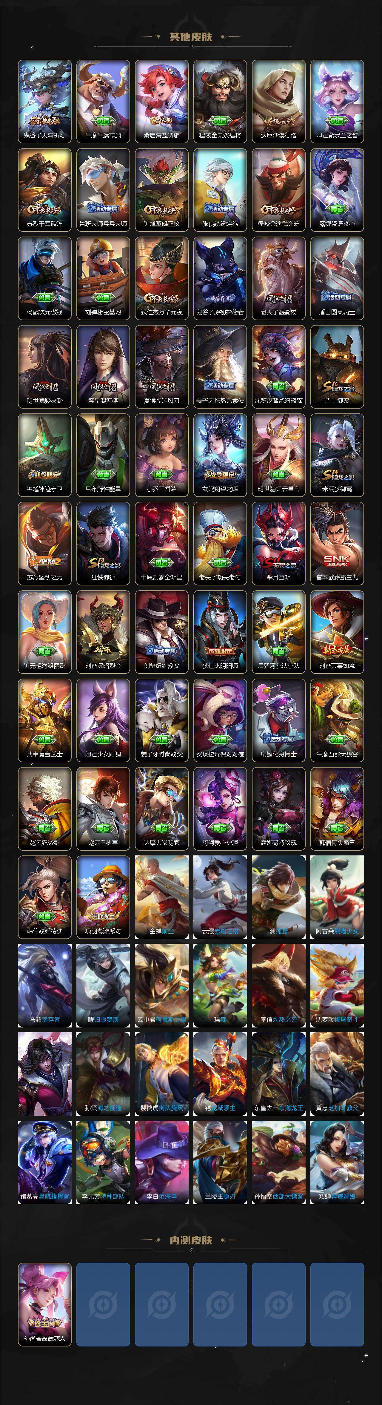 【限定皮肤】:狄仁杰阴阳师,赵云皇家上将,孙尚香蔷薇恋人,鲁班七号狮舞东方,庄周高山流水,钟无艳王者之锤,芈月重明,元歌无心,夏侯惇朔风刀,狄仁杰魔术师,狄仁杰万华元夜,达摩沙漠行僧,项羽海滩派对,老夫子醍醐杖,程咬金演武夺筹,露娜一生所爱,钟馗神迹守卫,钟馗驱傩正仪,女娲朔望之晖,蔡文姬繁星吟游,鬼谷子原初探秘者,苏烈千军破阵,弈星混沌棋,明世隐疑决卦,裴擒虎李小龙,狂铁御狮,米莱狄御霄,云中君纤云弄巧,李信山海炽霜斩,盾山御銮,猪八戒猪悟能,上官婉儿梁祝,嫦娥拒霜思,桑启海盐诗旅,鬼谷子天穹祈灯