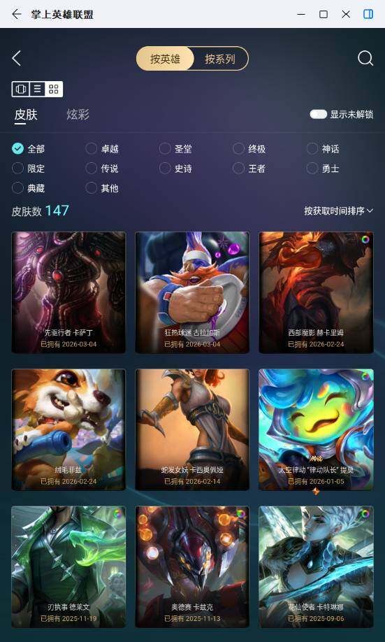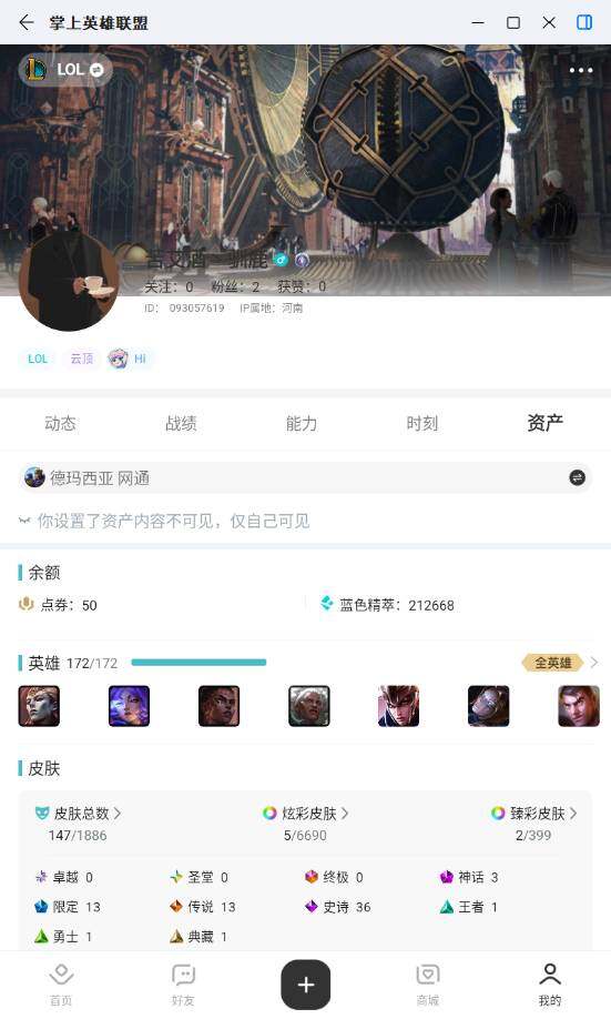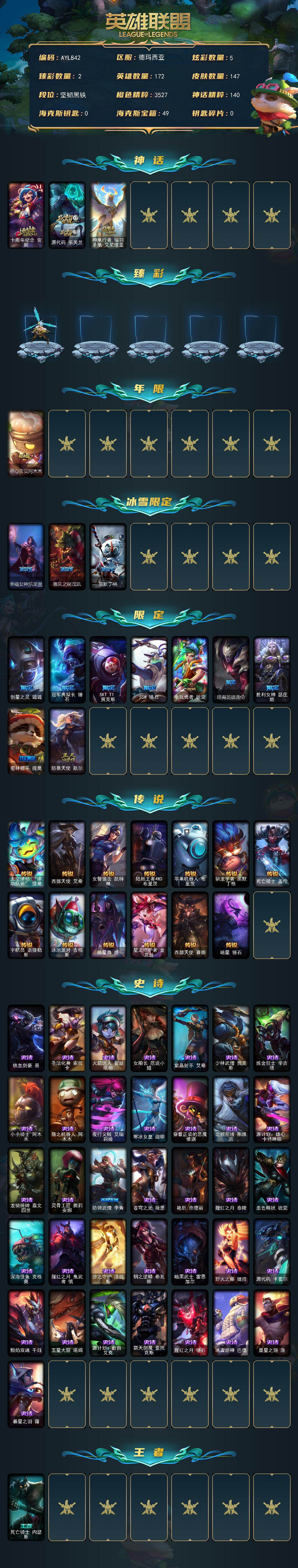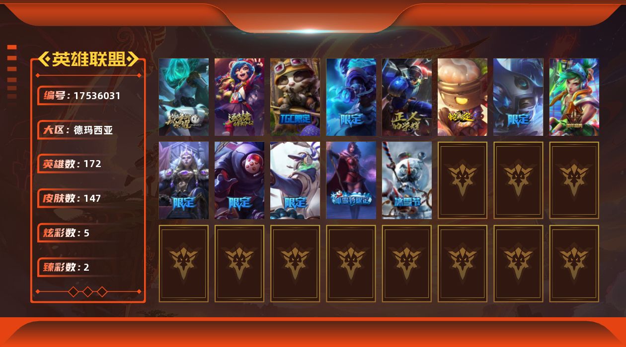 [17536031]未定级段位-172英雄-147皮肤-5炫彩-0终极-3神话-13限定-13传说-36史诗