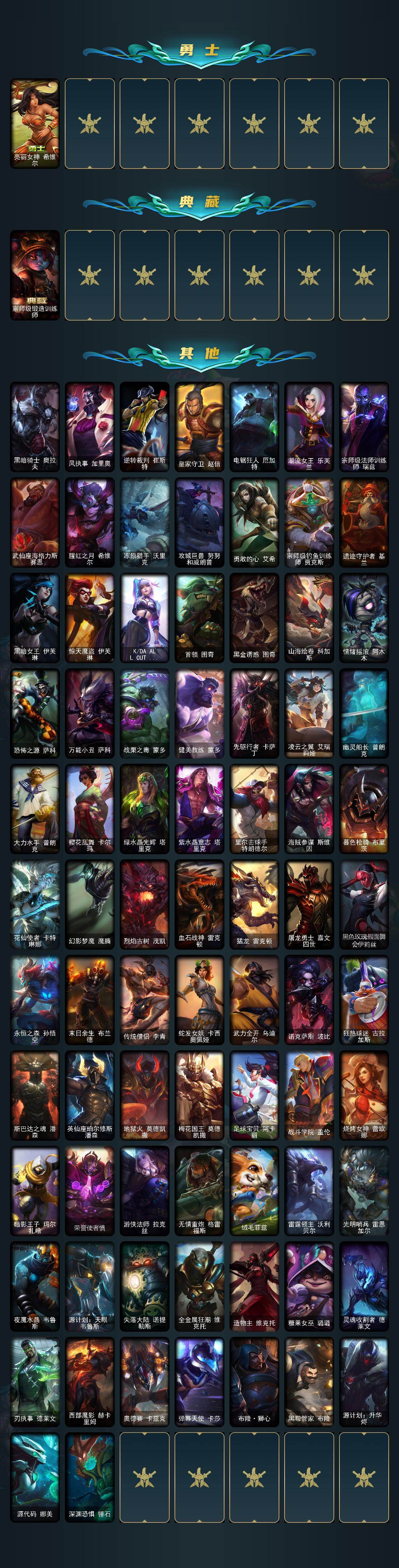 【其他皮肤1】:黑暗骑士奥拉夫,风执事加里奥,逆转裁判崔斯特,皇家守卫赵信,电锯狂人厄加特,潮流女王乐芙兰,宗师级法师训练师瑞兹,武仙座海格力斯赛恩,腥红之月希维尔,冻原猎手沃里克,攻城巨兽努努和威朗普,勇敢的心艾希,宗师级钓鱼训练师贾克斯,遗迹守护者基兰,黑暗女王伊芙琳,惊天魔盗伊芙琳,KDAALLOUT伊芙琳,首领图奇,黑金诱惑图奇,山海绘卷科加斯,情绪摇滚阿木木,恐怖之源萨科,万能小丑萨科,战栗之毒蒙多,健美教练蒙多,先驱行者卡萨丁,凌云之翼艾瑞莉娅,幽灵船长普朗克,大力水手普朗克,樱花乱舞卡尔玛,绿水晶光辉塔里克,紫水晶意志塔里克,里尔击球手特朗德尔,海贼参谋斯维因,暮色枪骑布里茨,花仙使者卡特琳娜,幻影梦魔魔腾,烈焰古树茂凯,血石战神雷克顿,猛龙雷克