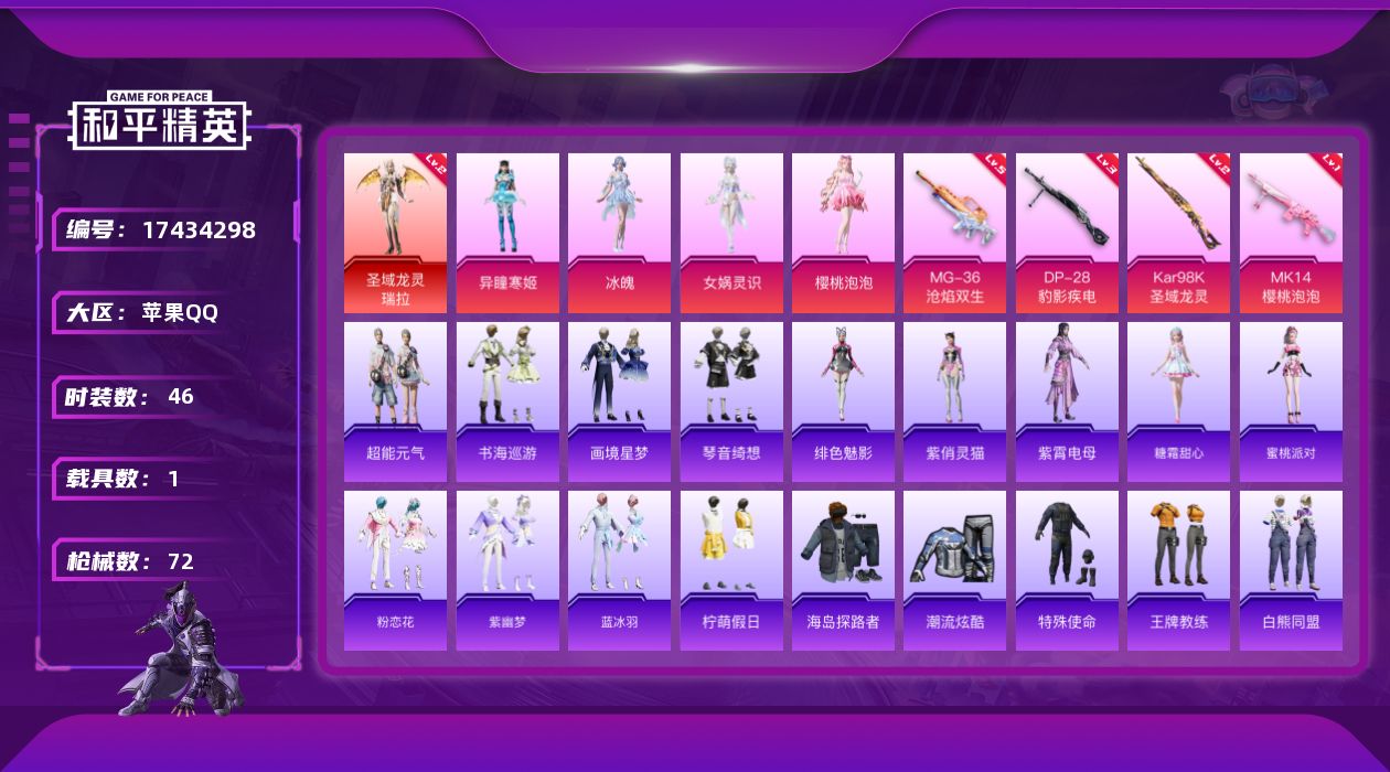 [17434298]苹果 手Q-2神装-4粉装-7特效枪-1载具-4粉色飞行器-38334热力值-1王牌印记-46套装-72枪皮
