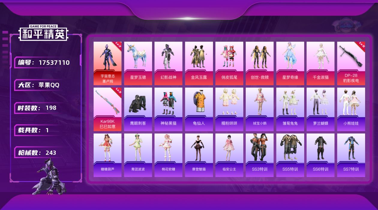 [17537110]苹果 手Q-1神装-7粉装-4特效枪-1载具-3粉色飞行器-80883热力值-10王牌印记-198套装-243枪皮 【红色神装等级】:宇宙意志-塞卢姆(三级) 【红色角色神装】:宇宙意志-塞卢姆 【热门品类】:套装-龟仙人,套装-糯粉咩咩 【粉色套装】:粉装-幻影战神,粉装-金风玉露,粉装-俏皮狐尾,套装-创世·救赎,角色-星梦奇缘,角色-千金淑猫,人物-小舞·灵珑 【粉色枪皮等级】:ACE32-萌骑漫游(二级),Kar98K-巳巳如意(五级),Mk14-福马献瑞(五级),DP-28-豹影疾电(五级) 【粉色载具】:星梦玉骢 【粉色枪皮】:ACE32-萌骑漫游,Kar98K-巳巳如意,Mk14-福马献瑞,DP-28-豹影疾电 【粉色飞行器】:炫彩糖果飞行器,星夜魔法师飞行翼,深渊漩涡飞行器 【粉色降落伞】:幻影战神降落伞,精灵迷巫降落伞,梦幻火箭降落伞,甜蜜誓约降落伞,心之恋语降落伞,荧光虫舞降落伞,夏日绵绵冰降落伞,香水柠檬降落伞,飒粉甜心降落伞,创世·救赎降落伞,星梦奇缘降落伞,金丰海韵降落伞,英伦信使降落伞,千金淑猫降落伞,鬼刀降落伞,喜羊羊与灰太狼降落伞,炫彩糖果降落伞 【稀有套装】:套装-龟仙人,套装-绒宝小鹅,套装-马上有钱,套装-雏菊兔兔,套装-萝兰蝴蝶,套装-小熊娃娃,套装-糖糖葫芦,套装-青团波波,套装-棉花软糖,角色-摩登魅猫,角色-临安公主,套装-雨过天青,套装-红釉青花 【稀有枪皮】:AKM-四圣焕新,AKM-夜灯,AKM-彩虹符号,AKM-星之信仰,AKM-破晓战魂,AKM-萌趣颜团子,AKM-虎虎生威,AKM-霓虹街区,AKM-龙的传人,M16A4-幻世战舞者,M16A4-红色方程式,M16A4-蓝色火焰,M16A4-千金淑猫,SCAR-L-夜灯,SCAR-L-炫彩节奏,SCAR-L-玉兔迎春,SCAR-L-甜蜜誓约,SCAR-L-生命誓言,SCAR-L-红色方程式,M416-夜灯,M416-糯团青竹,M416-红色方程式,M416-蓝色火焰,GROZA-彩虹符号,GROZA-影袭,GROZA-治愈之星,GROZA-黑色刀锋,AUG-天降萌叽,AUG-幻影战神,AUG-耀粉歌者,QBZ-彩虹符号,QBZ-电玩视界,M762-天降萌叽,M762-牛气冲天,M762-绯红前夜,M762-镭射皇者,Mk47-妙红点点,AC-VAL-天降萌叽,