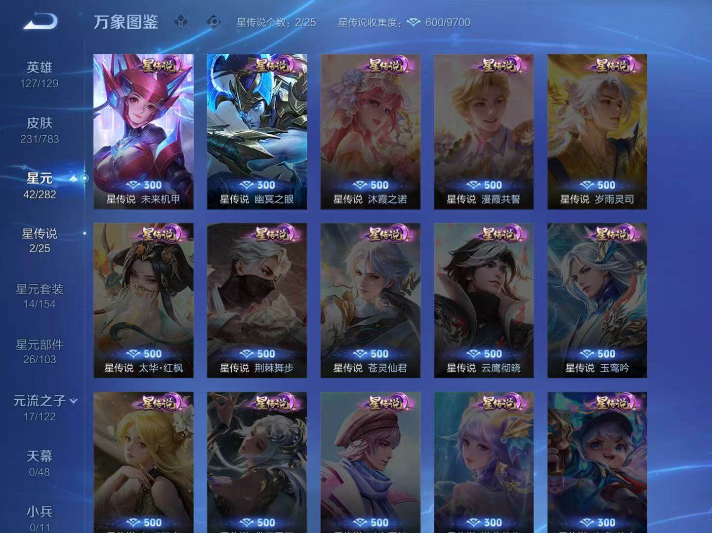 扁鹊炼金王,虞姬凯尔特女王,白起狰,太乙真人饕餮,曹操烛龙,芈月重明,典韦穷奇,狂铁御狮,米莱狄御霄,牛魔御旌,盾山御銮,夏侯惇朔风刀,明世隐疑决卦,老夫子醍醐杖,鬼谷子原初探秘者,狄仁杰万华元夜,程咬金演武夺筹,钟馗驱傩正仪,吕布猎兽之王,嬴政白昼王子,钟馗神迹守卫,鲁班七号狮舞东方,马可波罗暗影游猎,弈星混沌棋,达摩沙漠行僧,裴擒虎擒涛扼浪,鲁班大师探海日志
