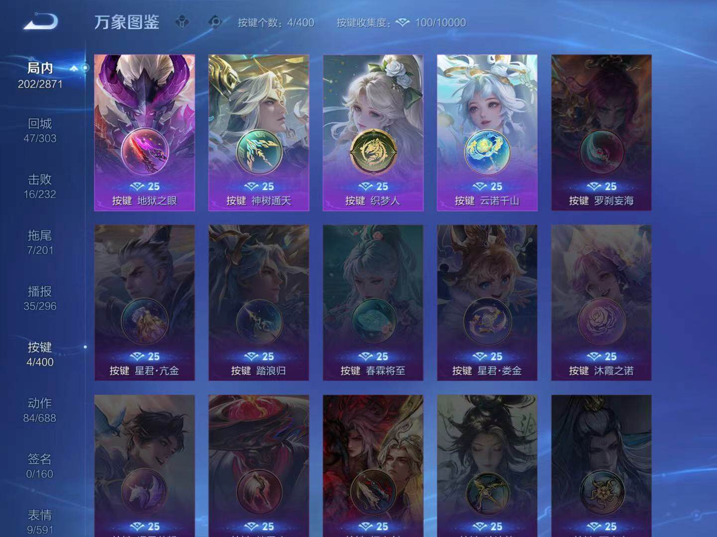 裴擒虎李小龙,上官婉儿梁祝,赵云龙胆,马超神威,后羿辉光之辰,韩信逐梦之影,百里玄策白虎志,小乔纯白花嫁,孙悟空大圣娶亲,孙悟空至尊宝,妲己时之彼端,赵云引擎之心,孙悟空美猴王,裴擒虎寅虎·赤拳,桑启鸣野蒿
