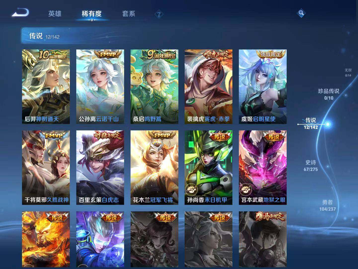 【传说皮肤】:后羿神树通天,公孙离云诺千山,桑启鸣野蒿,裴擒虎寅虎赤拳,虞姬启明星使,干将莫邪久胜战神,百里玄策白虎志,花木兰冠军飞将,孙尚香末日机甲,宫本武藏地狱之眼,孙悟空地狱火,狄仁杰超时空战士
