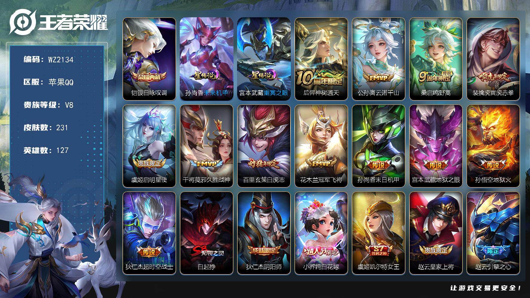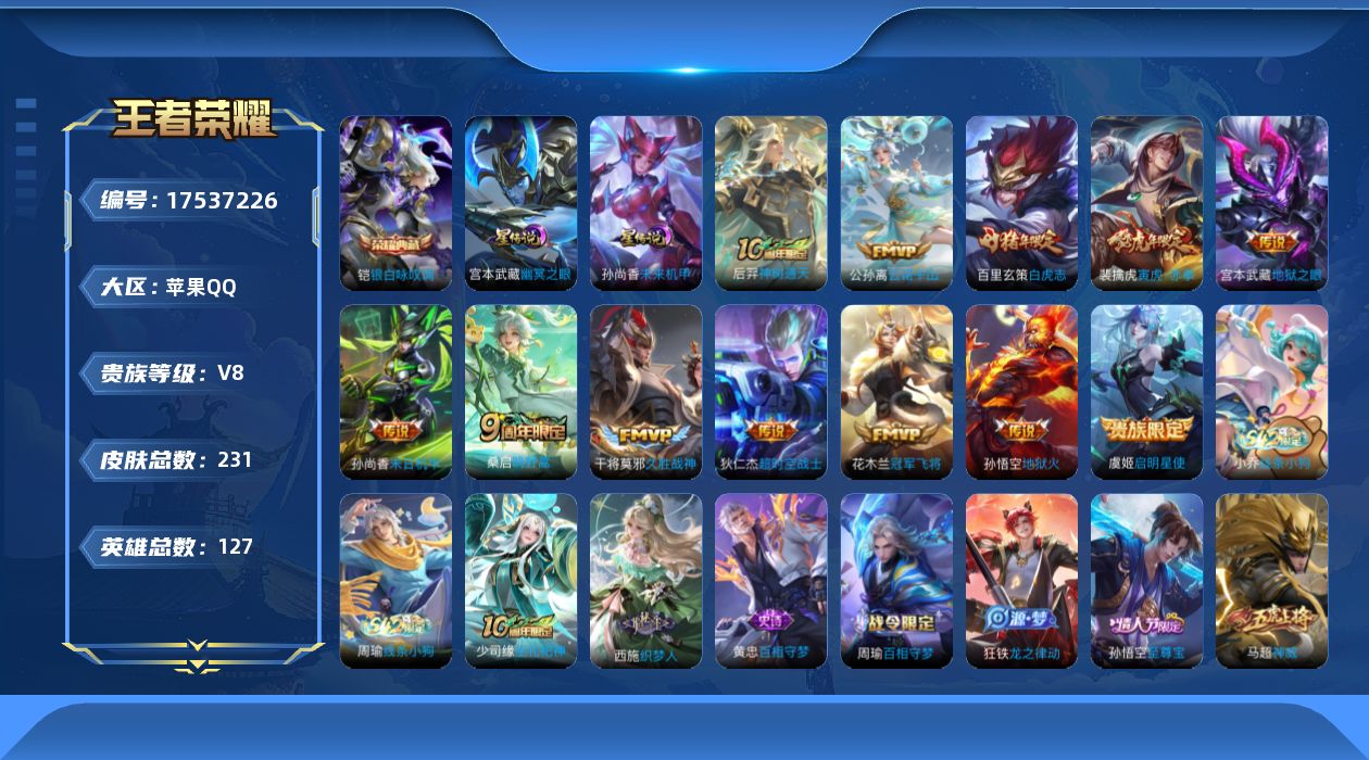 [17537226]苹果Q-V8-231皮肤-1典藏皮肤-12传说-66史诗 【英雄全皮】:孙权全皮,空空儿全皮 【荣耀典藏】:铠银白咏叹调 【传说皮肤】:后羿神树通天,公孙离云诺千山,桑启鸣野蒿,裴擒虎寅虎赤拳,虞姬启明星使,干将莫邪久胜战神,百里玄策白虎志,花木兰冠军飞将,孙尚香末日机甲,宫本武藏地狱之眼,孙悟空地狱火,狄仁杰超时空战士 【限定皮肤】:白起狰,狄仁杰阴阳师,小乔纯白花嫁,虞姬凯尔特女王,赵云皇家上将,赵云引擎之心,赵云龙胆,墨子神迹守卫,妲己时之彼端,嬴政优雅恋人,嬴政白昼王子,鲁班七号狮舞东方,高渐离死亡摇滚,钟无艳王者之锤,扁鹊炼金王,芈月重明,芈月幻夜卜梦,吕布猎兽之王,元歌无心,夏侯惇朔风刀,曹操烛龙,典韦穷奇,马可波罗暗影游猎,狄仁杰魔术师,狄仁杰万华元夜,达摩沙漠行僧,项羽海滩派对,老夫子醍醐杖,老夫子航海奇遇记,程咬金演武夺筹,韩信逐梦之影,孙悟空美猴王,孙悟空至尊宝,孙悟空大圣娶亲,牛魔御旌,后羿辉光之辰,虞姬启明星使,钟馗神迹守卫,钟馗驱傩正仪,杨玉环遇见飞天,雅典娜黎明之约,太乙真人饕餮,鬼谷子原初探秘者,黄忠火炮绅士,百里玄策白虎志,百里玄策原初追逐者,弈星混沌棋,明世隐疑决卦,裴擒虎李小龙,裴擒虎寅虎赤拳,裴擒虎擒涛扼浪,狂铁御狮,米莱狄御霄,云中君纤云弄巧,盾山御銮,猪八戒西部大镖客,上官婉儿梁祝,鲁班大师探海日志,艾琳女武神,鬼谷子天穹祈灯,沈梦溪龙舞盛年 【年限皮肤】:孙悟空美猴王,后羿辉光之辰,百里玄策白虎志,裴擒虎寅虎赤拳 【赛季限定】:扁鹊炼金王,虞姬凯尔特女王,白起狰,太乙真人饕餮,曹操烛龙,芈月重明,典韦穷奇,狂铁御狮,米莱狄御霄,牛魔御旌,盾山御銮,夏侯惇朔风刀,弈星混沌棋,明世隐疑决卦,老夫子醍醐杖,鬼谷子原初探秘者,狄仁杰万华元夜,程咬金演武夺筹,钟馗驱傩正仪,达摩沙漠行僧,裴擒虎擒涛扼浪,鲁班大师探海日志,鬼谷子天穹祈灯,甄姬逆浪荇歌,亚瑟荣光之誓,百里玄策原初追逐者,雅典娜黎明之约 【战令限定】:嬴政白昼王子,吕布猎兽之王,鲁班七号狮舞东方,钟馗神迹守卫,马可波罗暗影游猎,猪八戒西部大镖客,老夫子航海奇遇记,墨子神迹守卫,黄忠火炮绅士,芈月幻夜卜梦,周瑜百相守梦,孙策百相守梦,周瑜线条小狗,小乔线条小狗 【史诗皮肤】:周瑜线条小狗,小乔线条小狗,少司缘巫礼祀神,西施织梦人,黄忠百相守梦,周瑜百相守梦,狂铁龙之律动,