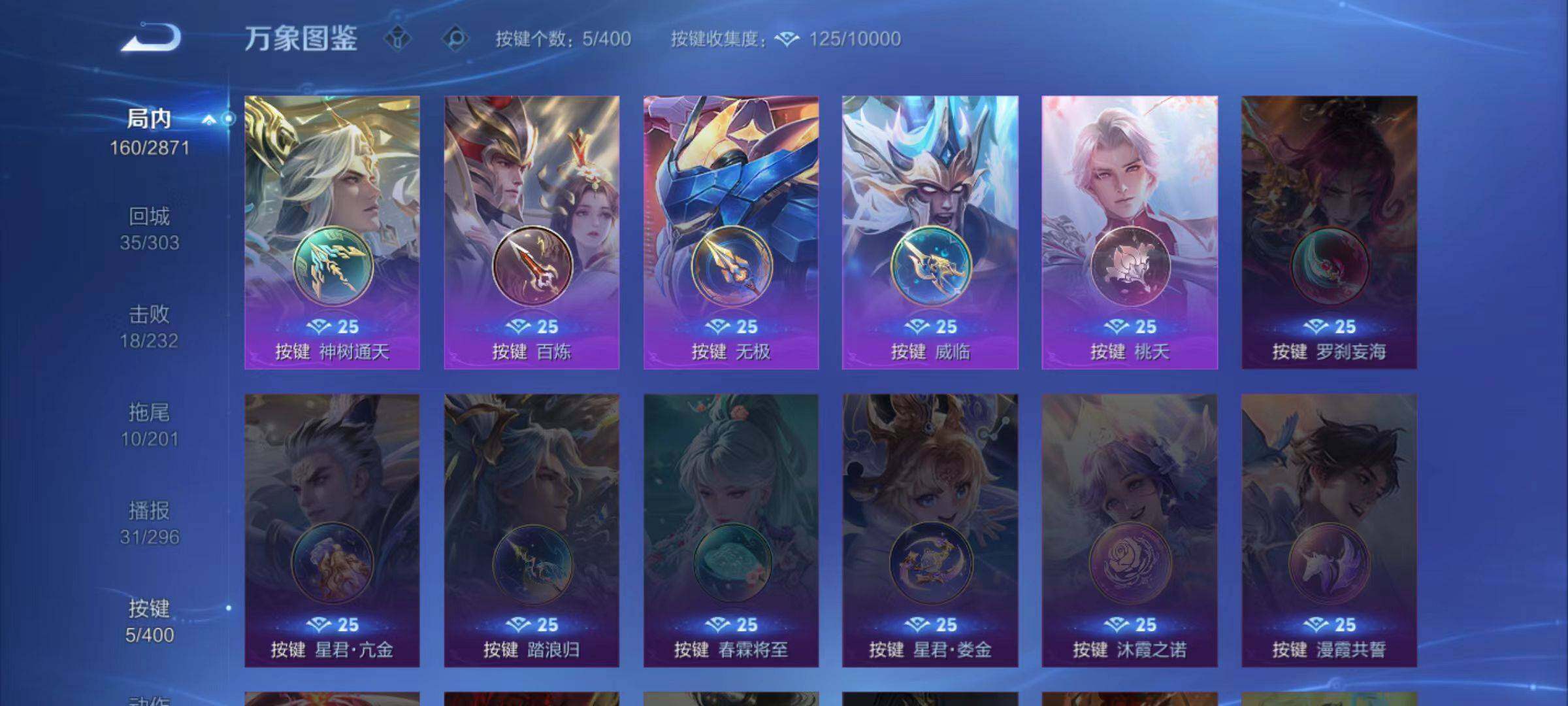 关羽冰锋战神,裴擒虎李小龙,上官婉儿梁祝,后羿辉光之辰,韩信逐梦之影,百里玄策白虎志,孙悟空大圣娶亲,花木兰默契交锋,裴擒虎梅西,干将莫邪冰霜恋舞曲,赵云引擎之心,孙悟空美猴王,桑启鸣野蒿,司空震愿照·山河定