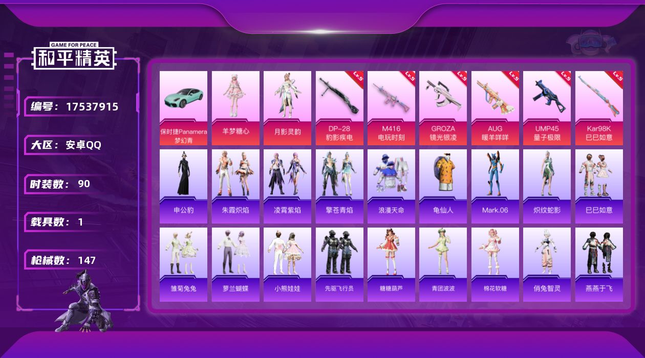 [17537915]地铁满天赋 安卓 手Q-2粉装-6特效枪-1载具-2粉色飞行器-39053热力值-8王牌印记-90套装-147枪皮【热门品类】:套装-浪漫天命,套装-龟仙人,角色-Mark.06【粉色套装】:角色-月影灵韵,角色-羊梦糖心【粉色枪皮等级】:M416-电玩时刻(五级),GROZA-镜光银凌(五级),AUG-暖羊咩咩(五级),UMP45-量子极限(五级),Kar98K-巳巳如意(五级),DP-28-豹影疾电(五级)【粉色载具】:保时捷Panamera(梦幻青)【粉色枪皮】:M416-电玩时刻,GROZA-镜光银凌,AUG-暖羊咩咩,UMP45-量子极限,Kar98K-巳巳如意,DP-28-豹影疾电【粉色飞行器】:炫彩糖果飞行器,萌物绒绒飞行器