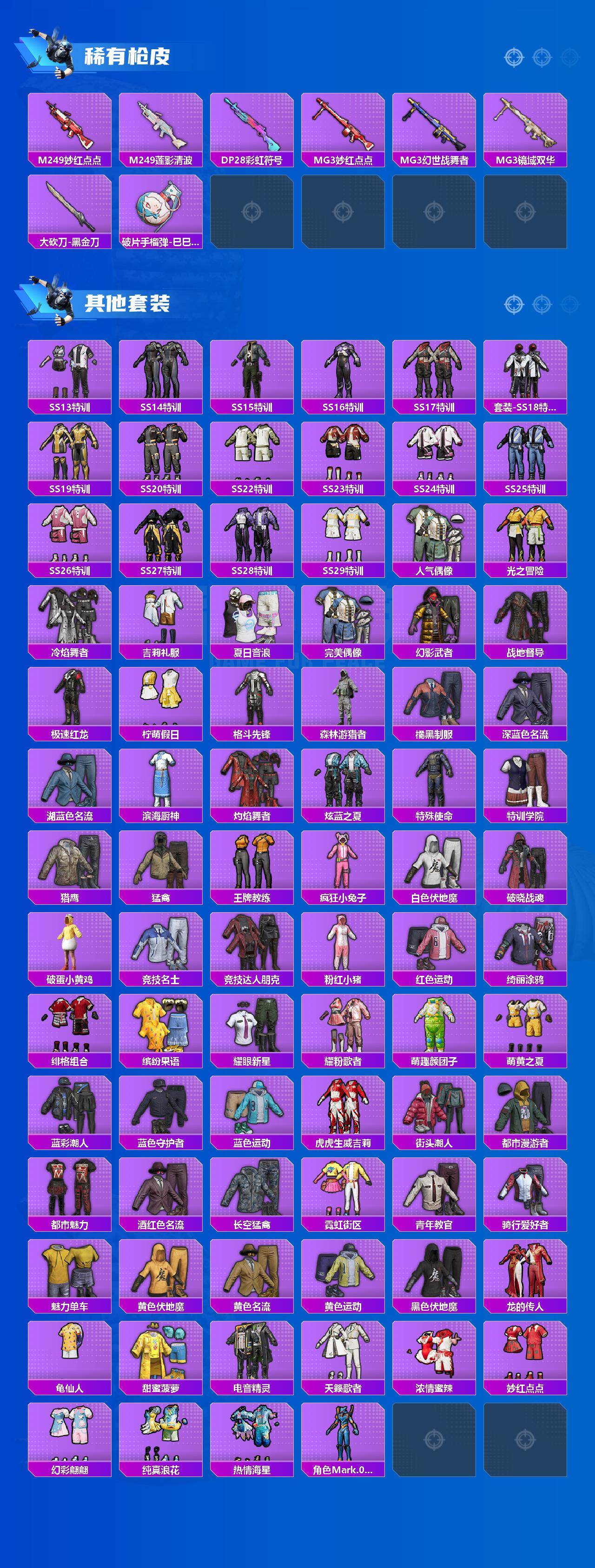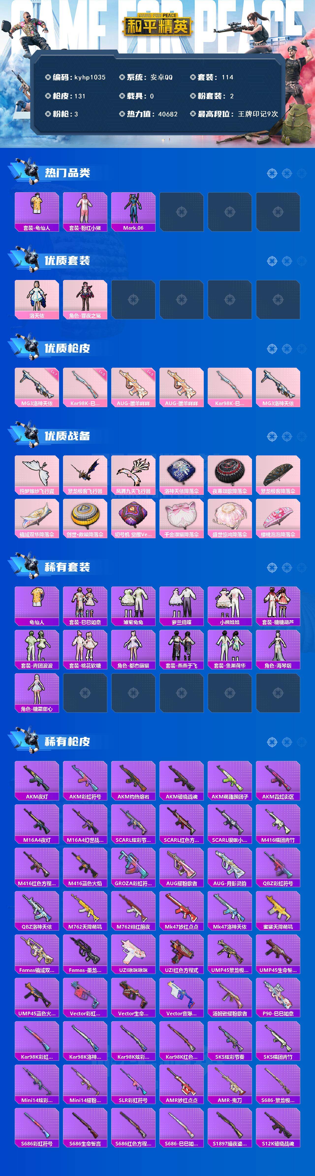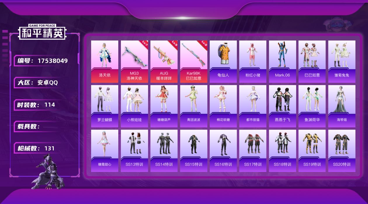 [17538049]安卓 手Q-2粉装-3特效枪-0载具-3粉色飞行器-40682热力值-9王牌印记-114套装-131枪皮 【热门品类】:套装-龟仙人,套装-粉红小猪,角色-Mark.06 【粉色套装】:角色-洛天依,角色-罪夜之冕 【粉色枪皮等级】:AUG-暖羊咩咩(五级),Kar98K-巳巳如意(五级),MG3-洛神天依(七级) 【粉色枪皮】:AUG-暖羊咩咩,Kar98K-巳巳如意,MG3-洛神天依 【粉色飞行器】:纯梦嫁纱飞行翼,繁龙极客飞行器,凤舞九天飞行器 【粉色降落伞】:洛神天依降落伞,夜幕颂歌降落伞,繁龙极客降落伞,镜域双华降落伞,创世·救赎降落伞,初号机 觉醒Ver.降落伞,千金淑猫降落伞,盛世惊鸿降落伞,樱桃泡泡降落伞 【稀有套装】:套装-龟仙人,套装-巳巳如意,套装-雏菊兔兔,套装-萝兰蝴蝶,套装-小熊娃娃,套装-糖糖葫芦,套装-青团波波,套装-棉花软糖,角色-都市丽猫,套装-燕燕于飞,套装-鱼渊荷华,角色-海琴烟,角色-糖霜甜心 【稀有枪皮】:AKM-夜灯,AKM-彩虹符号,AKM-灼热熔岩,AKM-破晓战魂,AKM-萌趣颜团子,AKM-霓虹街区,M16A4-夜灯,M16A4-幻世战舞者,SCAR-L-炫彩节奏,SCAR-L-红色方程式,SCAR-L-银碳小老虎,M416-糯团青竹,M416-红色方程式,M416-蓝色火焰,GROZA-彩虹符号,AUG-耀粉歌者,AUG-月影灵韵,QBZ-彩虹符号,QBZ-洛神天依,M762-天降萌叽,M762-绯红前夜,Mk47-妙红点点,Mk47-洛神天依,蜜獾-天降萌叽,Famas-镜域双华,Famas-墨龙九天,UZI-啾咪啾咪,UZI-红色方程式,UMP45-繁龙极客,UMP45-生命誓言,UMP45-蓝色火焰,Vector-彩虹符号,Vector-生命誓言,Vector-音爆索尼克,汤姆逊-耀粉歌者,P90-巳巳如意,Kar98K-彩虹符号,Kar98K-洛神天依,Kar98K-炫彩节奏,Kar98K-红色方程式,SKS-炫彩节奏,SKS-糯团青竹,Mini14-炫彩节奏,Mini14-耀粉歌者,SLR-彩虹符号,AMR-妙红点点,AMR-鬼刀,S686-繁龙极客,S686-彩虹符号,S686-生命誓言,S686-红色方程式,S686-巳巳如意,S1897-暗夜鎏金,S12K-破晓战魂,M249-妙红点点,M24