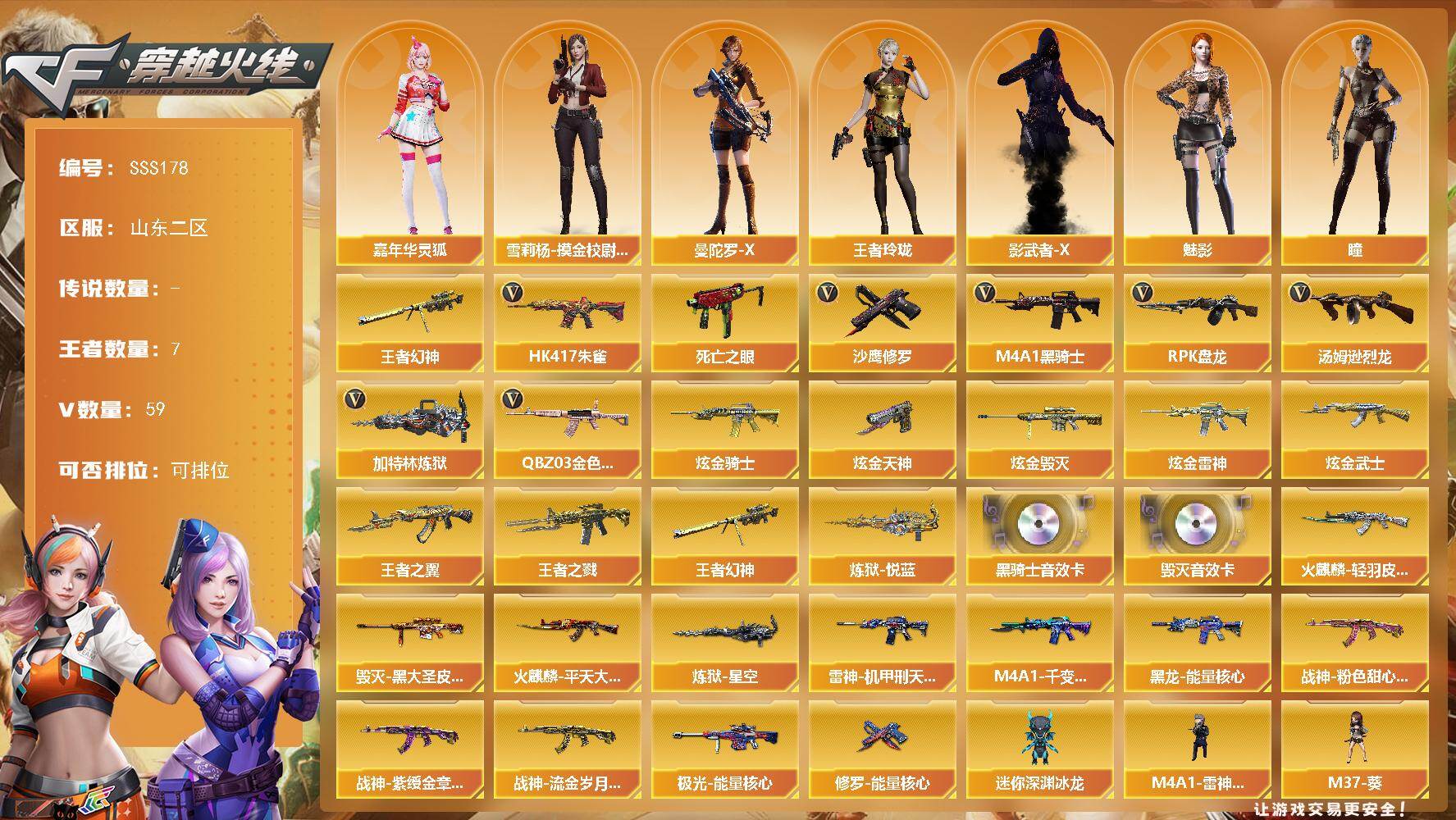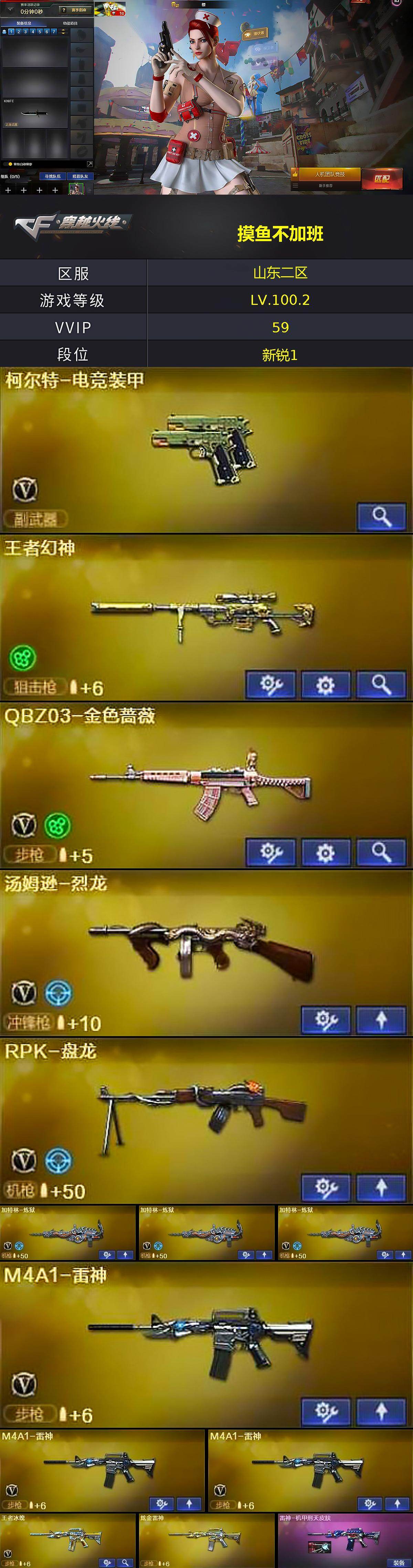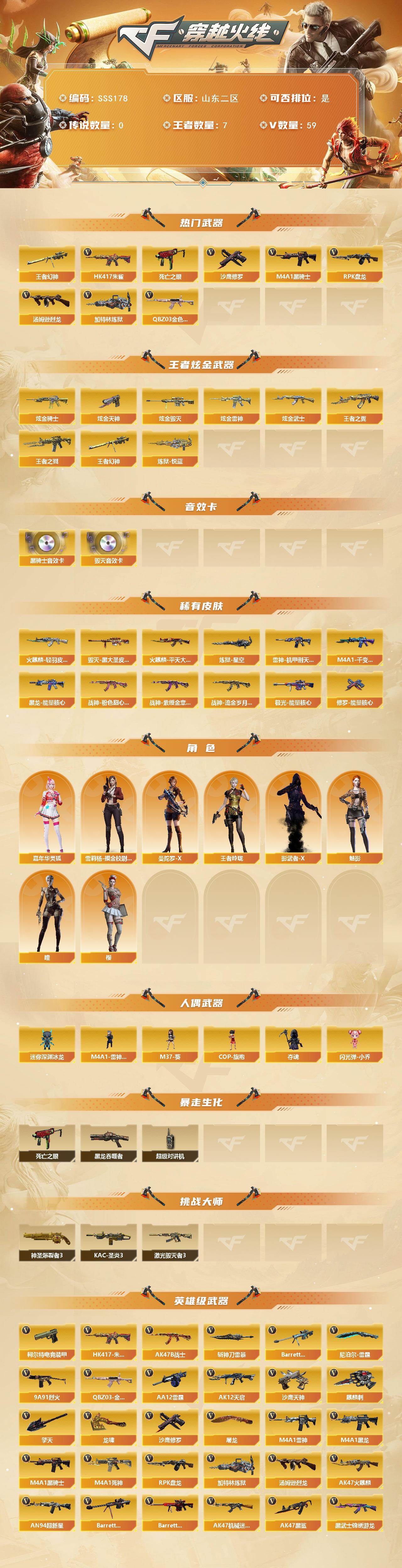 [17538083]山东二区-62V-7王者武器数-5炫金武器数 【热门武器】:王者幻神,QBZ03-金色蔷薇,HK417-朱雀,死亡之眼,M4A1-黑骑士*2,汤姆逊-烈龙,RPK-盘龙,加特林-炼狱*3,沙鹰-修罗*4 【王者炫金武器】:王者之戮,王者之翼,王者幻神,炼狱-悦蓝,炫金骑士,炫金雷神,炫金武士,炫金毁灭,炫金天神 【音效卡】:M4A1-黑骑士音效卡,Barrett-毁灭音效卡 【皮肤】:雷神-机甲刑天皮肤,火麒麟-轻羽皮肤,火麒麟-平天大圣,毁灭-黑大圣皮肤,M4A1-千变-孔明皮肤,黑龙-能量核心,战神-粉色甜心皮肤,战神-紫绶金章皮肤,战神-流金岁月皮肤,极光-能量核心,炼狱-星空,修罗-能量核心*2 【角色】:樱,瞳,魅影,王者玲珑,嘉年华灵狐,曼陀罗-X,雪莉杨-摸金校尉,影武者-X 【人偶武器】:M4A1-雷神-精英刀锋,M37-葵,COP-旗袍,迷你深渊冰龙,夺魂,闪光弹-小乔 【暴走生化】:黑龙吞噬者,死亡之眼,超级对讲机 【挑战大师】:神圣爆裂者III,激光毁灭者III*2,KAC-圣炎切割者III 【英雄级武器】:AK47-火麒麟*2,M4A1-黑龙*3,M4A1-雷神*3,M4A1-黑骑士*2,M4A1-死神,AK12-天启,AN94-超新星,AK47-机械迷城,AK47-黑鲨,HK417-朱雀,黑武士-锦绣游龙,QBZ03-金色蔷薇,9A91-烈火,王者之心-觉醒版,王者之势-觉醒版,AK-47-猩红传说,AK47-B-战神,王者冰魄-觉醒版,黑骑士-海王,AK47-B-战士,Barrett-毁灭,Barrett-极光,Barrett-暗月传说,RPK-盘龙,加特林-炼狱*3,汤姆逊-烈龙,AA-12-雷霆,沙鹰-修罗*4,沙鹰-天神,柯尔特-电竞装甲,屠龙,龙啸,擎天,麒麟刺,尼泊尔-雷霆,斩神刀-雷暴,高爆手雷-雷霆,高爆手雷-雷暴*2,闪光弹-雷霆,闪光弹-雷暴*2,烟雾弹-雷霆,烟雾弹-雷暴*2 【源级武器】:源-千变,御·黑龙-龙太子,魂·雷神-新春神龙,魂·雷神-萌柴,御·黑骑士-冰魄,源·超新星,源·武圣,源·机械迷城,源-金色蔷薇,魂·QBZ03-金色蔷薇-蛇姬,魂·裁决-新人王绿豆,魂·Barrett-朱雀- 新春神龙,魂·修罗-15周年嘉年华,源·天神,源·武圣glock,魂·屠龙-春桃,魂·麒麟刺-神秘黑洞 【道具】:炫彩