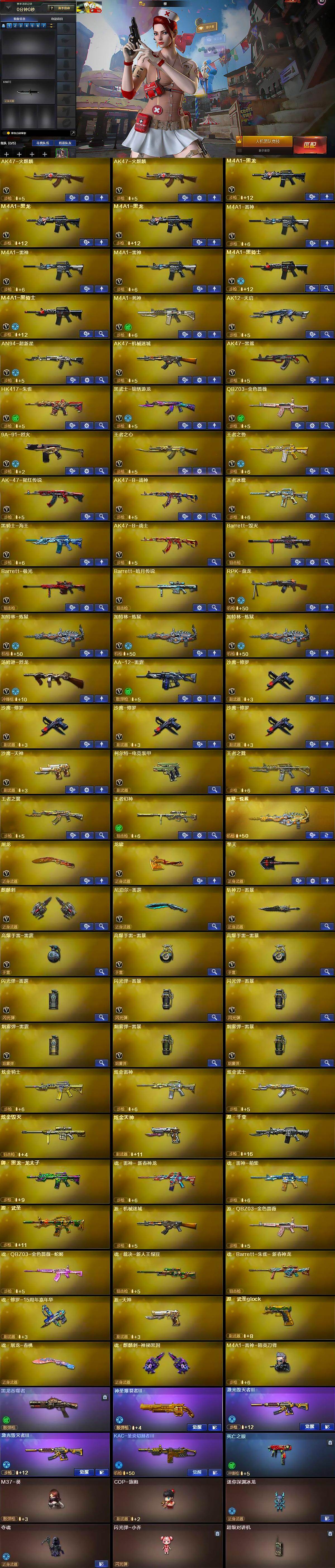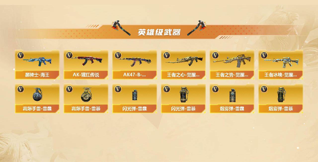 【英雄级武器】:AK47-火麒麟*2,M4A1-黑龙*3,M4A1-雷神*3,M4A1-黑骑士*2,M4A1-死神,AK12-天启,AN94-超新星,AK47-机械迷城,AK47-黑鲨,HK417-朱雀,黑武士-锦绣游龙,QBZ03-金色蔷薇,9A91-烈火,王者之心-觉醒版,王者之势-觉醒版,AK-47-猩红传说,AK47-B-战神,王者冰魄-觉醒版,黑骑士-海王,AK47-B-战士,Barrett-毁灭,Barrett-极光,Barrett-暗月传说,RPK-盘龙,加特林-炼狱*3,汤姆逊-烈龙,AA-12-雷霆,沙鹰-修罗*4,沙鹰-天神,柯尔特-电竞装甲,屠龙,龙啸,擎天,麒麟刺,尼泊尔-雷霆,斩神刀-雷暴,高爆手雷-雷霆,高爆手雷-雷暴*2,闪光弹-雷霆,闪光弹-雷暴*2,烟雾弹-雷霆,烟雾弹-雷暴*2