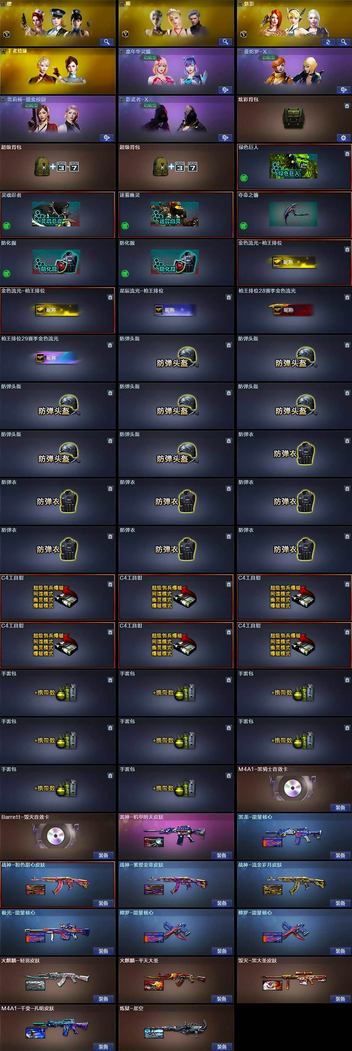 - [16328023]吉林一区-23V-0王者-0炫金 【热门武器】:M200-幻神 【音效卡】:炼狱-百战金芒-庆典舞曲音效卡,死神-雪域霜狐-怀旧音效卡 【皮肤】:幻神-电竞之星 皮肤,雷神-暗月,雷神-诺拉 皮肤,M4A1-再燃火线,雷神-神秘按键 皮肤,火麒麟-心动糖果,修罗-冠军之魂,轻型军用手斧-再燃火线 【角色】:战地猎狐,雪域霜狐,乔伊教练,修道士,云海玲珑,暗夜-X,虎妞,嘉年华灵狐,零-水下丽影,灵狐者-X,潘多拉-X,青霞仙子,斯沃特-X,新娜塔莎 【暴走生化】:超级对讲机 【英雄级武器】:AK47-火麒麟,M4A1-雷神,无影-神兵利器,黑武士-锦绣游龙,死神-雪域霜狐,黑骑士-海王,AWM-裁决,M200-幻神,炼狱-百战金芒,幻灵之锋,麒麟刺-百战金芒,高爆手雷-幻灵,闪光弹-幻灵,烟雾弹-幻灵,M4A1-赤狱骑士,M4A1-苍鸣雷神,Barrett-碧霄极光 【道具】:BS战队炫彩背包,云山科技背包,百战金芒炫彩背包,背包-洛丽塔,超级背包,雪域霜狐炫彩背包,女皇终结者-魔龙之吻,救世主-黑桃战神,黄金生化钩,绿色巨人,灵魂忍者*2,变异宝贝,迷雾幽灵*2,夺命之镰,防化服*3,金色流光-枪王排位*2,星辰流光-枪王排位,流光-鎏金之域,枪王排位28赛季金色流光,枪王排位29赛季金色流光,语音特效-盛典烟火,语音特效-怀旧,雪域霜狐表情,萌萌小葵表情,防弹头盔*4,防弹衣*4,C4工具钳*5,手雷包*5 【特殊枪械】:
