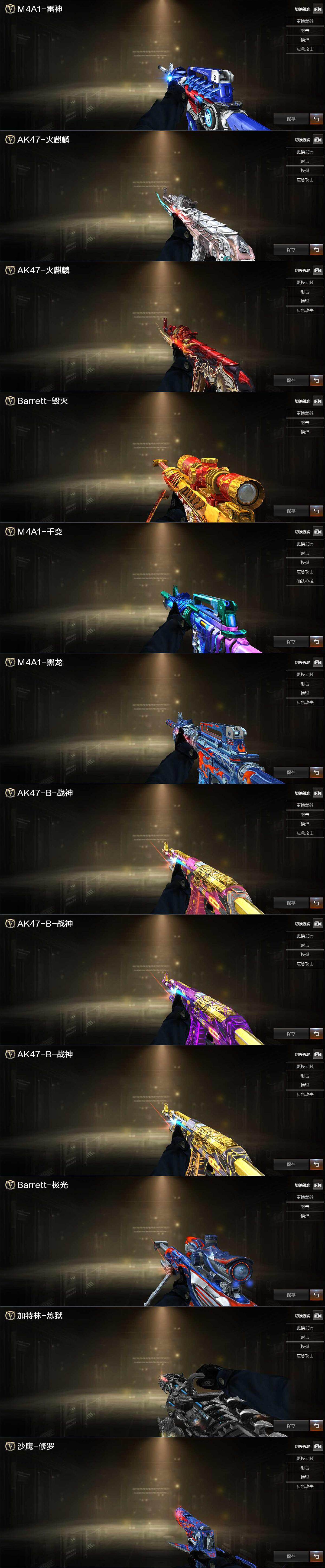 【源级武器】:源-千变,御·黑龙-龙太子,魂·雷神-新春神龙,魂·雷神-萌柴,御·黑骑士-冰魄,源·超新星,源·武圣,源·机械迷城,源-金色蔷薇,魂·QBZ03-金色蔷薇-蛇姬,魂·裁决-新人王绿豆,魂·Barrett-朱雀- 新春神龙,魂·修罗-15周年嘉年华,源·天神,源·武圣glock,魂·屠龙-春桃,魂·麒麟刺-神秘黑洞
