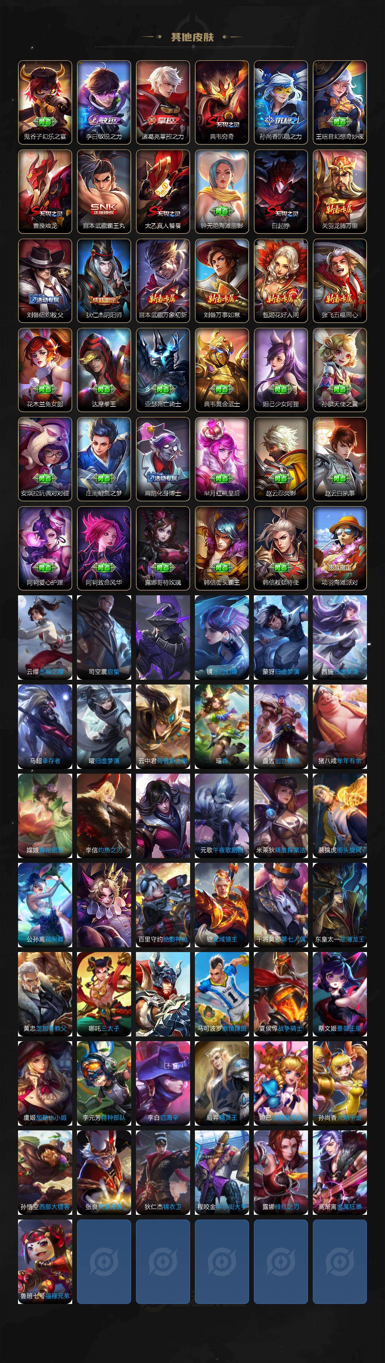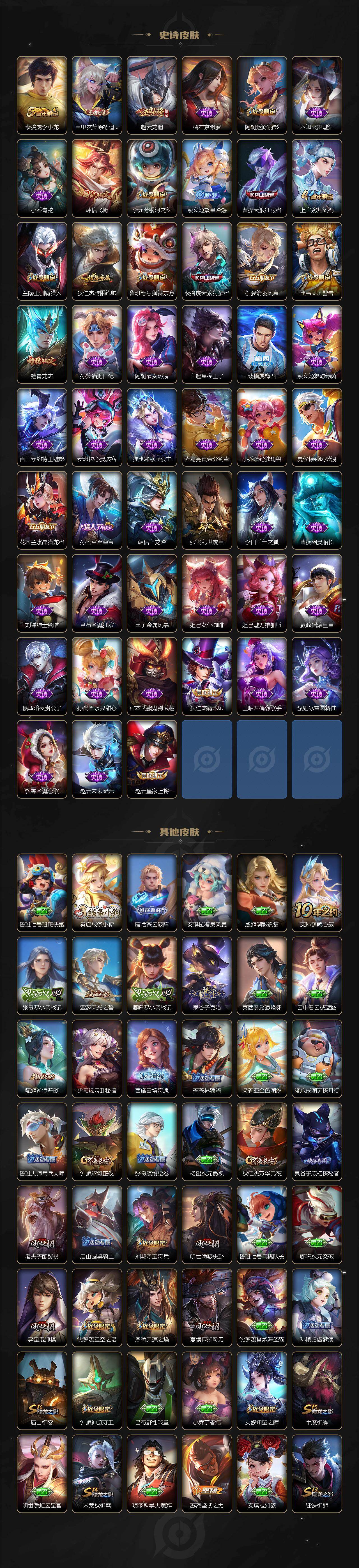 【史诗皮肤】:周瑜线条小狗,小乔线条小狗,女娲万灵启世,公孙离涂山容容,西施诗语江南,云中君纤云弄巧,裴擒虎李小龙,百里玄策原初追逐者,赵云龙胆,橘右京修罗,阿轲迷踪丽影,不知火舞魅语,小乔青蛇,韩信飞衡,李元芳银河之约,蔡文姬繁星吟游,曹操天狼征服者,上官婉儿梁祝,兰陵王驯魔猎人,狄仁杰鹰眼统帅,鲁班七号狮舞东方,裴擒虎天狼狩猎者,伽罗箭羽风息,典韦蓝屏警告,铠青龙志,孙策猫狗日记,阿轲节奏热浪,白起星夜王子,裴擒虎梅西,蔡文姬舞动绿茵,百里守约特工魅影,安琪拉心灵骇客,雅典娜冰冠公主,诸葛亮黄金分割率,小乔缤纷独角兽,夏侯惇乘风破浪,花木兰水晶猎龙者,孙悟空至尊宝,韩信白龙吟,张飞乱世虎臣,李白千年之狐,曹操幽灵船长,刘禅绅士熊喵