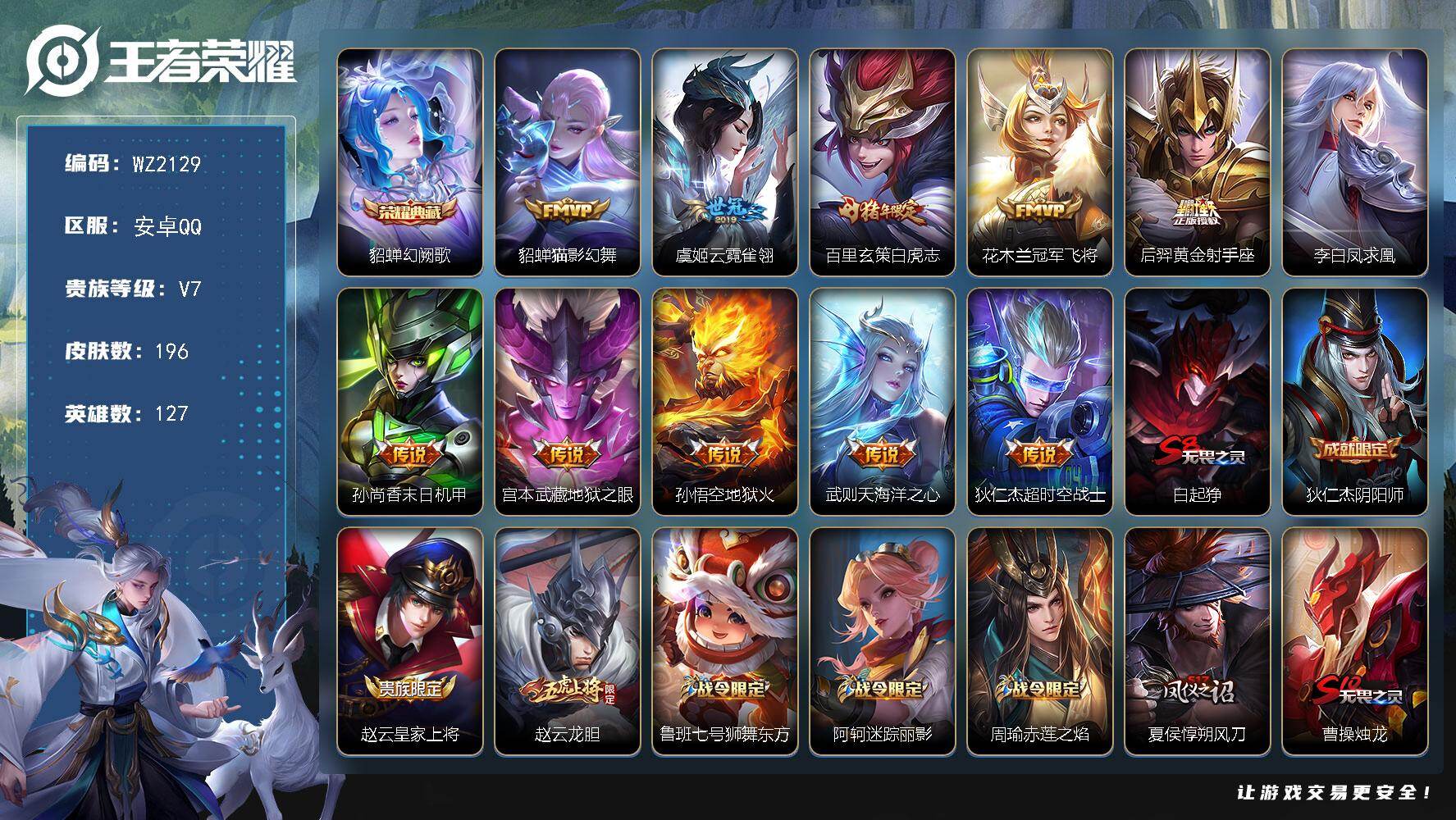 - [11297694]V10 5典藏 1无双 41传说 125英雄 387皮肤 典藏英雄武则天 可修改实名 女号 优质装备:天鹅之梦(小乔典藏),鸣剑·曳影,全息碎影(猴子典藏),九霄神辉(木兰典藏),银白咏叹调(倪克斯侍卫),青丘·九尾(妲己无双),黄金射手座,冠军飞将,云鹰飞将(小将军),绛天战甲(鸡嘴战神),猫影幻舞,久胜战神,炽阳神光,一念神魔,末日机甲-孙尚香(绿蚂蚱),地狱火,仲夏夜之梦(大飞蛾),音你心动-小乔,零号·赤焰,海洋之心,地狱之眼,音你心动-周瑜,李逍遥,乞巧织情,时之恋人-刘备(电焊工),游龙清影(小青龙),淬星耀世,超时空战士-狄仁杰,遇见胡旋,挚爱之约,挚爱花嫁,无双飞将,青丘·九尾,遇见神鼓,艾琳觅芳踪 传说皮:幻光神枪 珍宝阁皮:妄想食味,蔷薇恋人,女武神,玩趣恶龙 限定皮:至尊宝,白虎志(电光耗子),凤求凰(白切鸡),太华(伽罗年限),梅西,异界灵契(白毛香),傲雪梅枪,补天,绯月行,时之彼端,神威(电光马子),飞衡(韩信年限),遇见飞天,高山流水,匿光决锋者,怒海麟威,五谷丰年,青龙志(铠年限),冰锋战神,武圣,游园惊梦,梁祝,御风骁将(吕布年限),龙胆,逐梦之翼,岱宗(典韦年限),虎魄,天狼绘梦者,逐梦之影,玄武志(苏烈年限),朱雀志(守约年限),如梦令-后羿,孙行者,猪悟能,青春决赛季,蜜橘之夏,热情桑巴,美猴王,匿光追影者,女儿国国王,寅虎·瑞焰(虎皮蛋子),时之祈愿-瑶(瑶传限),百木心枪,玉兔公主,无尽星芒,唐三藏,时之奇旅-妲己 史诗皮:石田雨龙,遇见神鹿,紫霞仙子,苍穹之光,电玩小子(小书包),白龙吟,黄金分割率,特工魅影,千年之狐,永昼,电玩·爆裂旋风,江河有灵,偶像歌手,龙骑士(小龙虾),暗夜猫娘,魅语,无限星赏官,晚萤,冰冠公主,青蛇,末日机甲-吕布,猫狗日记-孙策,猫狗日记-大乔,时之恋人-孙尚香,乱世虎臣,节奏热浪,修罗,女仆咖啡,摇滚巨星,水果甜心,绅士熊喵,天才门将,星夜王子,心灵骇客,时之奇旅-安琪拉,功夫厨神,德古拉伯爵,暗隐猎兽者,幽灵船长,鬼剑武藏,暗渊魔法,心灵战警,天秀·启明,舞动绿茵,地狱岩魂,繁星吟游(呼啦呼啦),拒霜思,缤纷独角兽,乘风破浪,逐浪之夏,水晶猎龙者,曙光守护者,箭羽风息,唤灵魅影,金属风暴,原初追逐者,圣诞狂欢,圣诞恋歌,鹰眼统帅,王者之锤,暗夜贵公子,魅力维加斯,黎明之约,