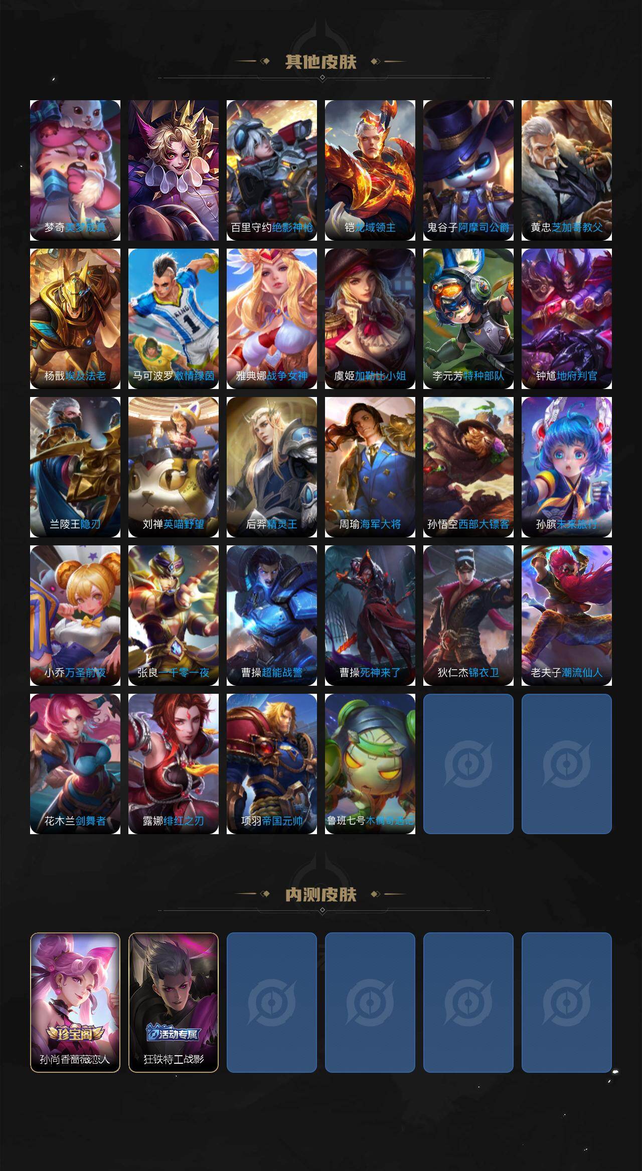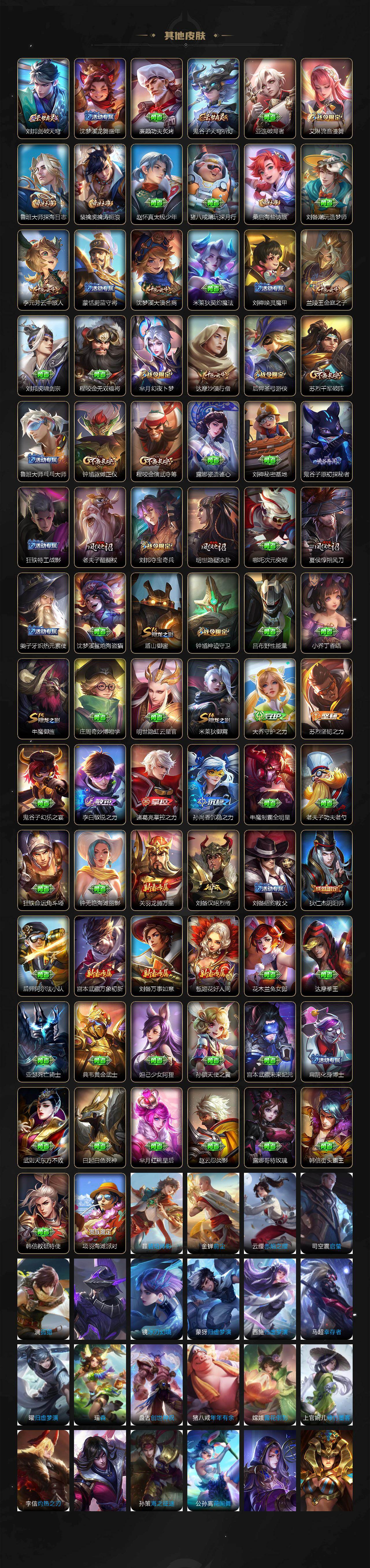 【限定皮肤】:姜子牙天穹之誓,狄仁杰阴阳师,赵云皇家上将,赵云百木心枪,孙尚香蔷薇恋人,鲁班七号狮舞东方,阿轲迷踪丽影,芈月幻夜卜梦,元歌无心,夏侯惇朔风刀,夏侯惇匿光决锋者,马可波罗山海玄木吟,狄仁杰魔术师,达摩沙漠行僧,项羽海滩派对,老夫子醍醐杖,程咬金演武夺筹,刘邦夺宝奇兵,兰陵王金庭之子,孙悟空零号赤焰,孙悟空孙行者,牛魔御旌,后羿圣弓游侠,李元芳云中旅人,钟馗神迹守卫,钟馗驱傩正仪,干将莫邪真爱魔法,蔡文姬繁星吟游,鬼谷子原初探秘者,鬼谷子五谷丰年,黄忠火炮绅士,苏烈千军破阵,公孙离玉兔公主,沈梦溪大漠名商,明世隐疑决卦,裴擒虎擒涛扼浪,米莱狄御霄,云中君时之祈愿,伽罗天狼溯光者,盾山御銮,上官婉儿梁祝,嫦娥拒霜思,鲁班大师探海日志,桑启海盐诗旅,艾琳流音漫舞,司空震地狱燃心,鬼谷子天穹祈灯,沈梦溪龙舞盛年,刘邦剑破天穹