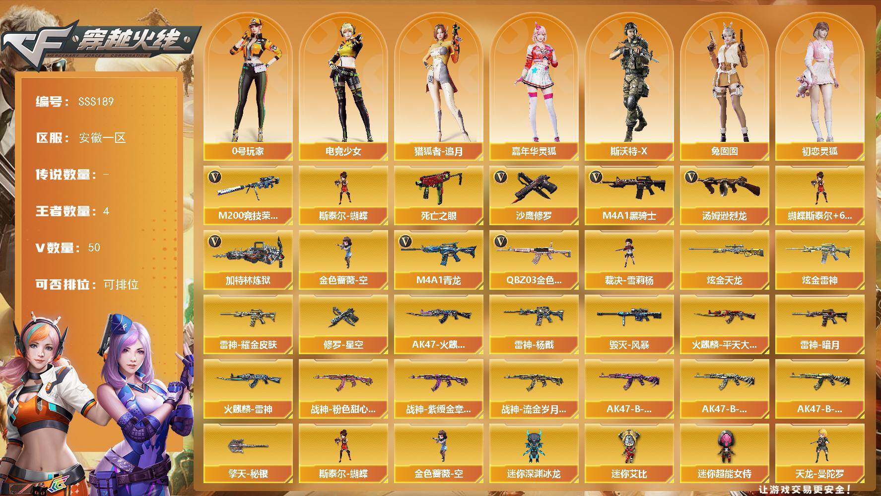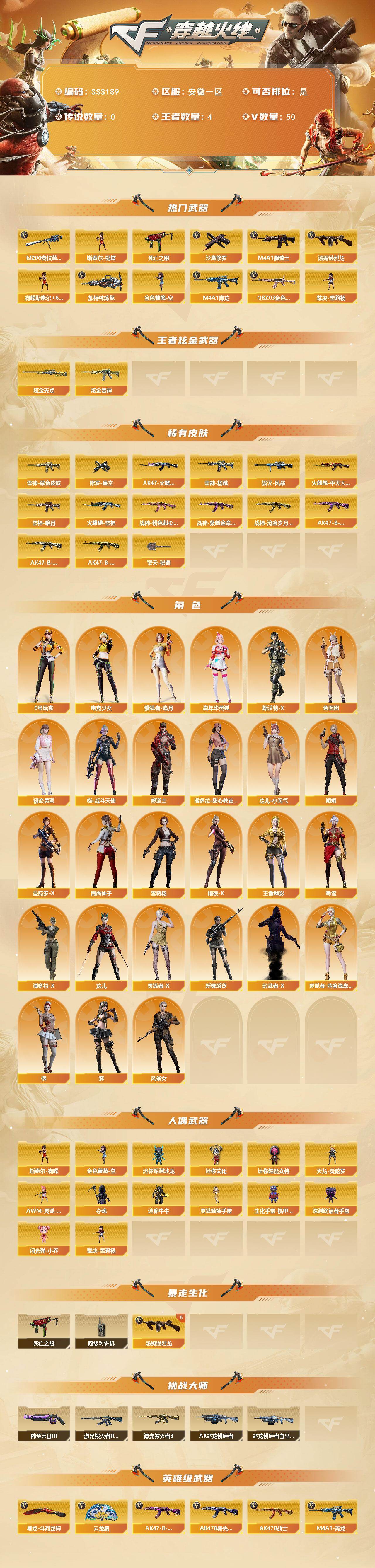 [17539628]安徽一区-56V-4王者武器数-2炫金武器数 【热门武器】:QBZ03-金色蔷薇,M4A1-青龙,M200-竞技荣光,死亡之眼,M4A1-黑骑士,汤姆逊-烈龙*6,加特林-炼狱*2,金色蔷薇-空,斯泰尔-蝴蝶,裁决-雪莉杨,沙鹰-修罗*2 【王者炫金武器】:炫金雷神,炫金天龙 【皮肤】:雷神-暗月,雷神-耀金皮肤,雷神-杨戬,火麒麟-雷神,AK47-火麒麟-传奇EVEN,火麒麟-平天大圣,毁灭-风暴,战神-粉色甜心皮肤,战神-紫绶金章皮肤,战神-流金岁月皮肤*3,AK47-B-常胜将军-曹操,AK47-B-常胜将军-刘备,AK47-B-常胜将军-孙权,修罗-星空,擎天-秘银 【角色】:葵,樱,王者-魅影,修道士,暗夜-X,初恋灵狐,电竞少女,风暴女*2,嘉年华灵狐,娟娟,猎狐者-追月,0号玩家,灵狐者-X,灵狐者-黄金海岸,龙儿,龙儿-小淘气,曼陀罗-X,潘多拉-X,潘多拉-甜心教官,青霞仙子,斯沃特-X,蜀雪,兔囡囡,新娜塔莎,雪莉杨,樱-战斗天使,影武者-X 【人偶武器】:裁决-雪莉杨,天龙-曼陀罗,金色蔷薇-空,斯泰尔-蝴蝶,AWM-灵狐-15周年嘉年华,迷你深渊冰龙,夺魂,迷你牛牛,生化手雷-机甲核心*2,深渊终结者手雷*3,闪光弹-小乔,迷你艾比,迷你超能女侍,灵狐娃娃手雷 【暴走生化】:死亡之眼,超级对讲机 【挑战大师】:AK47-冰龙粉碎者,冰龙粉碎者-白马银枪*3,激光毁灭者III-白马银枪*2,激光毁灭者III,神圣爆裂者-末日III*2 【英雄级武器】:AK47-火麒麟,M4A1-黑龙,M4A1-雷神,M4A1-黑骑士,M4A1-死神,M4A1-青龙,无影-神兵利器,QBZ03-云龙,黑武士-锦绣游龙,QBZ03-金色蔷薇,M4A1-猎神,王者之心-觉醒版,AK-47-猩红传说*2,AK47-B-战神,黑骑士-海王,AK47-B-常胜将军,AK47-B-身先士卒,AK47-B-战士*2,Barrett-毁灭,AWM-裁决,M200-竞技荣光,Barrett-暗月传说,加特林-炼狱*2,汤姆逊-烈龙*6,沙鹰-修罗*2,沙鹰-天神,屠龙*2,龙啸,擎天*3,麒麟刺,尼泊尔-雷霆,王者之啸-觉醒版,王者之击-觉醒版*2,屠龙-斗烈龙驹,云龙扇,高爆手雷-雷霆,闪光弹-雷霆,闪光弹-竞技荣光,烟雾弹-雷霆 【源级武器】:源·火麒麟*3,魂·火麒麟-百