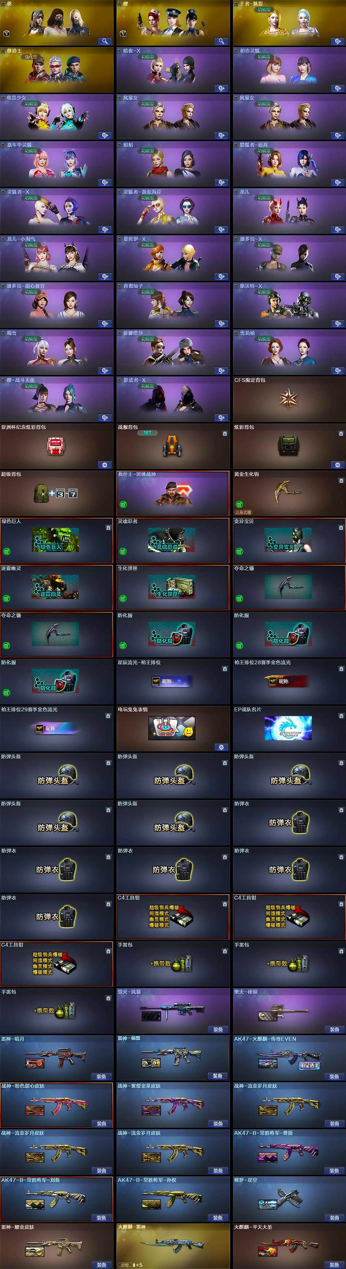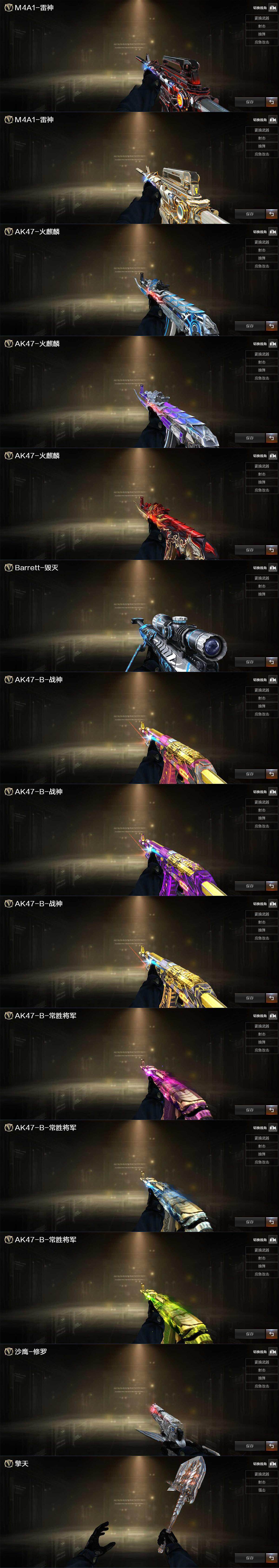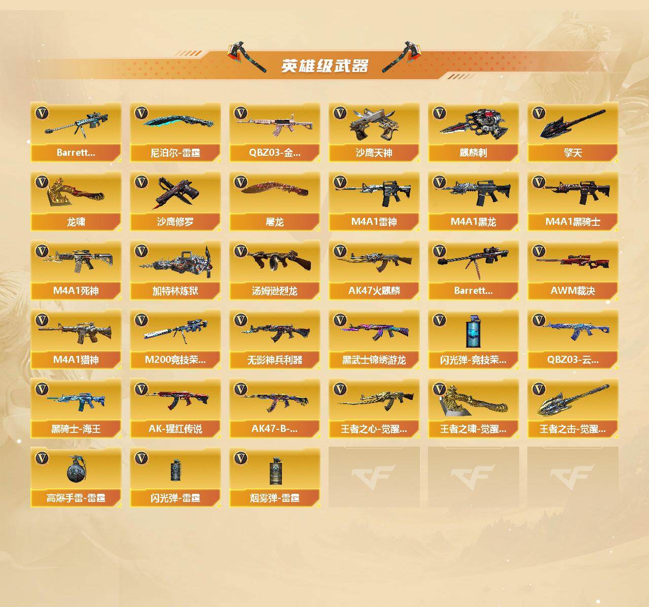 【英雄级武器】:AK47-火麒麟,M4A1-黑龙,M4A1-雷神,M4A1-黑骑士,M4A1-死神,M4A1-青龙,无影-神兵利器,QBZ03-云龙,黑武士-锦绣游龙,QBZ03-金色蔷薇,M4A1-猎神,王者之心-觉醒版,AK-47-猩红传说*2,AK47-B-战神,黑骑士-海王,AK47-B-常胜将军,AK47-B-身先士卒,AK47-B-战士*2,Barrett-毁灭,AWM-裁决,M200-竞技荣光,Barrett-暗月传说,加特林-炼狱*2,汤姆逊-烈龙*6,沙鹰-修罗*2,沙鹰-天神,屠龙*2,龙啸,擎天*3,麒麟刺,尼泊尔-雷霆,王者之啸-觉醒版,王者之击-觉醒版*2,屠龙-斗烈龙驹,云龙扇,高爆手雷-雷霆,闪光弹-雷霆,闪光弹-竞技荣光,烟雾弹-雷霆