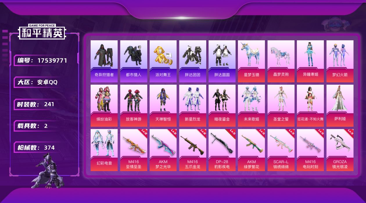 [17539771]安卓 手Q-无敌战神框-12粉装-25特效枪-2载具-7粉色飞行器-127475热力值-19王牌印记-241套装-374枪皮