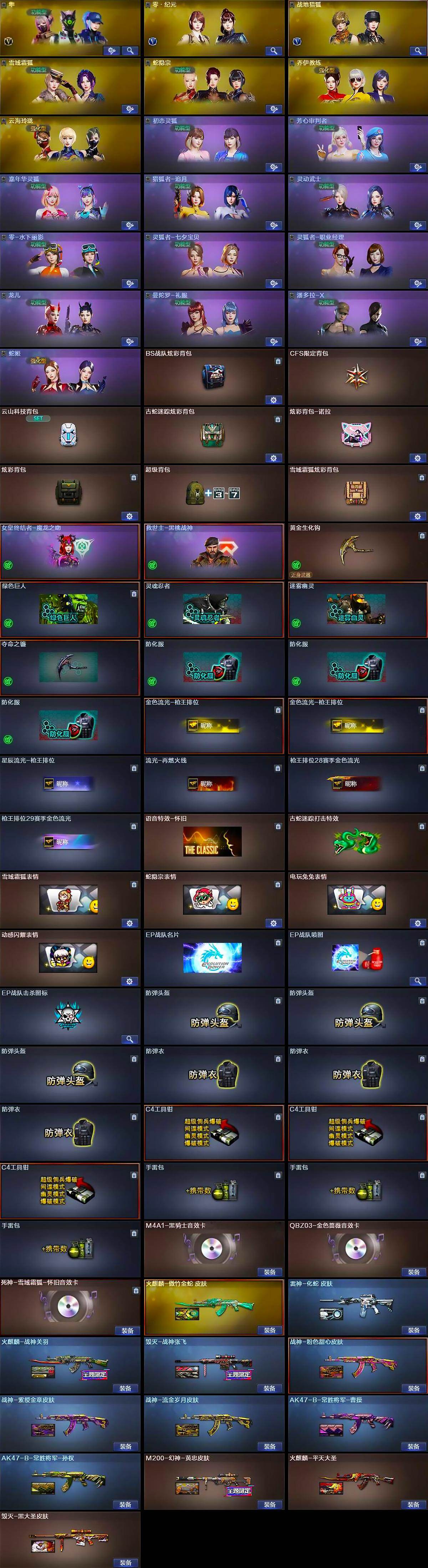 【英雄级武器】:AK47-火麒麟,M4A1-雷神*2,M4A1-黑骑士,M4A1-青龙,HK417-朱雀,金色蔷薇-古蛇迷踪,死神-雪域霜狐,QBZ03-金色蔷薇,M4A1-猎神,烈火-动感闪耀,AK47-B-战神,王者白虎-觉醒版,白虎-电玩蓝兔,机械迷城-穹宇,Barrett-毁灭,M200-幻神,Barrett-金色蔷薇,沙鹰-修罗*2,天神-动感闪耀,修罗-古蛇迷踪,屠龙-动感闪耀,高爆手雷-竞技荣光,手雷-动感闪耀,高爆手雷-古蛇迷踪,闪光弹-雷暴,烟雾弹-古蛇迷踪,M4A1-赤狱骑士,AK47-竞魂无影