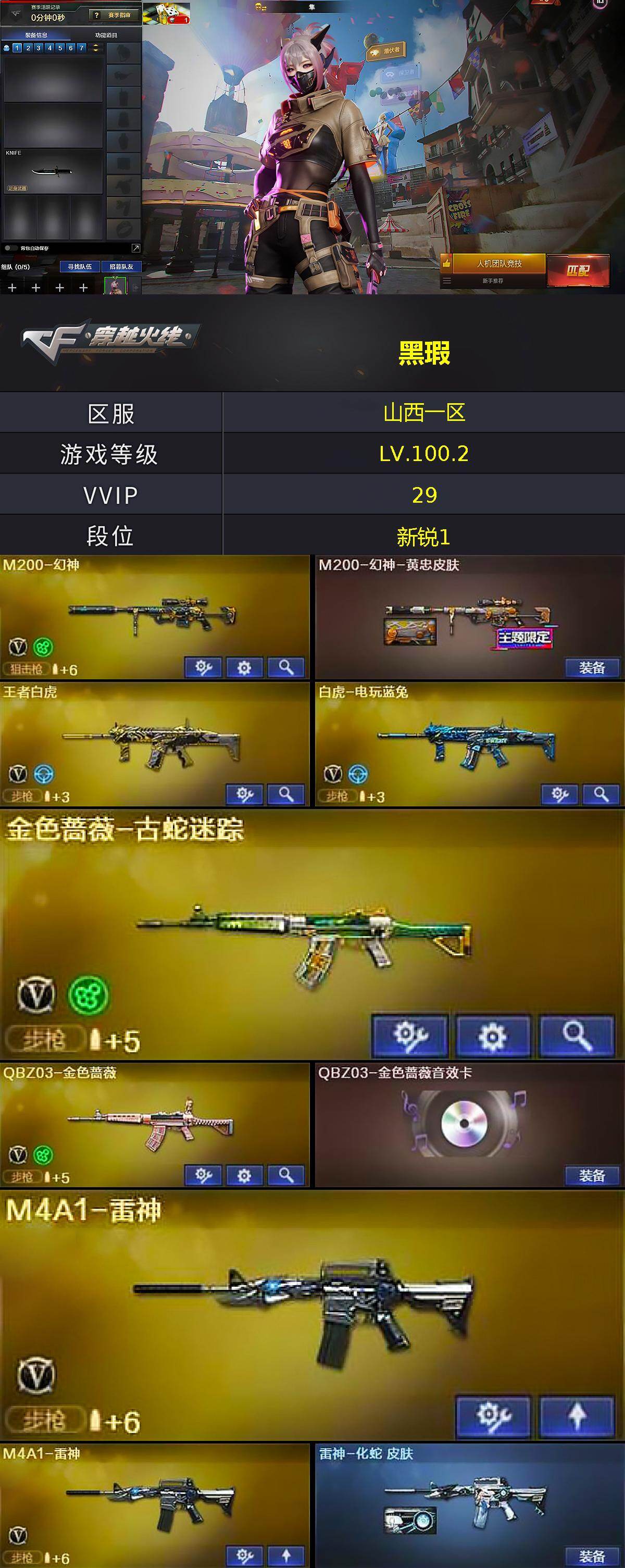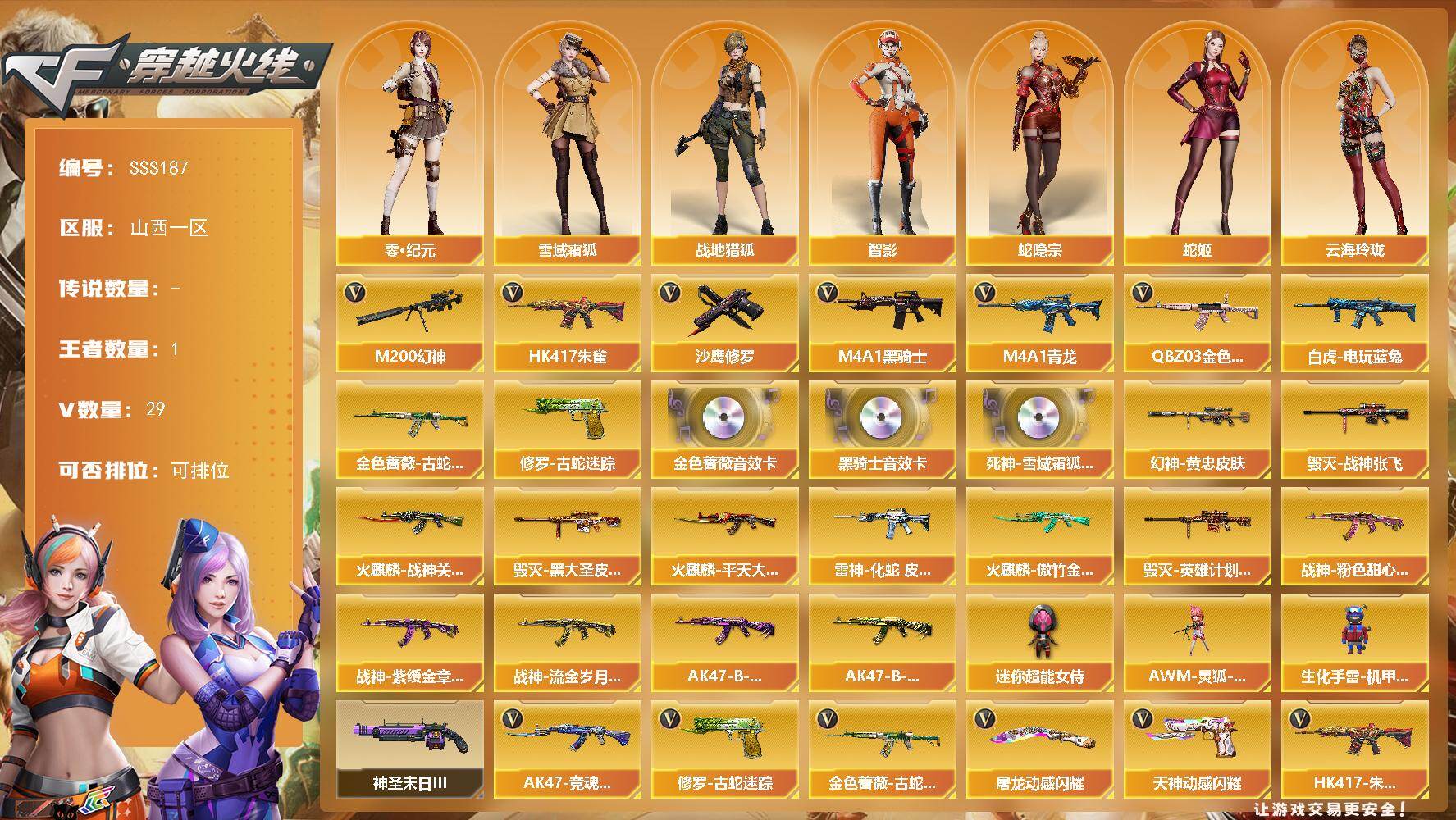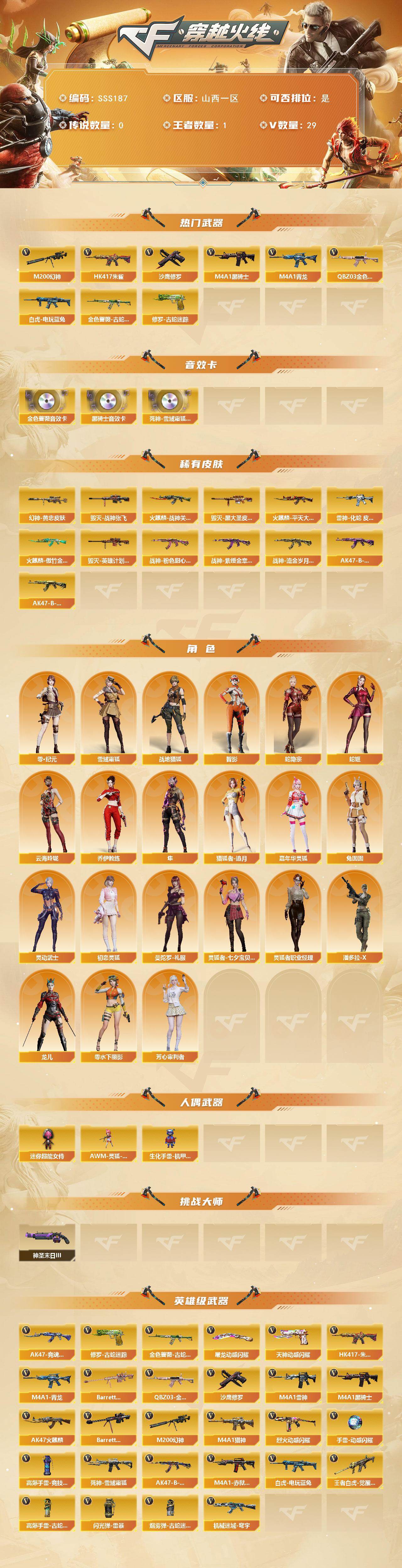 [17540823]山西一区-26V-1王者武器数-0炫金武器数 【热门武器】:QBZ03-金色蔷薇,HK417-朱雀,M4A1-青龙,M200-幻神,金色蔷薇-古蛇迷踪,修罗-古蛇迷踪,白虎-电玩蓝兔,M4A1-黑骑士,沙鹰-修罗*2 【音效卡】:M4A1-黑骑士音效卡,QBZ03-金色蔷薇音效卡,死神-雪域霜狐-怀旧音效卡 【皮肤】:M200-幻神-黄忠皮肤,雷神-化蛇 皮肤,火麒麟-战神关羽,火麒麟-平天大圣,火麒麟-傲竹金蛇 皮肤,毁灭-战神张飞,毁灭-黑大圣皮肤,毁灭-英雄计划 皮肤,战神-粉色甜心皮肤,战神-紫绶金章皮肤,战神-流金岁月皮肤,AK47-B-常胜将军-曹操,AK47-B-常胜将军-孙权 【角色】:隼,零·纪元,战地猎狐,雪域霜狐,蛇隐宗,乔伊教练,云海玲珑,初恋灵狐,芳心审判者,嘉年华灵狐,猎狐者-追月,灵动武士,零-水下丽影,灵狐者-七夕宝贝,灵狐者-职业经理,龙儿,曼陀罗-礼服,潘多拉-X,蛇姬,兔囡囡,智影 【人偶武器】:AWM-灵狐-15周年嘉年华,生化手雷-机甲核心,迷你超能女侍 【挑战大师】:神圣爆裂者-末日III 【英雄级武器】:AK47-火麒麟,M4A1-雷神*2,M4A1-黑骑士,M4A1-青龙,HK417-朱雀,金色蔷薇-古蛇迷踪,死神-雪域霜狐,QBZ03-金色蔷薇,M4A1-猎神,烈火-动感闪耀,AK47-B-战神,王者白虎-觉醒版,白虎-电玩蓝兔,机械迷城-穹宇,Barrett-毁灭,M200-幻神,Barrett-金色蔷薇,沙鹰-修罗*2,天神-动感闪耀,修罗-古蛇迷踪,屠龙-动感闪耀,高爆手雷-竞技荣光,手雷-动感闪耀,高爆手雷-古蛇迷踪,闪光弹-雷暴,烟雾弹-古蛇迷踪,M4A1-赤狱骑士,AK47-竞魂无影 【源级武器】:源·雷神*2,魂·M4A1-雷神-化蛇*2,魂·雷神-诺拉,魂·雷神-神秘按键,魂·雷神-新春神龙*2,御·雷神-小白龙,魂·黑骑士-现代金属,魂·黑骑士-幻能朋克,魂·黑骑士-破浪10年,御·黑骑士·哪吒闹海*3,魂·黑武士-锋芒破茧,御·超新星-圣诞,源·武圣,魂·龙血-锋芒破茧*2,魂·HK417-朱雀-凤灵*3,灵·HK417-朱雀-甜蜜火力*2,源·HK417-朱雀,魂·QBZ03-金色蔷薇-古蛇迷踪,魂·QBZ03-金色蔷薇-萌杀,魂·QBZ03-金色蔷薇-蛇姬,QBZ03-文殊坊,魂·9A91·