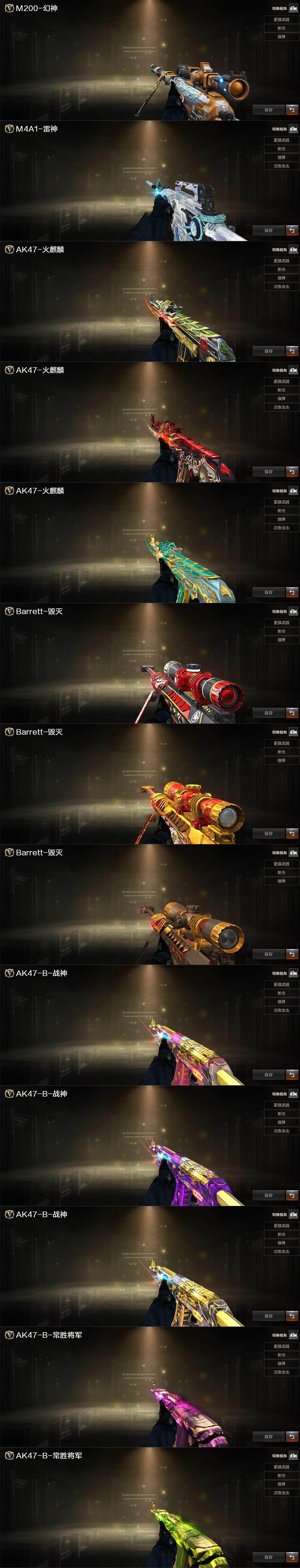 【皮肤】:M200-幻神-黄忠皮肤,雷神-化蛇 皮肤,火麒麟-战神关羽,火麒麟-平天大圣,火麒麟-傲竹金蛇 皮肤,毁灭-战神张飞,毁灭-黑大圣皮肤,毁灭-英雄计划 皮肤,战神-粉色甜心皮肤,战神-紫绶金章皮肤,战神-流金岁月皮肤,AK47-B-常胜将军-曹操,AK47-B-常胜将军-孙权