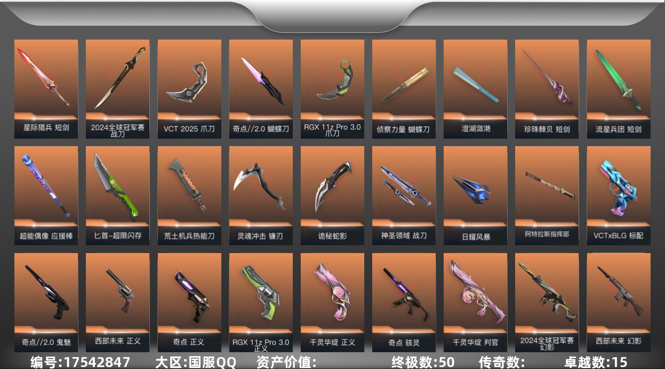 [17542847]【157】【套装】:2024全球冠军赛套装,VCT 2025 赛季套装,西部未来套装,RGX 11z Pro//3.0套装,千灵华绽套装,奇点//2.0套装,回火礼包:奇点套装,英雄之选套装 【英雄】:幻棱,炼狱,维斯,暮蝶,钛狐,壹决,铁臂,捷风,雷兹,幽影,不死鸟,贤者,猎枭,蝰蛇,零,芮娜,奇乐,尚勃勒,霓虹,斯凯,夜露,星礈,K/O,海神,盖可,黑梦,钢锁 【近战武器】:近战武器-2024全球冠军赛 战刀,近战武器-碎心裂刃,近战武器-侦察力量 蝴蝶刀,近战武器-奇点//2.0 蝴蝶刀,近战武器-VCT 2025 爪刀,近战武器-紫金爪刀,近战武器-RGX 11z Pro//3.0 爪刀,近战武器-落英飞旋,近战武器-镭切,近战武器-澄湖潋滟,近战武器-未来开拓者,近战武器-珍珠棘贝 短剑,近战武器-流星兵团 短剑,近战武器-超能偶像 应援棒,近战武器-超限闪存 匕首,近战武器-定海神珍,近战武器-荒土机兵 热能刀,近战武器-灵魂冲击 镰刃,近战武器-诡秘蛇影 军刀,近战武器-神圣领域 战刀,近战武器-日耀风暴 遗器,近战武器-阿特拉斯指挥部 甩棍,近战武器-星际猎兵 短剑 【狂徒】:狂徒-光明哨兵,狂徒-洪荒怒焰,狂徒-混沌序曲,狂徒-机动狂飙,狂徒-奇点//2.0,狂徒-塑水宗,狂徒-偃月苍龙,狂徒-创·纪元,狂徒-噬影者,狂徒-RGX 11z Pro,狂徒-掠影,狂徒-盖世英雄,狂徒-盖亚的复仇,狂徒-日冕雄师,狂徒-紫阙金琅,狂徒-超能偶像,狂徒-荒土机兵,狂徒-流星兵团,狂徒-诡秘蛇影 【幻影】:幻影-2024全球冠军赛,幻影-奇点,幻影-千灵华绽,幻影-西部未来,幻影-般若假面,幻影-侦察力量,幻影-超限闪存,幻影-珍珠棘贝,幻影-神圣领域,幻影-聚合之力,幻影-纳米打击,幻影-末日之翼,幻影-西部未来 【戍卫】:戍卫-天界神兵,戍卫-超能偶像,戍卫-珍珠棘贝,戍卫-浮光跃金,戍卫-逆冲蛮牛,戍卫-战术熊与伙伴们,戍卫-月球哨兵,戍卫-折光棱晶 【獠犬】:獠犬-神圣领域,獠犬-采蜜小蜂队,獠犬-复古浪潮,獠犬-模拟赫兹,獠犬-逆冲蛮牛 【冥驹】:冥驹-千灵华绽,冥驹-堕天遗武,冥驹-起源,冥驹-荒土机兵,冥驹-复古浪潮,冥驹-模拟赫兹,冥驹-星云暗涌 【飞将】:飞将-西部未来,飞将-聚合之力,飞将-战术熊与伙伴们,飞将-末日之翼 【莽侠】:莽侠