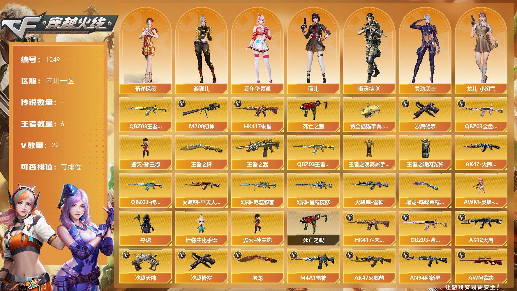 [17543708]四川一区-22V-6王者-0炫金 【热门武器】:QBZ03-金色蔷薇,HK417-朱雀,M200-幻神,QBZ-03-王者蔷薇,死亡之眼,毁灭-孙三炮,沙鹰-修罗,黄金猫猫手套-白鲨 【王者炫金武器】:王者之武,QBZ-03-王者蔷薇,王者之锋,王者之魄高爆手雷,王者之魄闪光弹 【皮肤】:幻神-星耀 皮肤,幻神-电流骇客 皮肤,QBZ03-传奇宠儿,火麒麟-雷神,AK47-火麒麟-传奇EVEN,火麒麟-平天大圣,屠龙-巅峰荣耀 皮肤 【角色】:王者-魅影,王者-迷迭香,奇洋探员,暗夜-X,飞虎队-X,风暴女,虎妞,嘉年华灵狐,灵动武士,灵狐者-黄金海岸,龙儿-小淘气,萌儿,斯沃特-X,铁骑荣耀,游珑儿 【人偶武器】:毁灭-孙三炮,AWM-灵狐-15周年嘉年华,夺魂,迷你生化手雷 【暴走生化】:死亡之眼 【英雄级武器】:M4A1-千变,AK47-火麒麟,M4A1-雷神,AK12-天启,AN94-超新星,HK417-朱雀,无影-神兵利器,黑武士-锦绣游龙,超新星-热带奇洋,QBZ03-金色蔷薇,黑骑士-海王,AWM-裁决,M200-幻神,沙鹰-修罗,沙鹰-天神*2,王者之魂-觉醒版,屠龙,龙啸-热带奇洋,高爆手雷-云龙*2,手雷-热带奇洋,闪光弹-云龙,烟雾弹-云龙 【道具】:AG战队炫彩背包,CFS限定背包,奇洋探员-海龟背包,热带奇洋炫彩背包,超级背包,灵魂忍者,变异宝贝,迷雾幽灵,夺命之镰,防化服,金色流光-枪王排位*2,星辰流光-枪王排位,枪王排位28赛季金色流光,枪王排位29赛季金色流光,语音特效-热带奇洋,热带奇洋表情,EP战队名片,EP战队喷图,EP战队击杀图标,防弹头盔*2,防弹衣*2,C4工具钳*3,手雷包*2 【特殊枪械】: