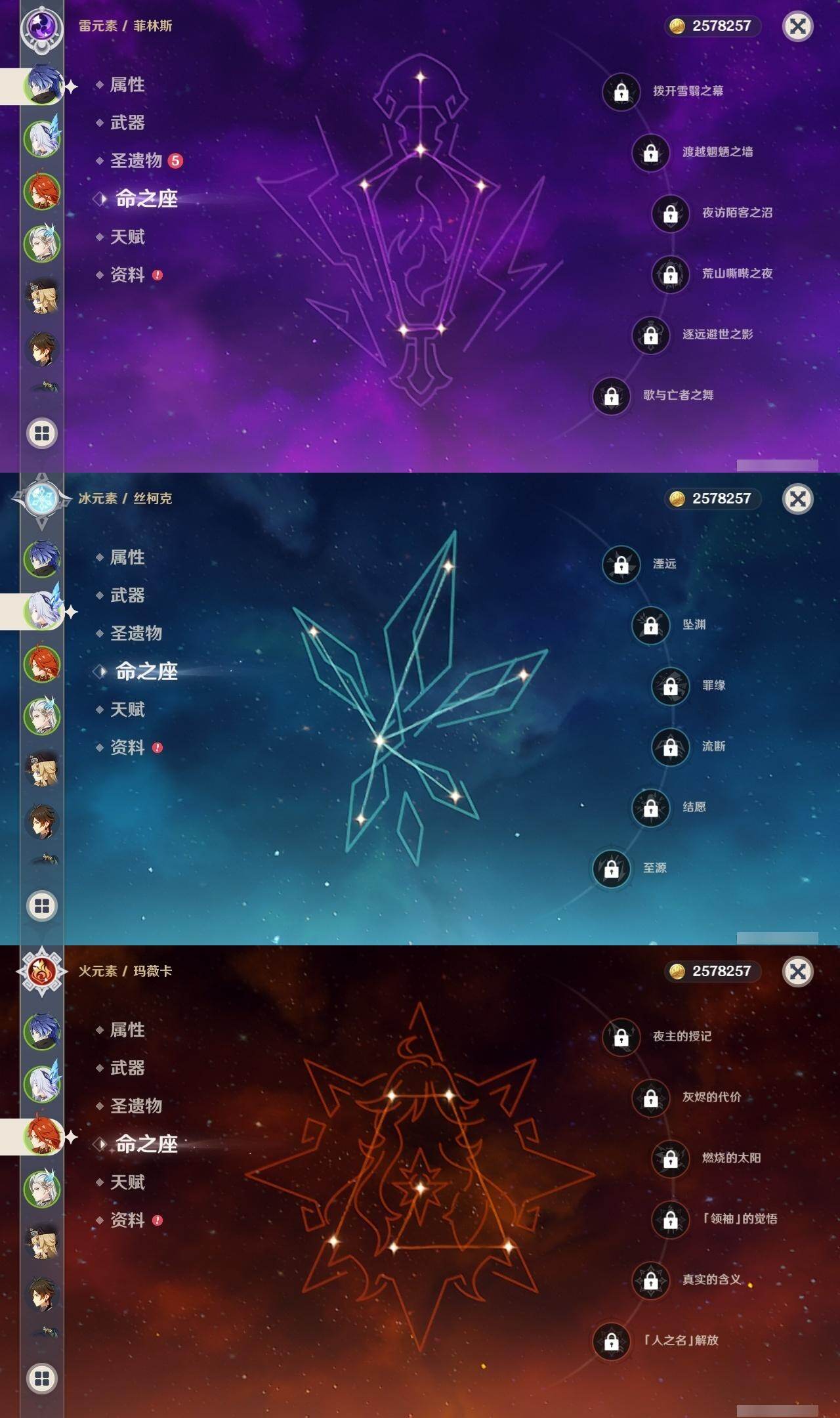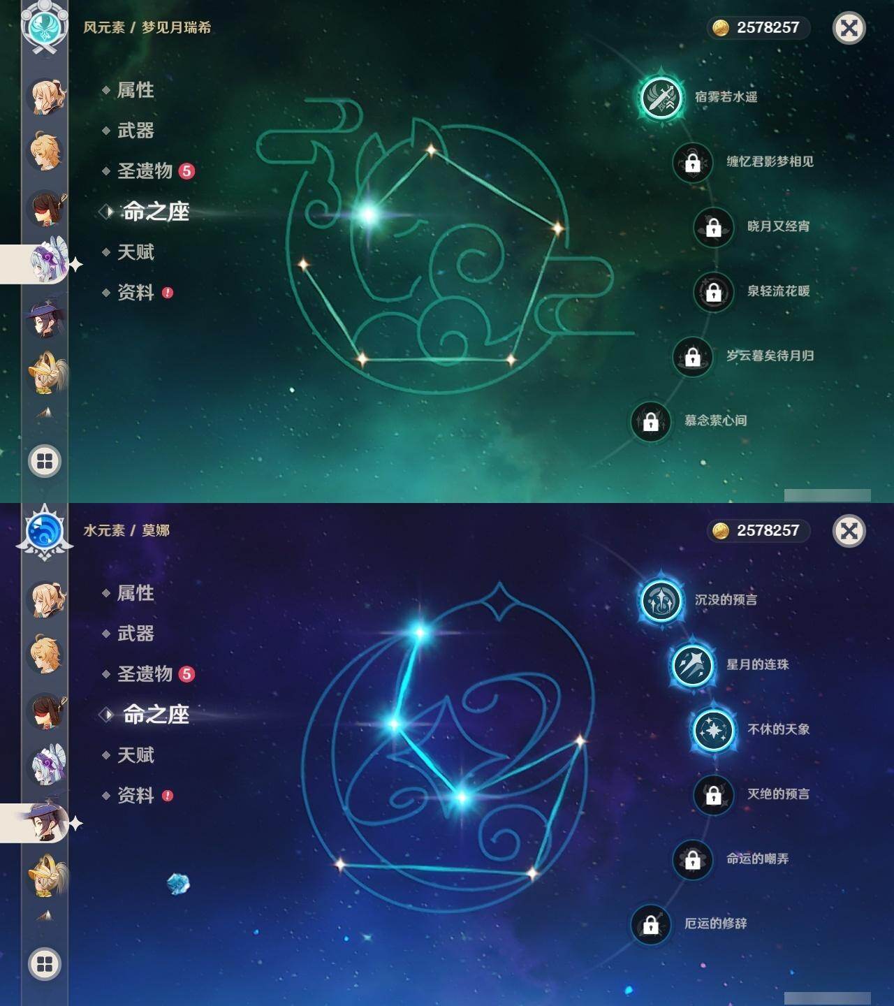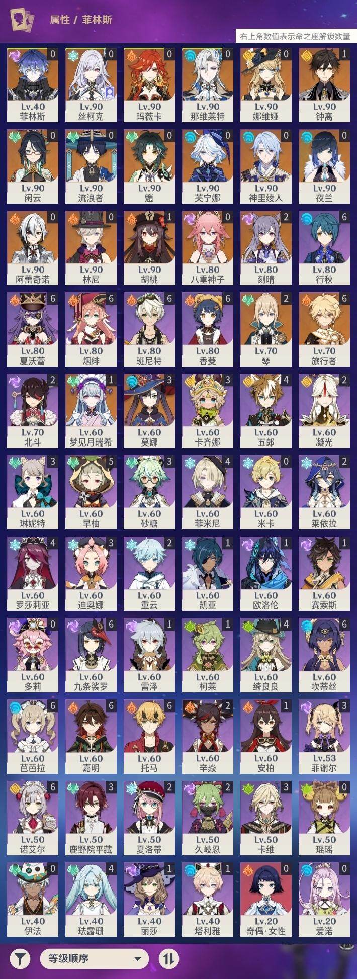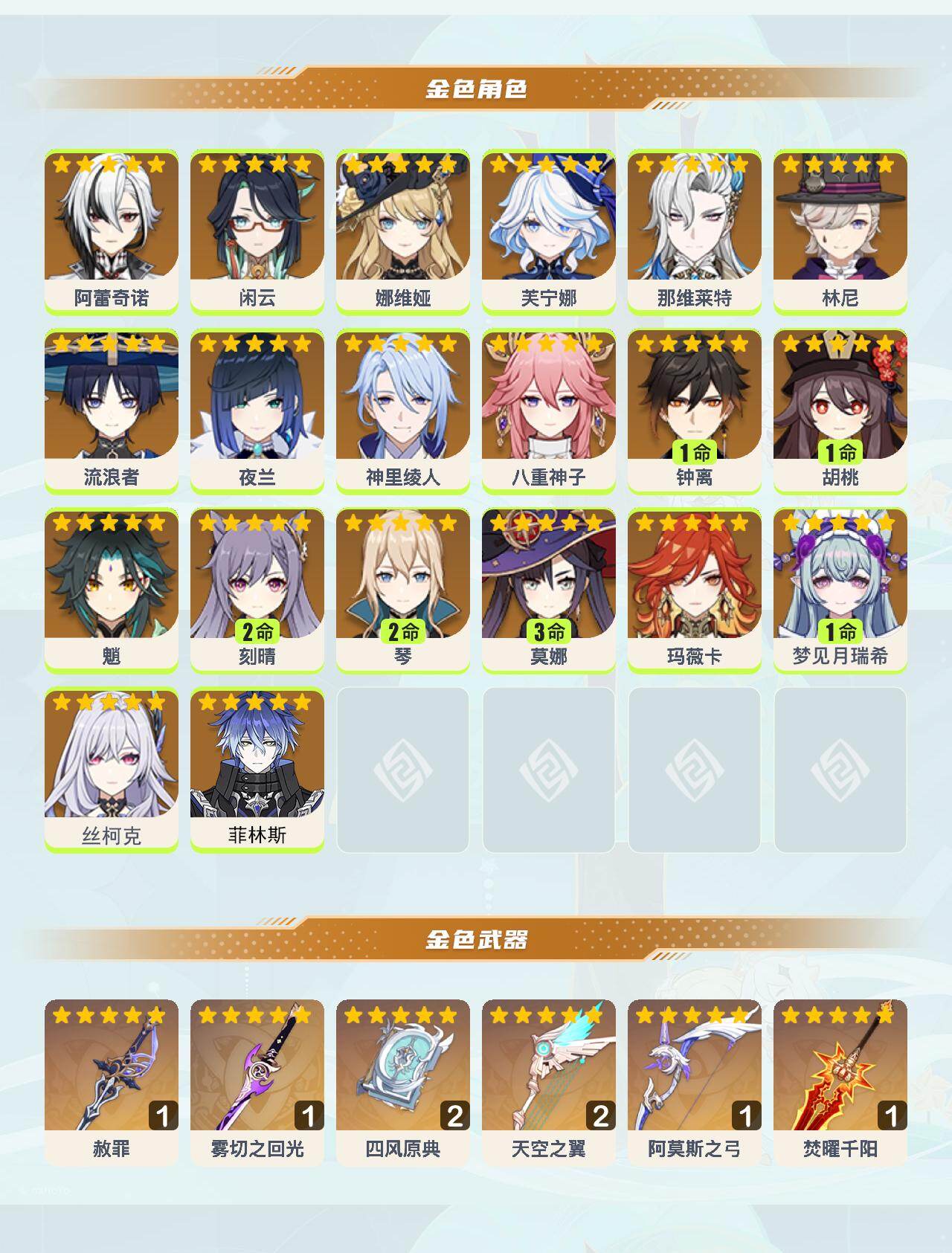 0命阿蕾奇诺,0命闲云,0命娜维娅,0命芙宁娜,0命那维莱特,0命林尼,0命流浪者,0命夜兰,0命神里绫人,0命八重神子,1命钟离,1命胡桃,0命魈,2命刻晴,2命琴,3命莫娜,0命玛薇卡,1命梦见月瑞希,0命丝柯克,0命菲林斯,精1赦罪,精1雾切之回光,精2四风原典,精2天空之翼,精1阿莫斯之弓,精1焚曜千阳