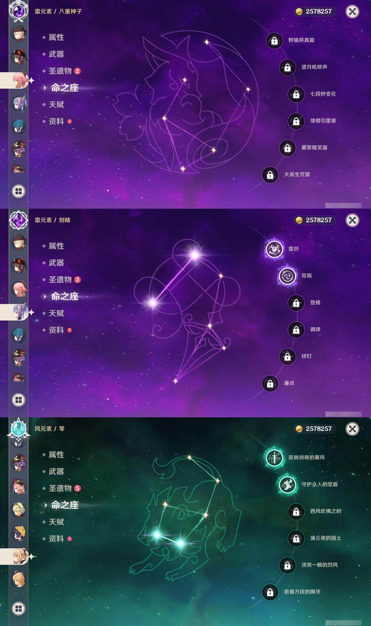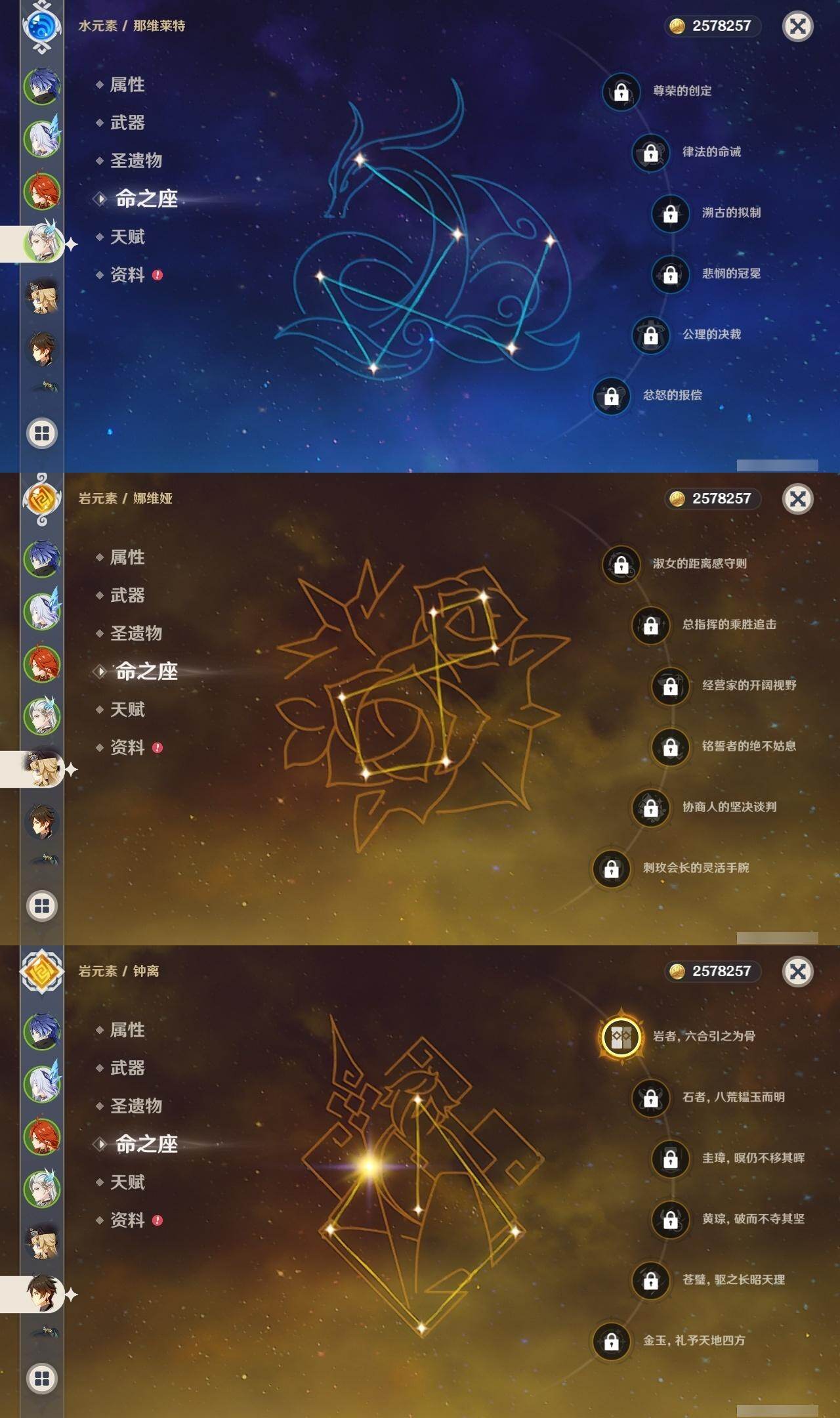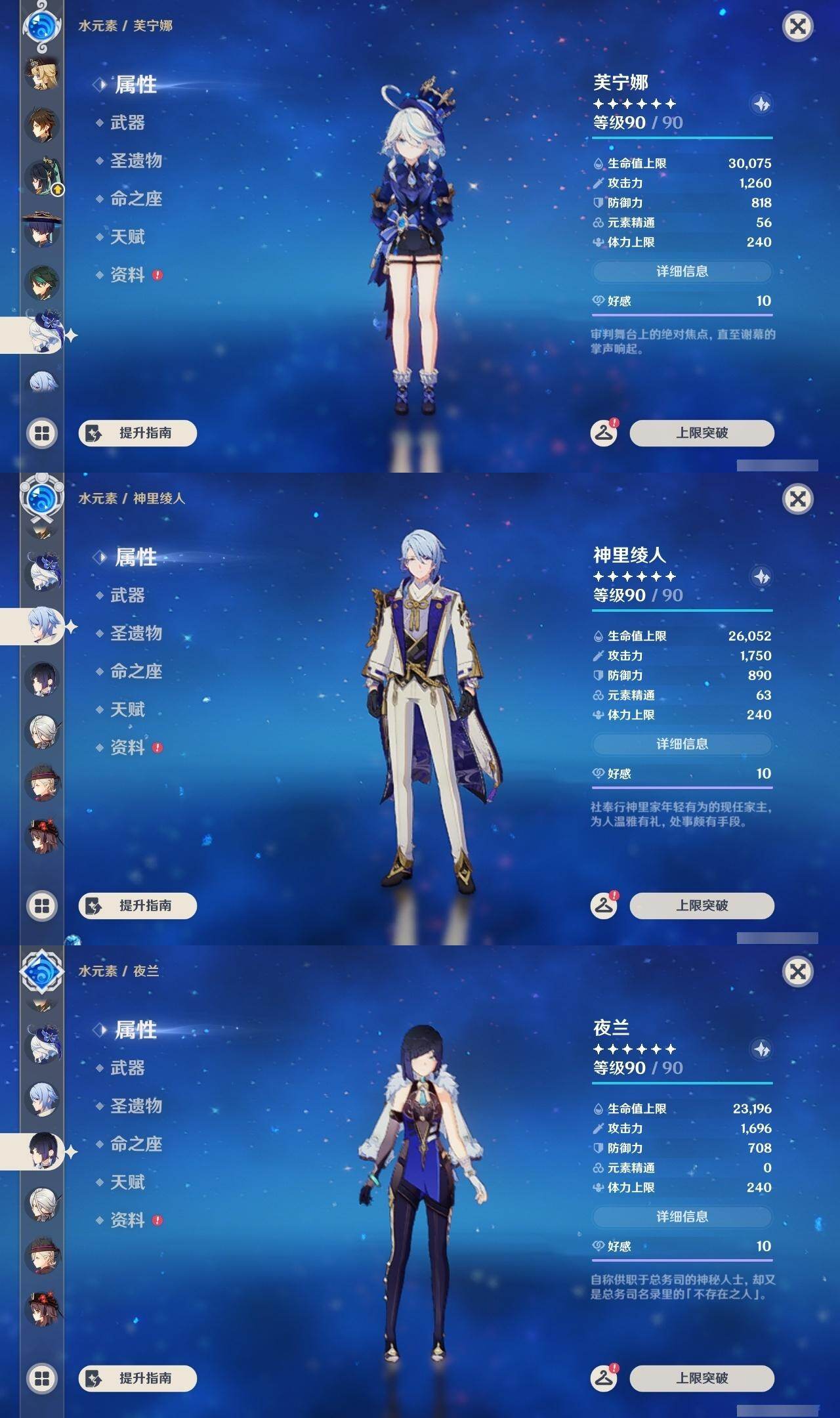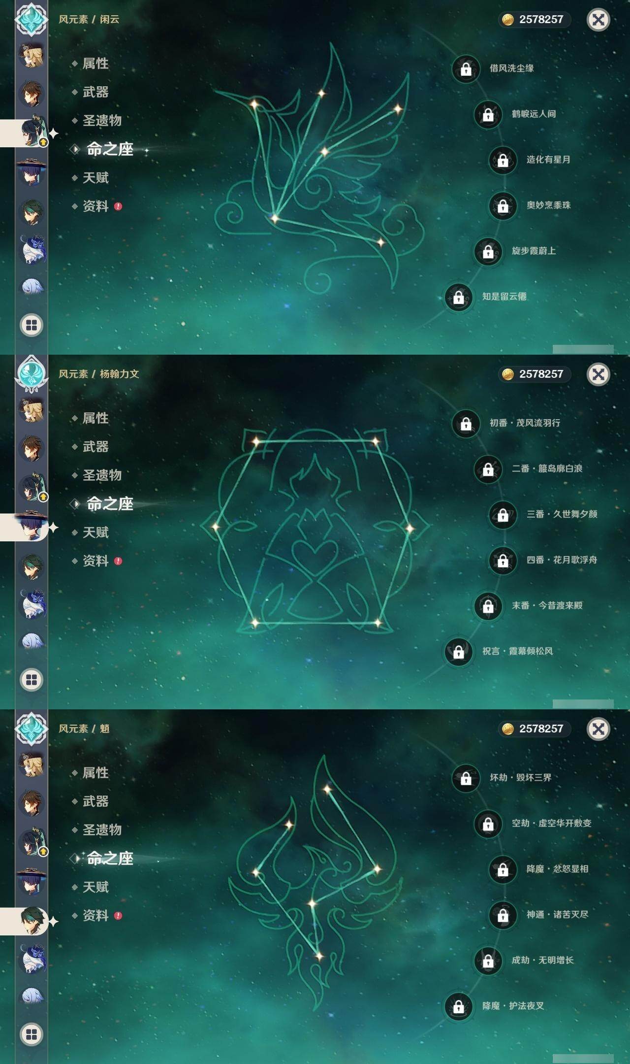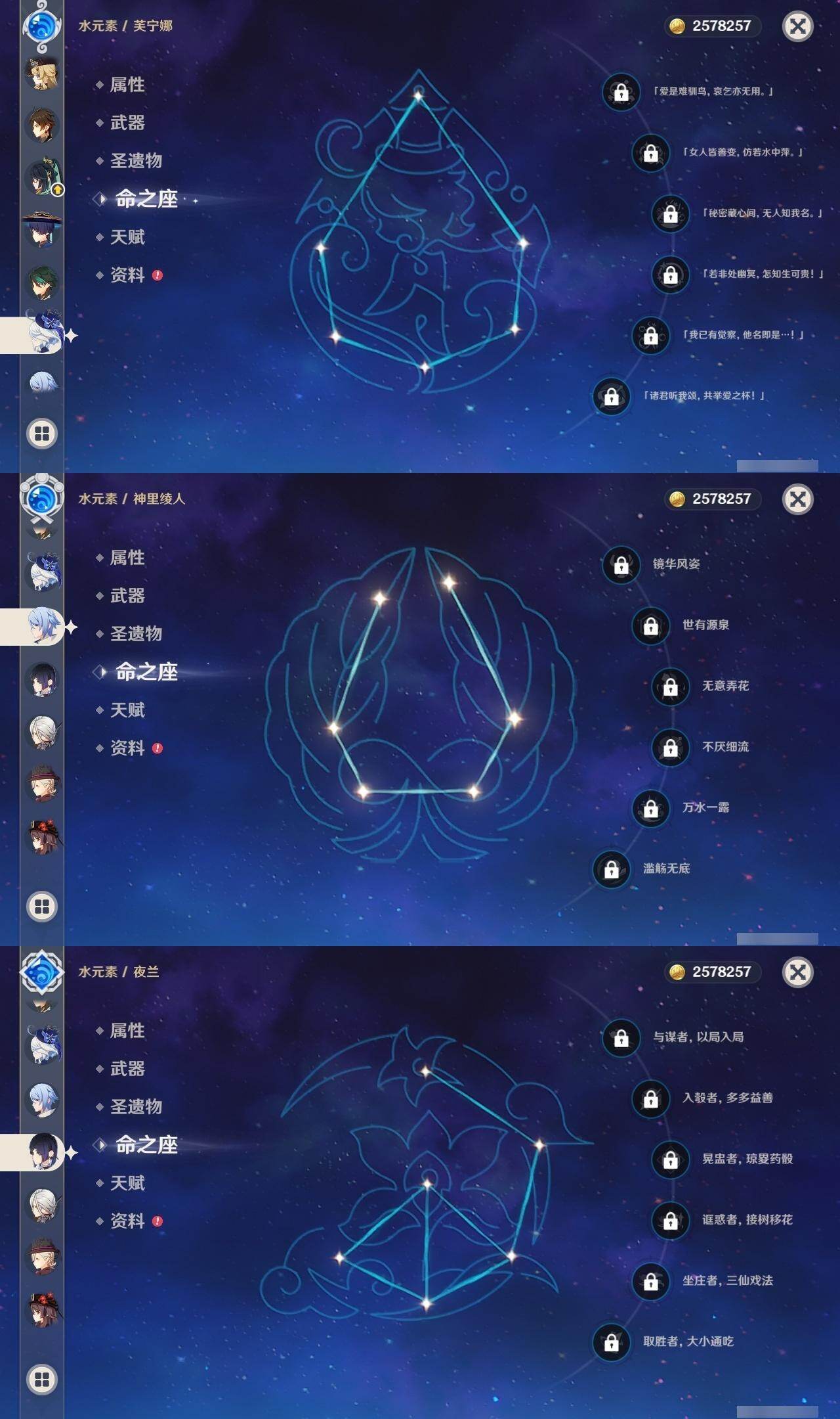 0命阿蕾奇诺,0命闲云,0命娜维娅,0命芙宁娜,0命那维莱特,0命林尼,0命流浪者,0命夜兰,0命神里绫人,0命八重神子,1命钟离,1命胡桃,0命魈,2命刻晴,2命琴,3命莫娜,0命玛薇卡,1命梦见月瑞希,0命丝柯克,0命菲林斯,精1赦罪,精1雾切之回光,精2四风原典,精2天空之翼,精1阿莫斯之弓,精1焚曜千阳