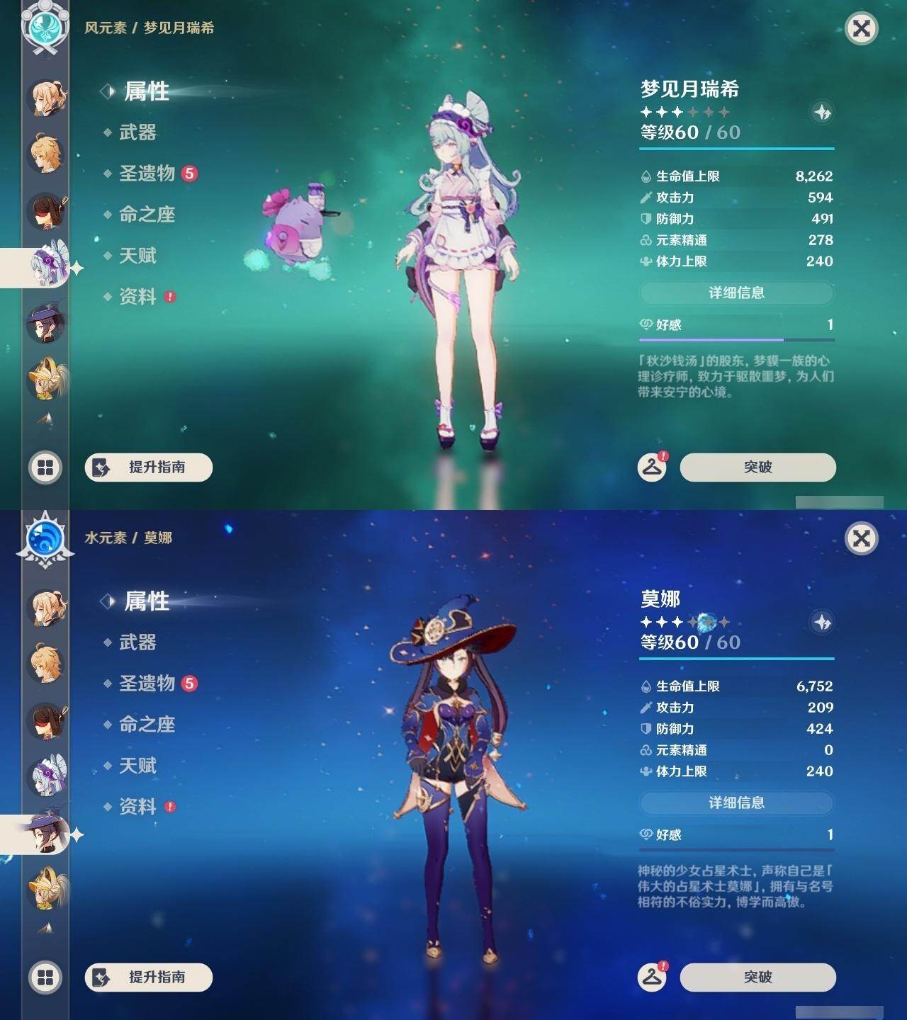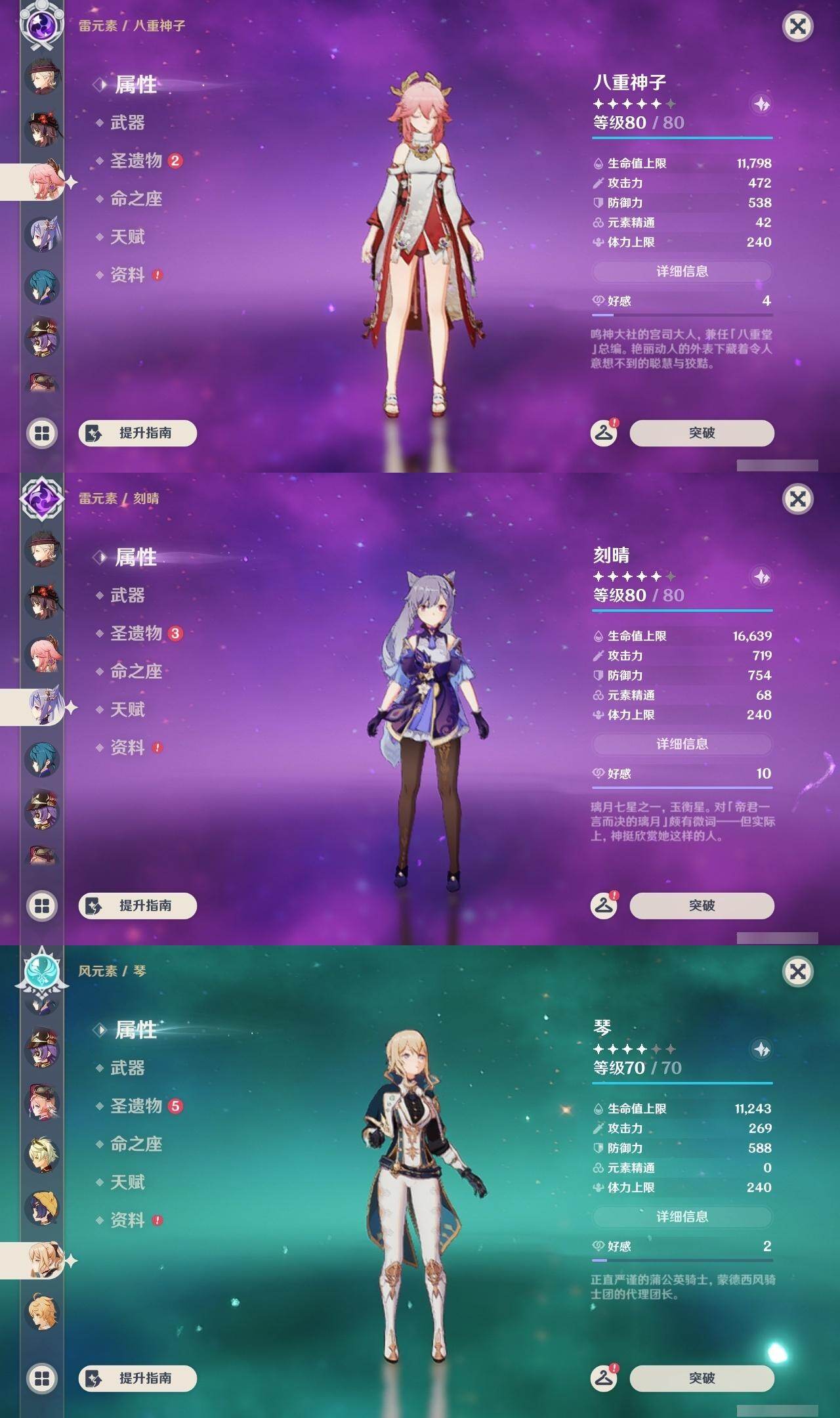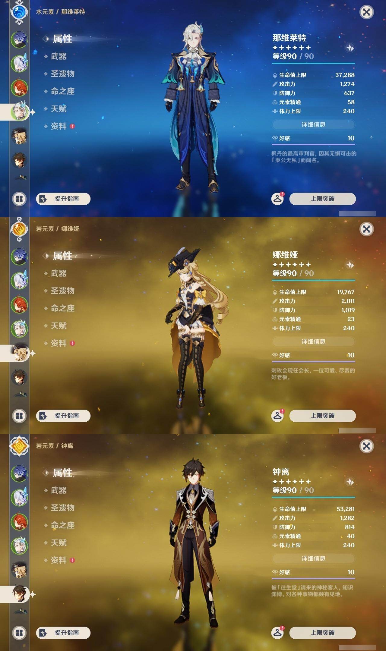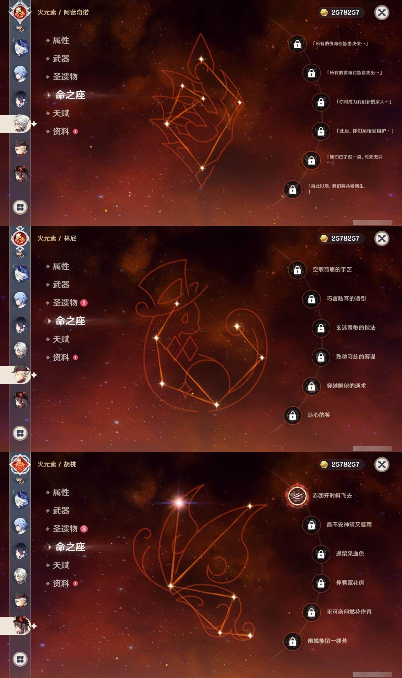 0命阿蕾奇诺,0命闲云,0命娜维娅,0命芙宁娜,0命那维莱特,0命林尼,0命流浪者,0命夜兰,0命神里绫人,0命八重神子,1命钟离,1命胡桃,0命魈,2命刻晴,2命琴,3命莫娜,0命玛薇卡,1命梦见月瑞希,0命丝柯克,0命菲林斯,精1赦罪,精1雾切之回光,精2四风原典,精2天空之翼,精1阿莫斯之弓,精1焚曜千阳