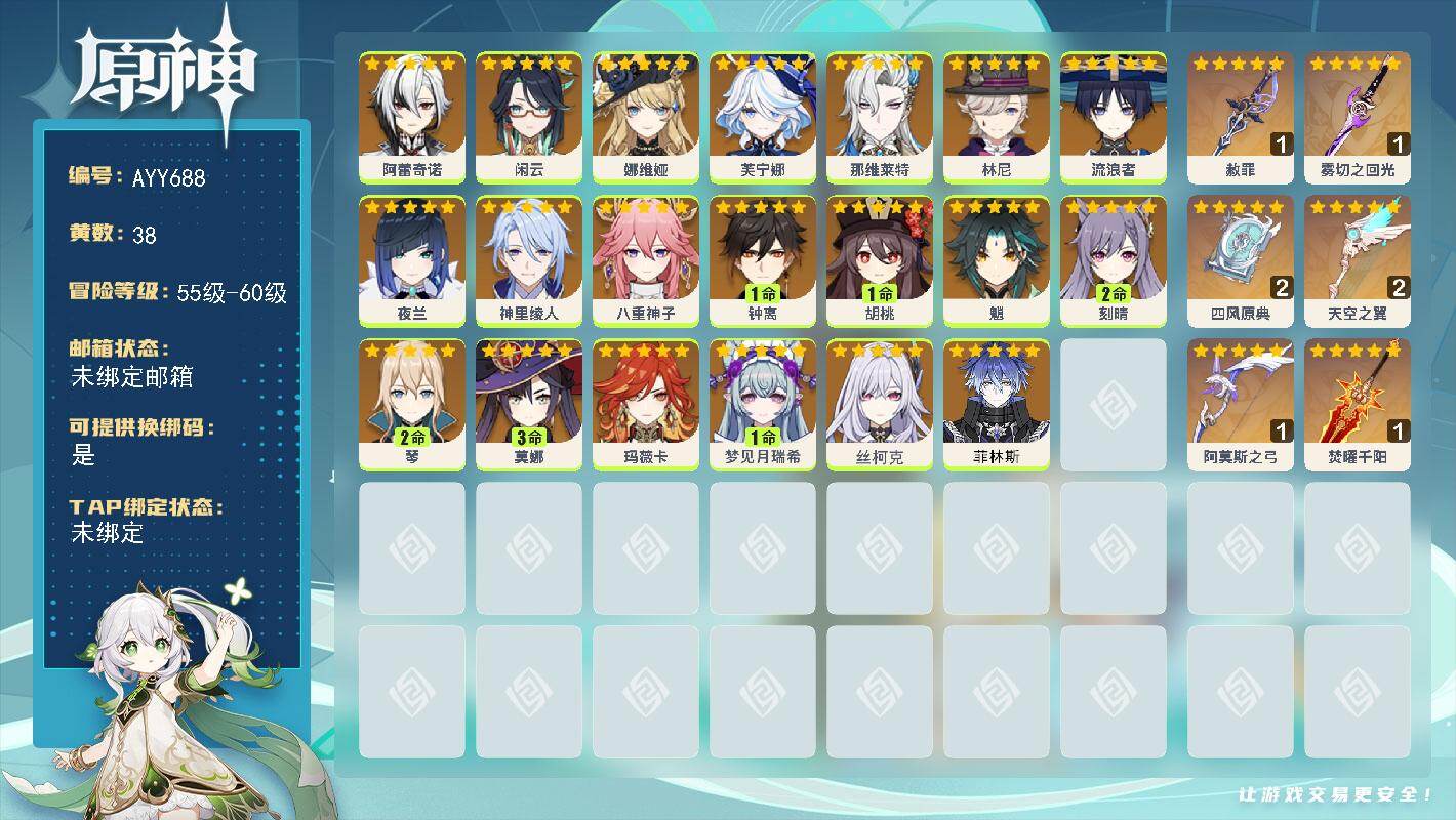 [17544167]59级/38黄/男主/20个五星角色/6个五星武器 0命阿蕾奇诺,0命闲云,0命娜维娅,0命芙宁娜,0命那维莱特,0命林尼,0命流浪者,0命夜兰,0命神里绫人,0命八重神子,1命钟离,1命胡桃,0命魈,2命刻晴,2命琴,3命莫娜,0命玛薇卡,1命梦见月瑞希,0命丝柯克,0命菲林斯,精1赦罪,精1雾切之回光,精2四风原典,精2天空之翼,精1阿莫斯之弓,精1焚曜千阳