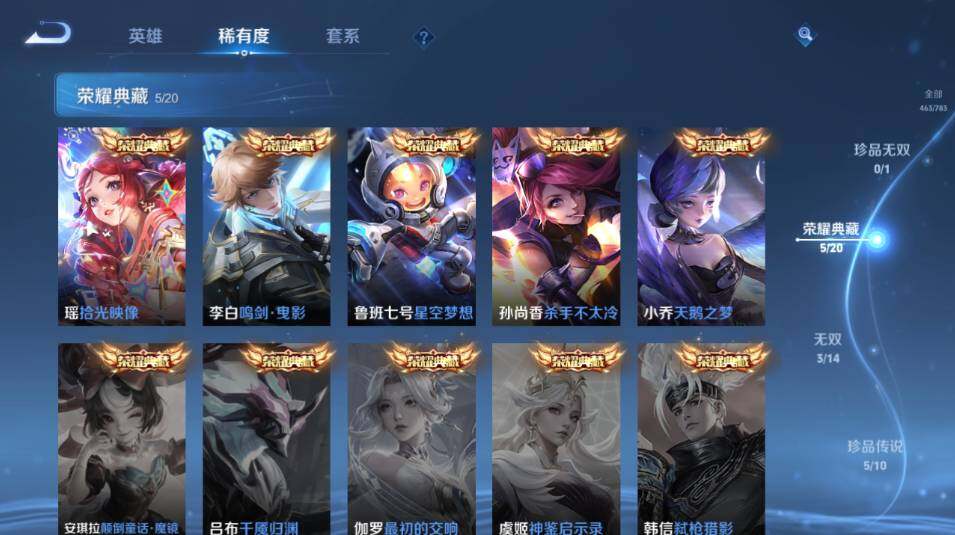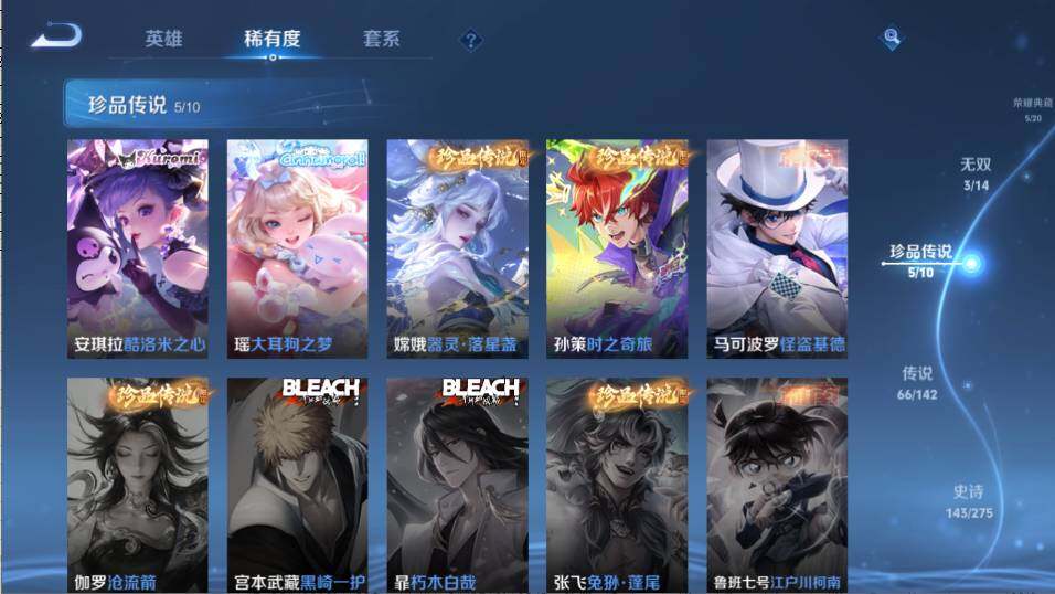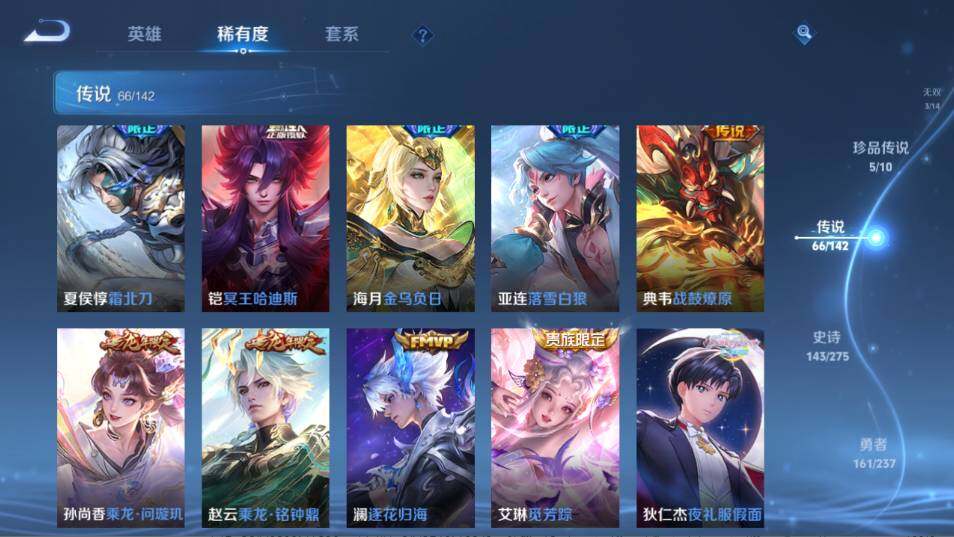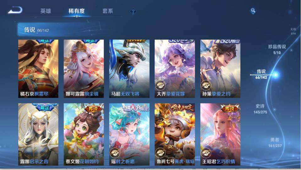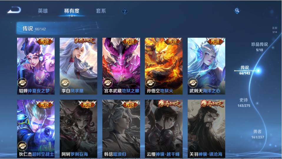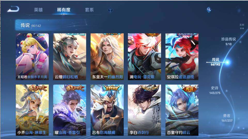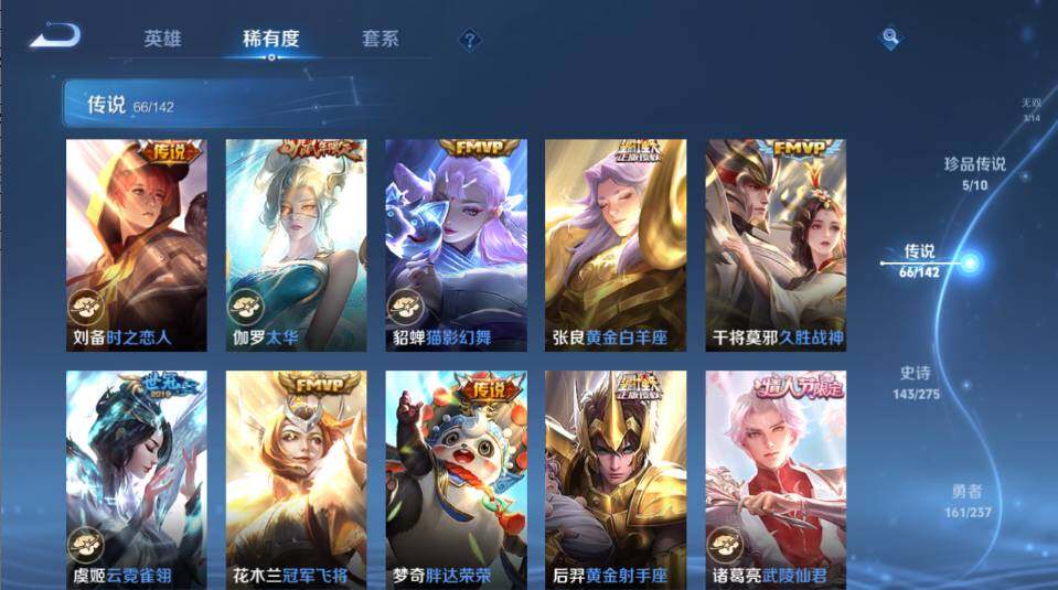 - PX_2083140-30 安卓QQ/至尊星耀/205皮肤/121英雄/2典藏/0珍品无双/0无双/1珍品传说/11传说/62史诗/6稀有英雄 【1 珍品传说】怪盗基德 马可波罗, 【2 典藏皮肤】鸣剑·曳影 李白,拾光映像 瑶, 【11 传说皮肤】无双飞将 马超,云鹰飞将 曜,诗剑行 李白,仲夏夜之梦 貂蝉,炽阳神光 镜,久胜战神 干将莫邪,超时空战士 狄仁杰,黄金白羊座 张良,愿照·九州拓 澜