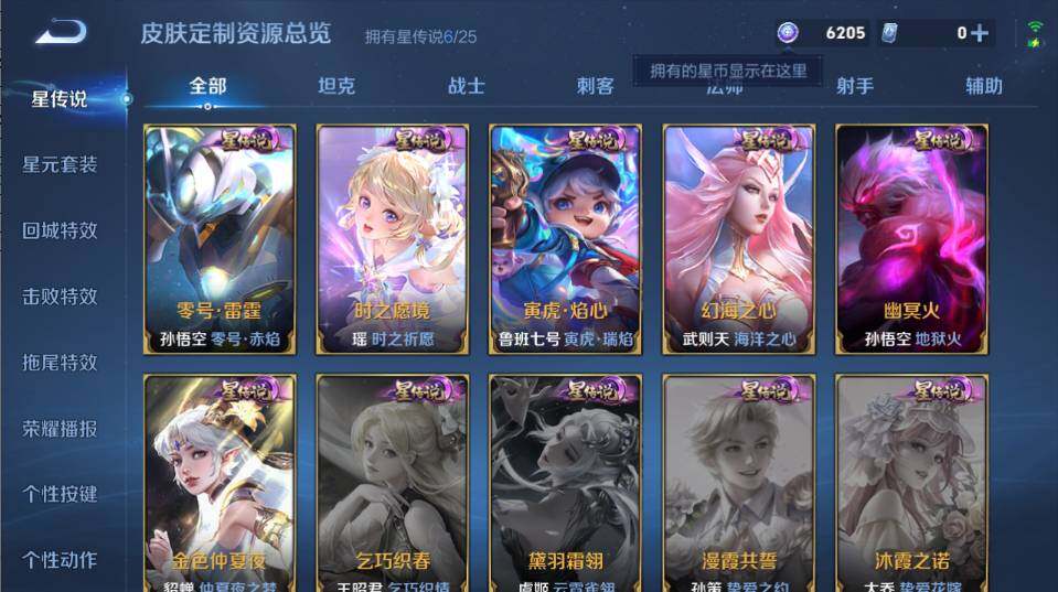 【传说皮肤】:后羿神树通天,司空震愿照山河定,女娲愿照千秋盛,妲己愿照众生和,澜愿照九州拓,蔡文姬愿照福禄聚,虞姬愿照岁时盈,云缨幻光神枪,王昭君映山客,桑启鸣野蒿,夏侯惇霜北刀,铠冥王哈迪斯,海月金乌负日,亚连落雪白狼,典韦战鼓燎原,孙尚香乘龙问璇玑,赵云乘龙铭钟鼎,澜逐花归海,艾琳觅芳踪,狄仁杰夜礼服假面,王昭君永恒水手月亮,云缨鹤归松栖,东皇太一灼幽烈阳,澜电玩雷克斯,安琪拉追逃游戏,小乔山海琳琅生,曜山海苍雷引,吕布怒海麟威,李白诗剑行,百里守约碎云,橘右京枫霜尽,娜可露露前尘镜,马超无双飞将,大乔挚爱花嫁,孙策挚爱之约,露娜启示之音,蔡文姬花朝如约,瑶时之祈愿,鲁班七号寅虎瑞焰,王昭君乞巧织情,西施游龙清影,曜李逍遥 ,小乔音你心动,李元芳飞鸢探春,公孙离祈雪灵祝,镜炽阳神光,虞姬启明星使,孙悟空零号赤焰,曜云鹰飞将,李信一念神魔,刘备时之恋人,伽罗太华,貂蝉猫影幻舞,张良黄金白羊座,干将莫邪久胜战神,虞姬云霓雀翎,花木兰冠军飞将,梦奇胖达荣荣,后羿黄金射手座,诸葛亮武陵仙君,貂蝉仲夏夜之梦,李白凤求凰,宫本武藏地狱之眼,孙悟空地狱火,武则天海洋之心,狄仁杰超时空战士