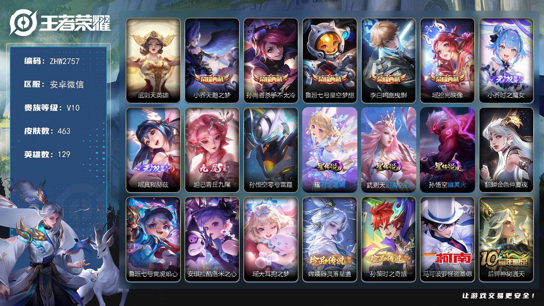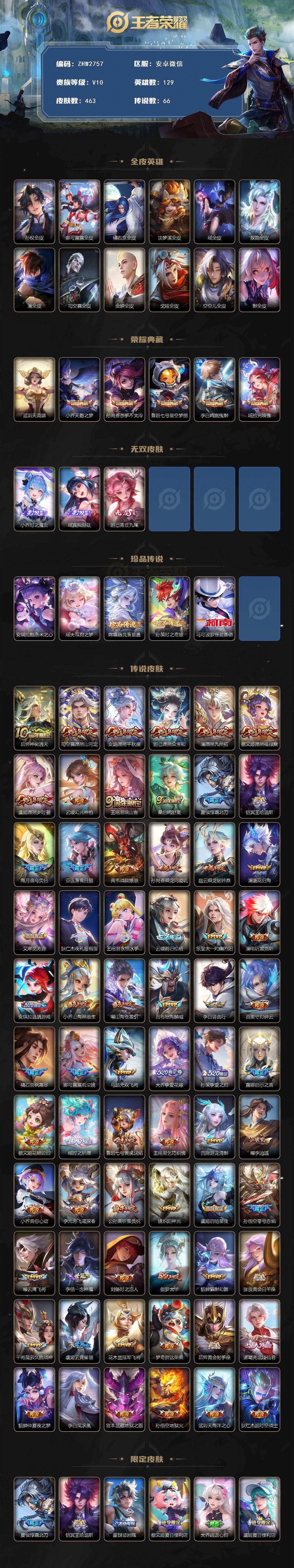 [17544159]女号!瑶全皮-3天幕-安卓WX-V10-最强王者段位-129英雄-463皮肤-5典藏皮肤-1典藏英雄-3无双-5珍品传说-6星传-66传说-142史诗