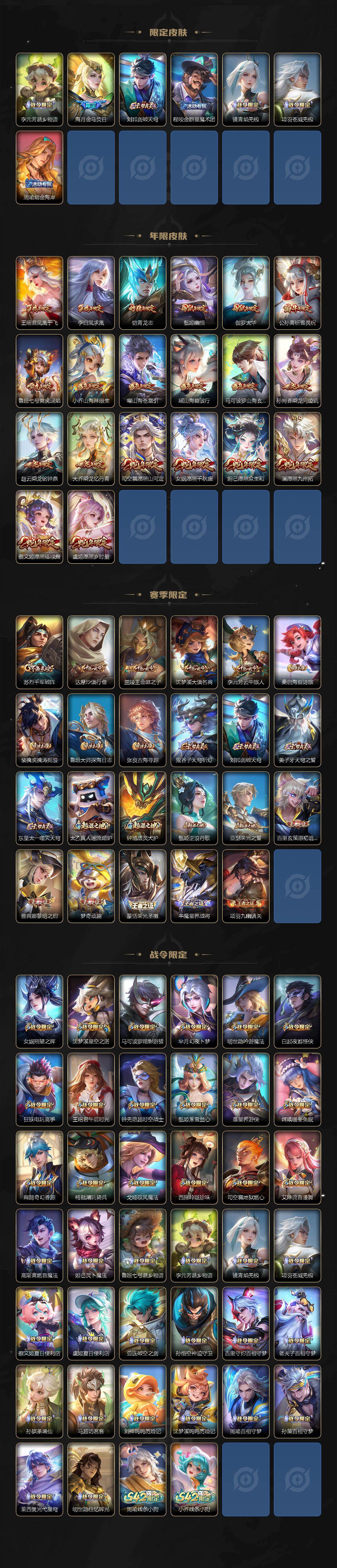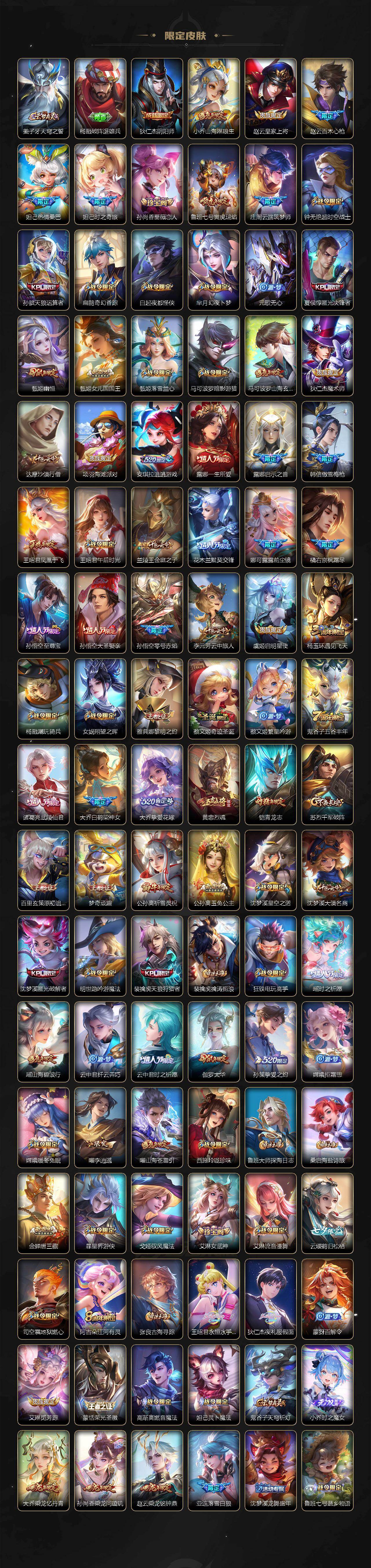 【限定皮肤】:夏侯惇霜北刀,铠冥王哈迪斯,蒙犽顽岩魄,蔡文姬夏日便利店,大乔绒语心约,虞姬夏日便利店,姜子牙天穹之誓,杨戬破阵退雄兵,狄仁杰阴阳师,小乔山海琳琅生,赵云皇家上将,赵云百木心枪,妲己热情桑巴,妲己时之奇旅,孙尚香蔷薇恋人,鲁班七号寅虎瑞焰,庄周云端筑梦师,钟无艳超时空战士,孙膑天狼运算者,扁鹊奇幻香踪,白起夜都怪侠,芈月幻夜卜梦,元歌无心,夏侯惇匿光决锋者,甄姬幽恒,甄姬女儿国国王,甄姬落雪兰心,马可波罗暗影游猎,马可波罗山海玄木吟,狄仁杰魔术
