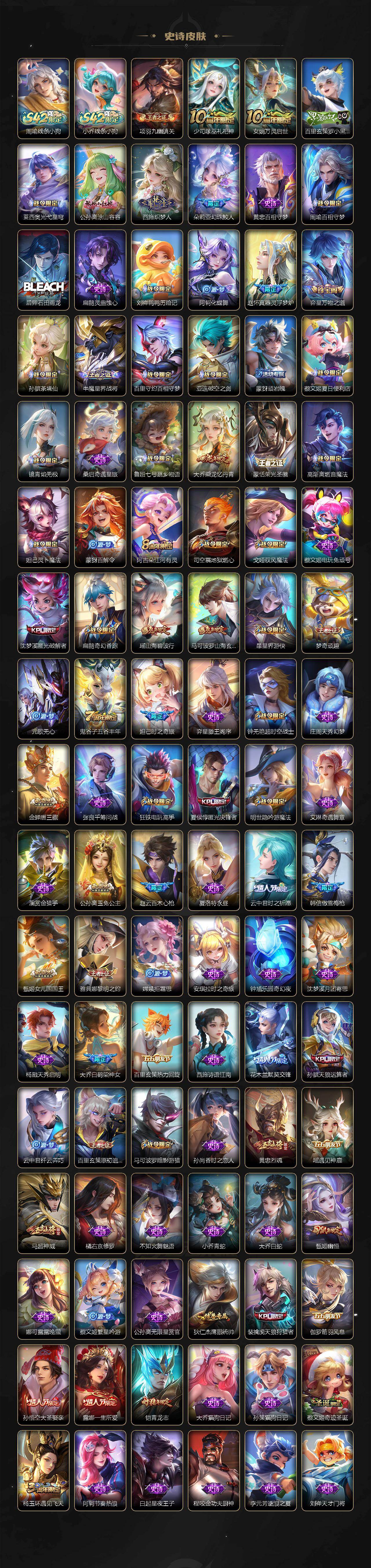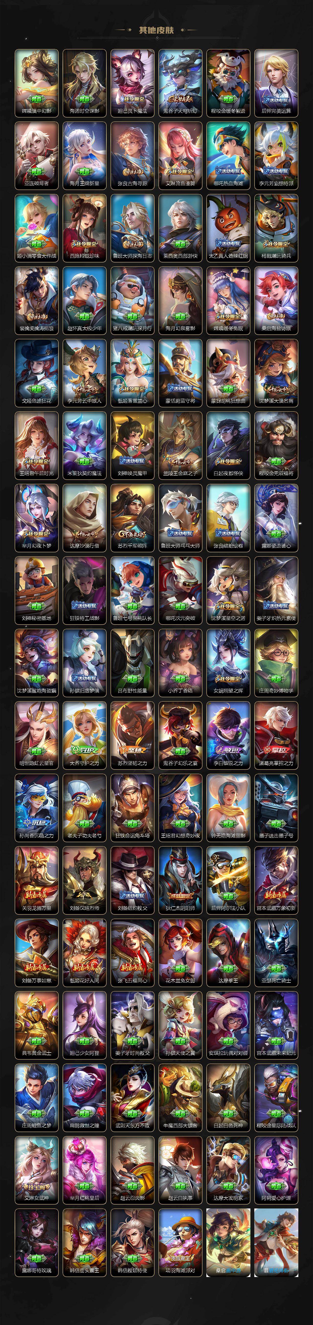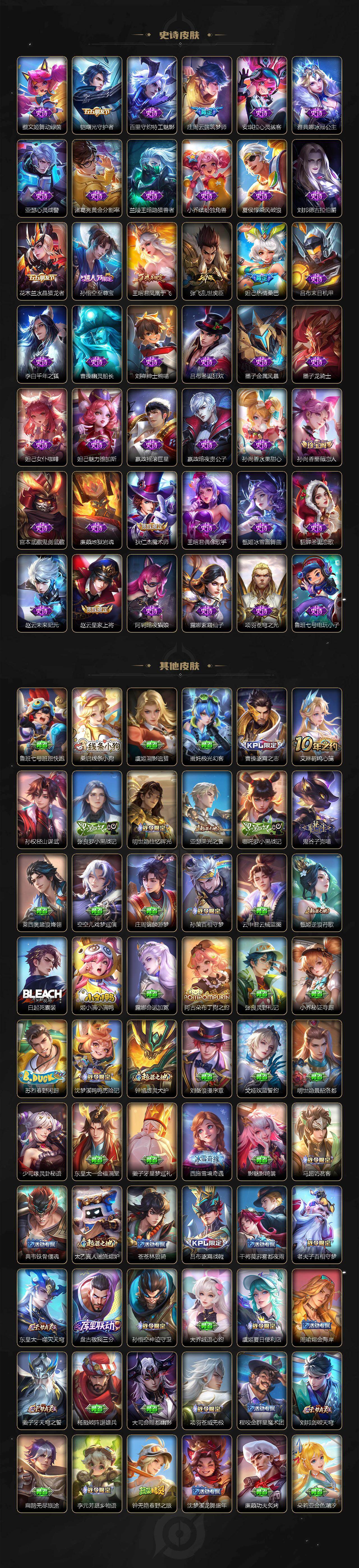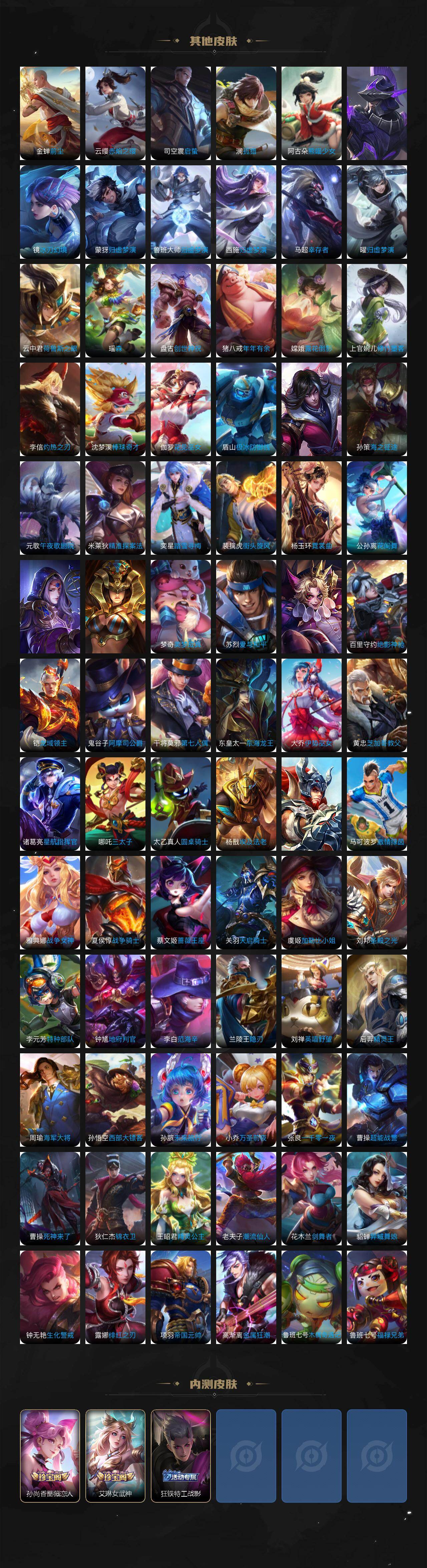 小乔青蛇,大乔白蛇,瑶遇见神鹿,娜可露露晚萤,伽罗箭羽风息,李元芳逐浪之夏,不知火舞魅语,公孙离无限星赏官,大乔猫狗日记,孙策猫狗日记,阿轲节奏热浪,露娜紫霞仙子,诸葛亮黄金分割率,王昭君偶像歌手,项羽苍穹之光,孙尚香时之恋人,阿轲暗夜猫娘,雅典娜冰冠公主,吕布末日机甲,鲁班七号电玩小子,橘右京修罗,墨子龙骑士,嬴政摇滚巨星,刘禅绅士熊喵,刘禅天才门将,白起星夜王子,安琪拉心灵骇客,安琪拉时之奇旅,程咬金功夫厨神,刘邦德古拉伯爵,兰陵王暗隐猎兽者,曹操幽灵船长,宫本武藏鬼剑武藏,亚瑟心灵战警,钟馗乐园奇幻夜,杨戬天秀·启明,蔡文姬舞动绿茵,廉颇地狱岩魂,西施诗语江南,小乔缤纷独角兽,夏侯惇乘风破浪,花木兰水晶猎龙者,铠曙光守护者,百里玄策热力回旋,墨子金属风暴,百里玄策原初追逐者,吕布圣诞狂欢,貂蝉圣诞恋歌,百里守约特工魅影,嬴政暗夜贵公子,嫦娥拒霜思,雅典娜黎明之约,李白千年之狐,夏洛特永昼,澜赏金猎手,艾琳奇遇舞章,张良千筹问战,庄周天秀·幻梦,弈星滕王阁序,沈梦溪匿光破解者,蔡文姬电玩·兔顽号,蒙犽百解令,高渐离燃音魔法,大乔乘龙·忆丹青,桑启奇遇星旅,赵怀真器灵·浮梦炉