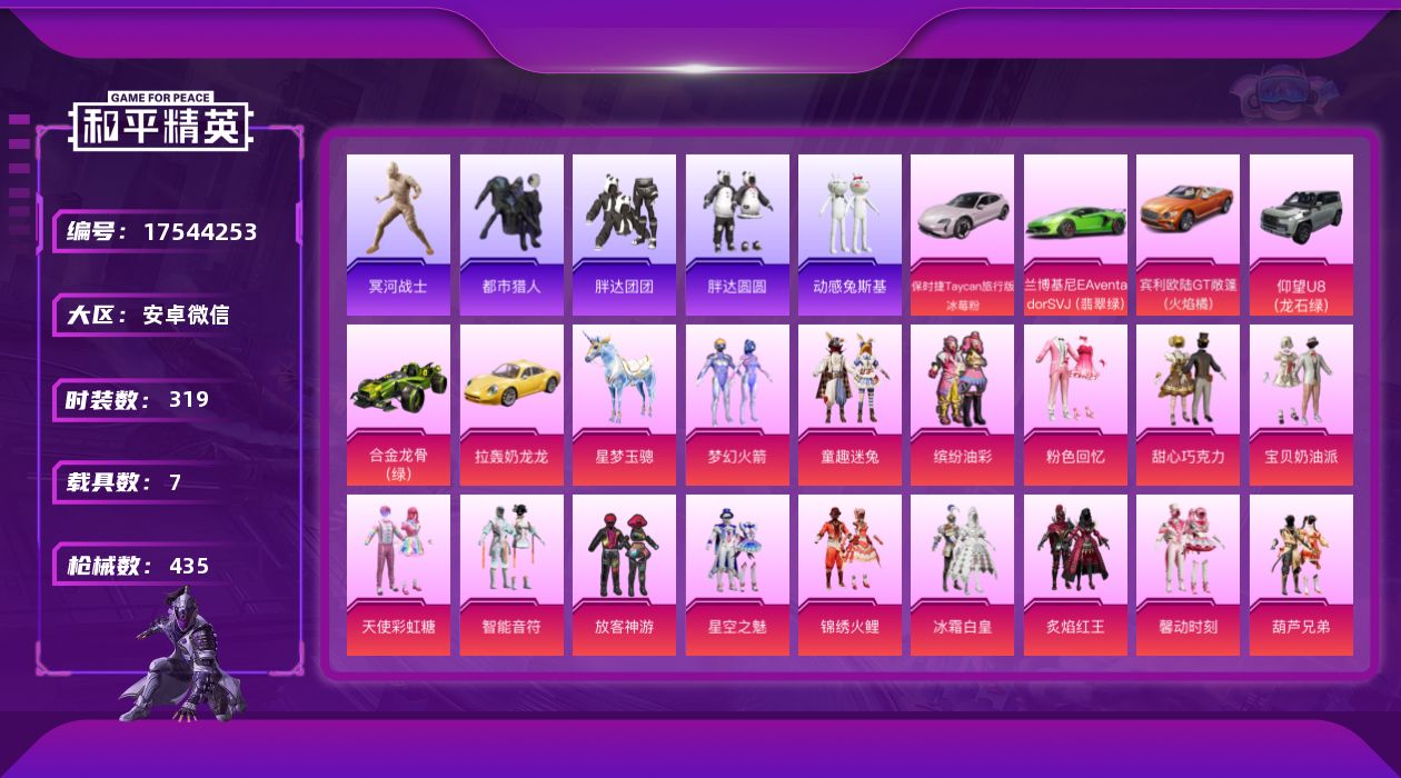 [17544253]木乃伊!小丑女!巧克力三姐妹!安卓 微信-38粉装-24特效枪-7载具-7粉色飞行器-175791热力值-20王牌印记-319套装-435枪皮