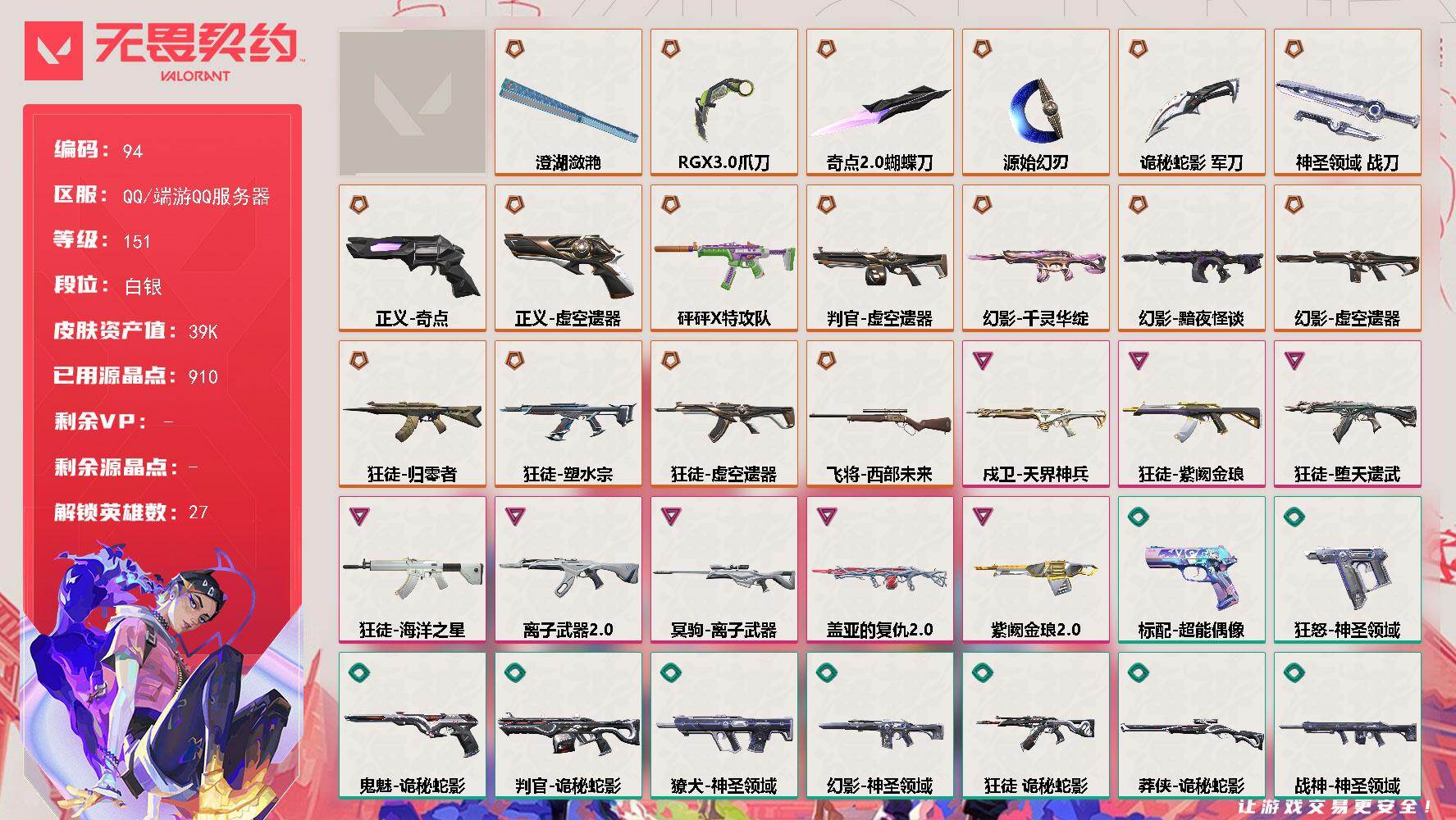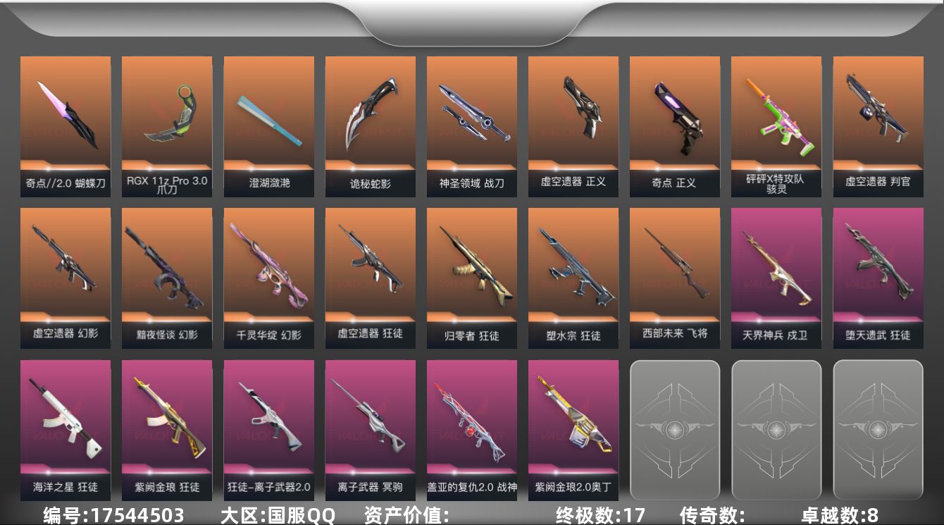 [17544503]【94】【套装】:虚空遗器套装 【英雄】:幻棱,炼狱,维斯,暮蝶,钛狐,壹决,铁臂,捷风,雷兹,幽影,不死鸟,贤者,猎枭,蝰蛇,零,芮娜,奇乐,尚勃勒,霓虹,斯凯,夜露,星礈,K/O,海神,盖可,黑梦,钢锁 【近战武器】:近战武器-奇点//2.0 蝴蝶刀,近战武器-RGX 11z Pro//3.0 爪刀,近战武器-澄湖潋滟,近战武器-源始幻刃,近战武器-诡秘蛇影 军刀,近战武器-神圣领域 战刀 【狂徒】:狂徒-归零者,狂徒-塑水宗,狂徒-虚空遗器,狂徒-堕天遗武,狂徒-海洋之星,狂徒-紫阙金琅,狂徒-离子武器//2.0,狂徒-诡秘蛇影 【幻影】:幻影-黯夜怪谈,幻影-千灵华绽,幻影-虚空遗器,幻影-神圣领域,幻影-末日之翼 【戍卫】:戍卫-天界神兵,戍卫-月球哨兵,戍卫-折光棱晶 【獠犬】:獠犬-神圣领域 【冥驹】:冥驹-离子武器,冥驹-星云暗涌 【飞将】:飞将-西部未来,飞将-末日之翼 【莽侠】:莽侠-诡秘蛇影,莽侠-月球哨兵 【战神】:战神-盖亚的复仇//2.0,战神-神圣领域 【奥丁】:奥丁-紫阙金琅//2.0,奥丁-末日之翼 【判官】:判官-虚空遗器,判官-诡秘蛇影 【雄鹿】:雄鹿-月球哨兵 【骇灵】:骇灵-砰砰X特攻队,骇灵-星云暗涌 【蜂刺】:蜂刺-星云暗涌,蜂刺-折光棱晶 【标配】:标配-超能偶像,标配-折光棱晶 【正义】:正义-奇点,正义-虚空遗器,正义-纳米打击,正义-月球哨兵 【鬼魅】:鬼魅-诡秘蛇影,鬼魅-星云暗涌 【狂怒】:狂怒-神圣领域 【短炮】:短炮-末日之翼 【卡面】:终章:激斗汉堡 卡面,进入射程 卡面,《双城之战》拥抱 卡面,精灵大战 卡面,欢迎来到底城 卡面,南瓜盛典 卡面,修车达人 卡面,正义的化身 卡面,铁之华 卡面,时间到 卡面,最高舞台 卡面,声感陷阱设计图 卡面,梦幻奶茶 卡面,源能反应 卡面,零点嗅探设计图 卡面,无畏契约GO!第一卷:芮娜 卡面,清除名单 卡面,无畏契约GO!第一卷:零 卡面,龍记 卡面,《双城之战》金克丝 卡面,逆向独行 卡面 ,暗枪 卡面,"Luie" 卡面,铁臂设计图 卡面,代号红色 卡面,冰淇淋店 卡面,新兵报到 卡面,V契约 卡面,无畏契约 卡面 【喷漆】:嗨宝南瓜灯 喷漆,嘭! 喷漆,都算到了 喷漆,控场勿近 喷漆,小丑猫 喷漆,熊抱 喷漆,超级粉丝 喷漆,捷风差距 喷漆,惊声尖叫 喷漆